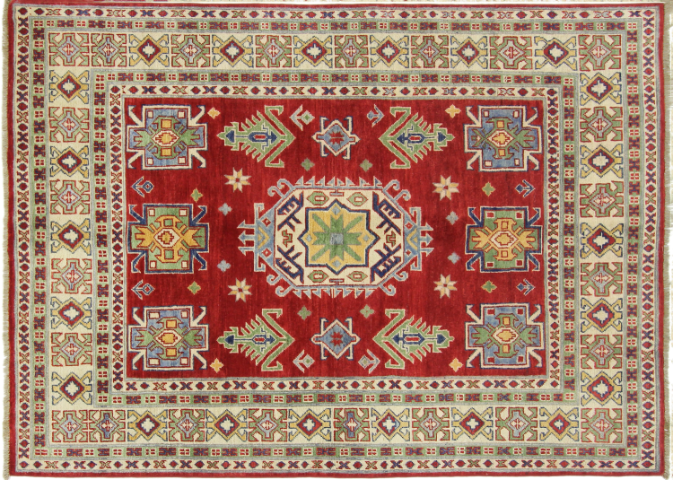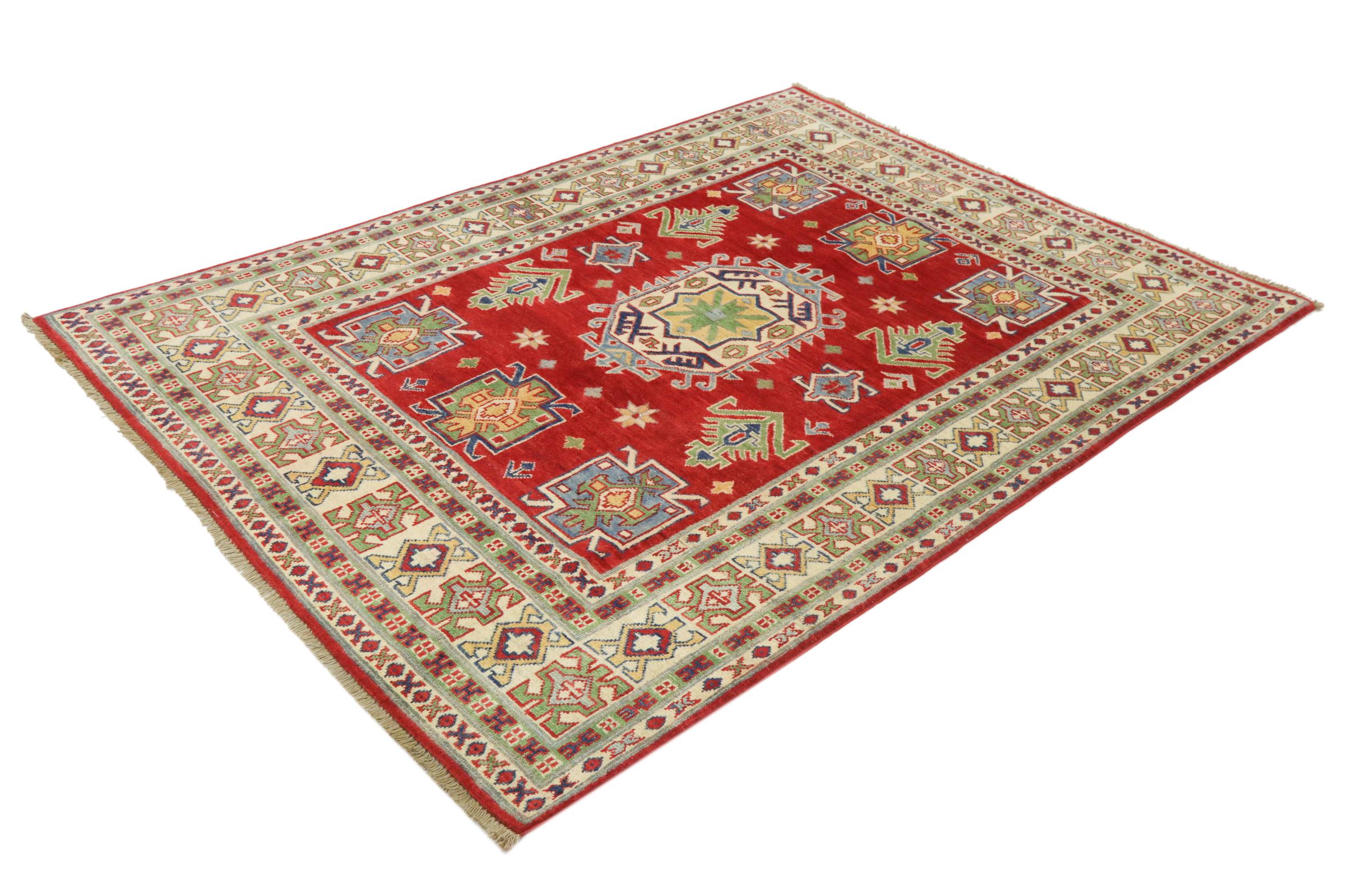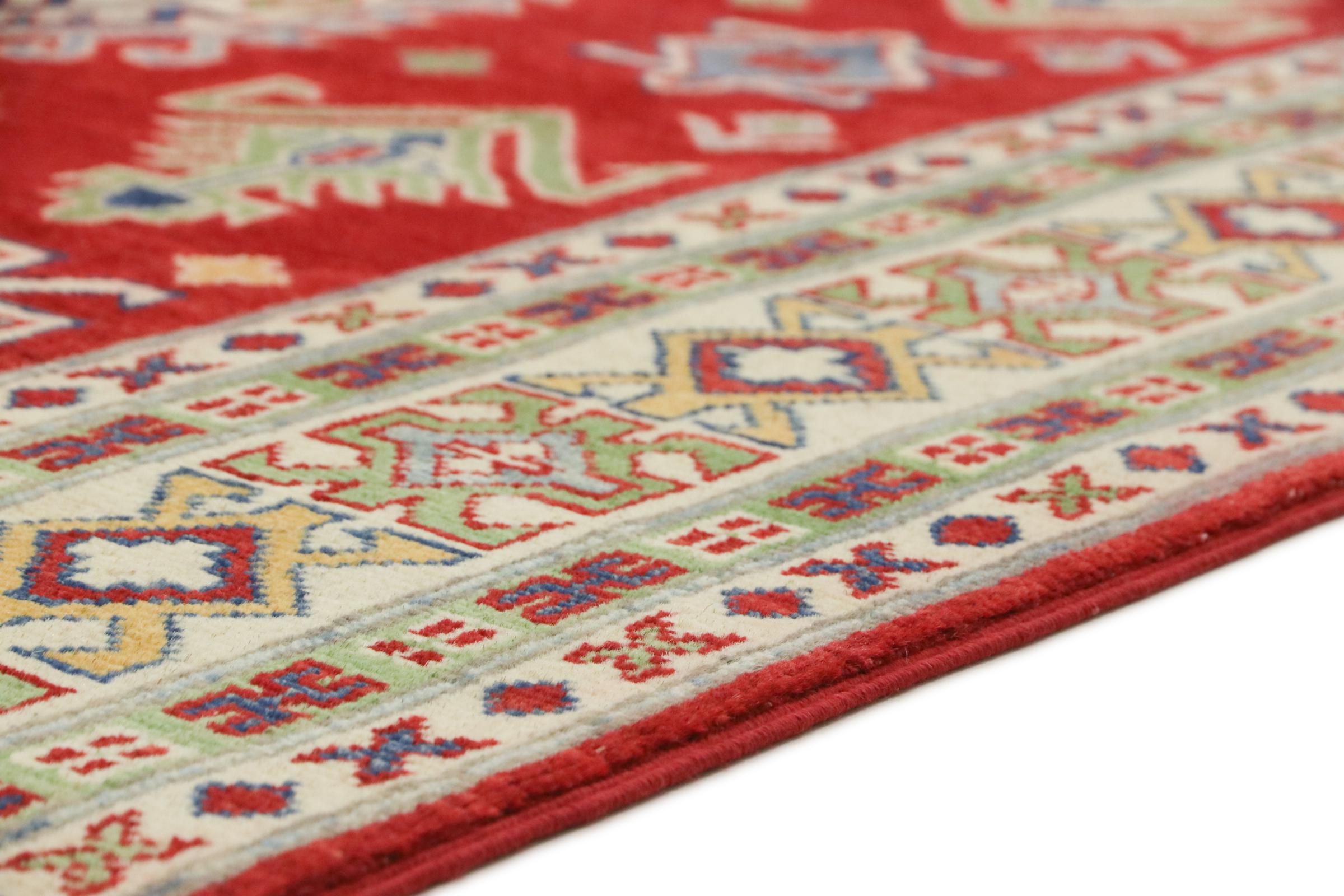 This Kazak rug has been crafted by hand along old tradition. The region of origin is famous for its mountains and the handmade rugs with beautiful shades of red, blue and green. The colors are slightly lightened on this rug, like with most Kazak rugs.