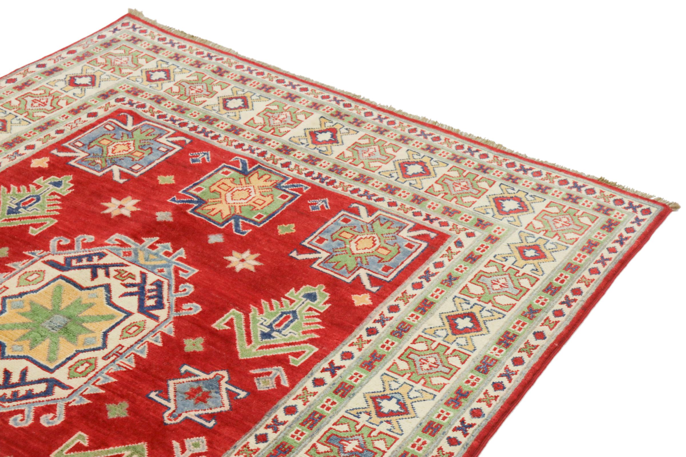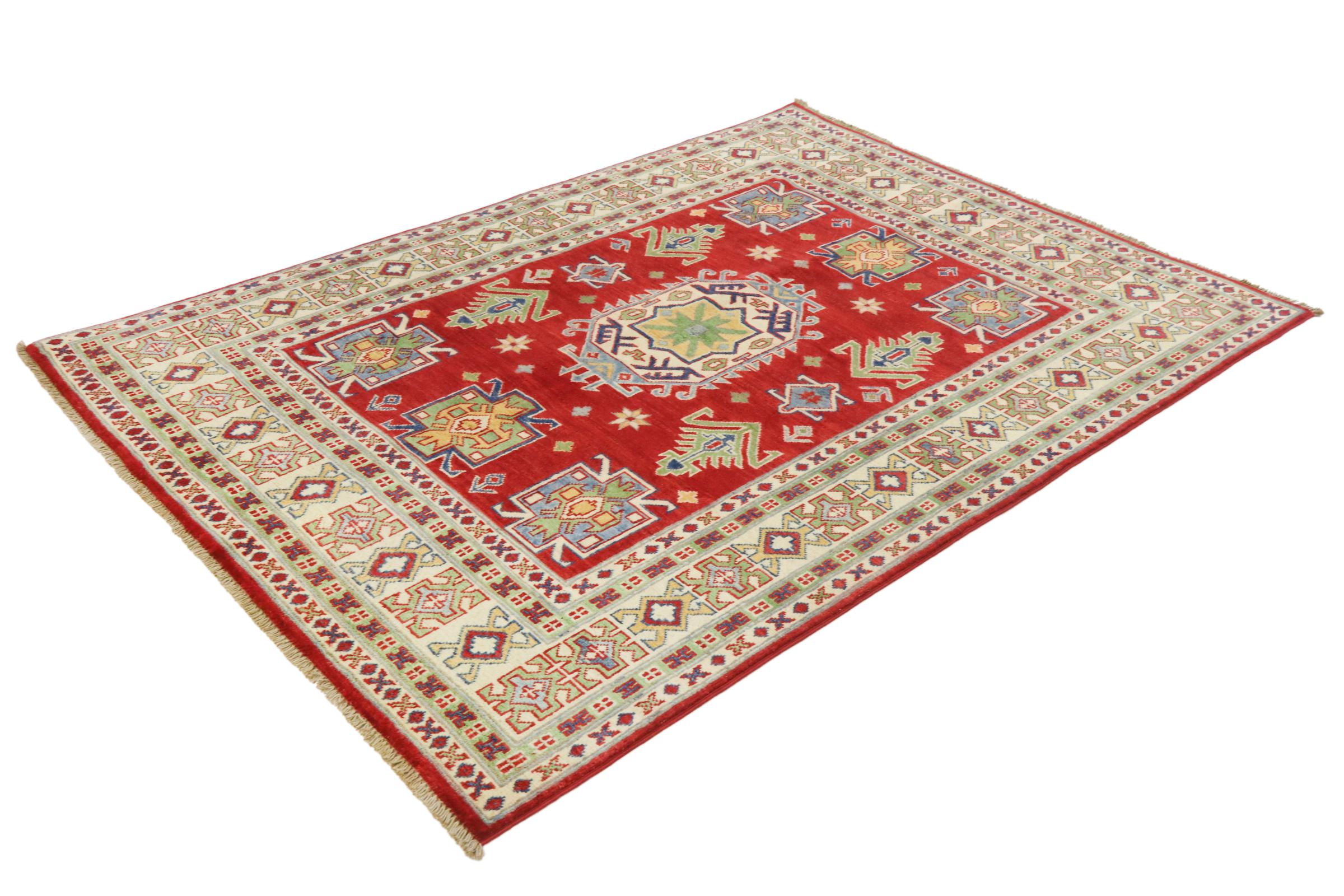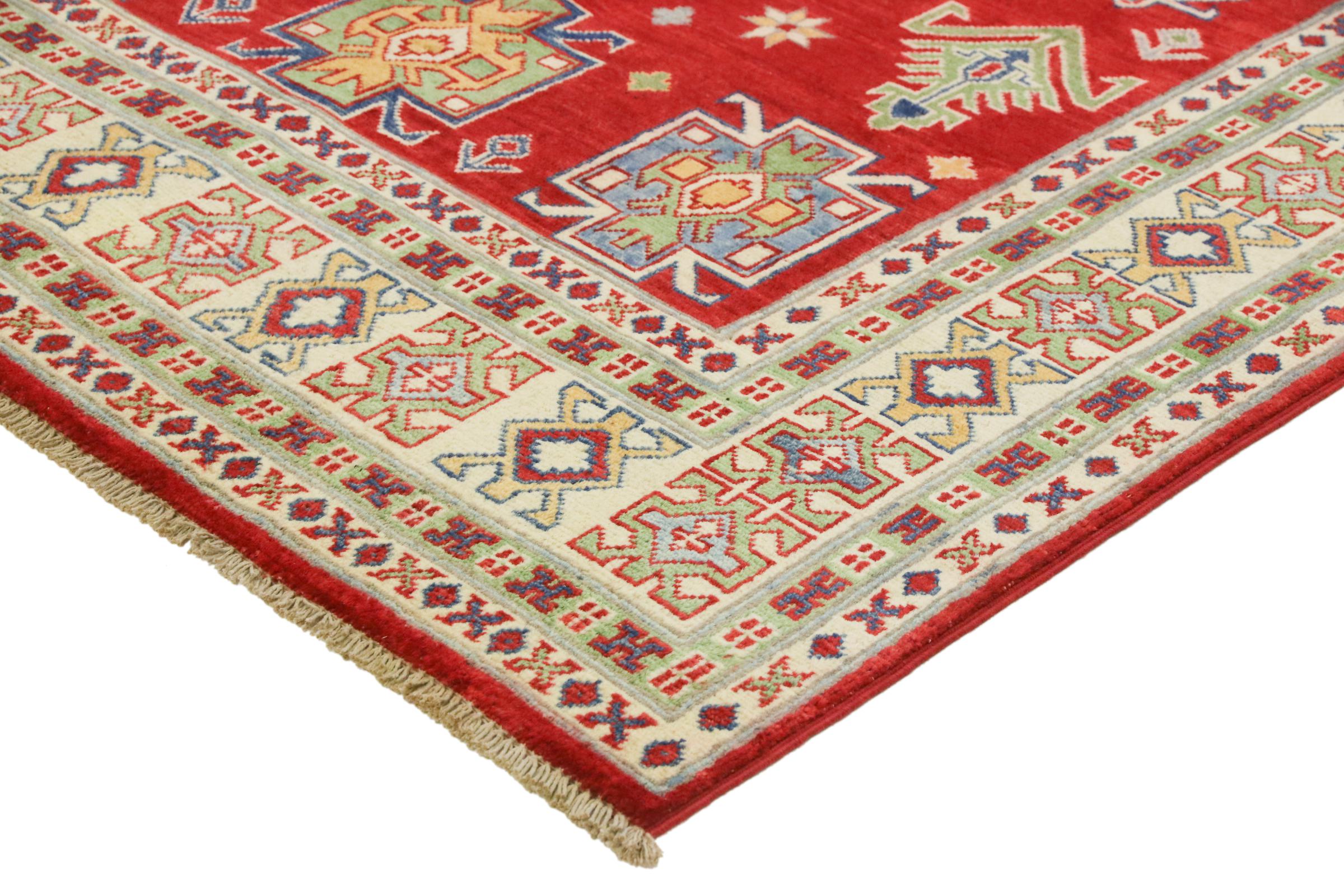 This Kazak rug has been crafted by hand along old tradition. The region of origin is famous for its mountains and the handmade rugs with beautiful shades of red, blue and green. The colors are slightly lightened on this rug, like with most Kazak rugs.