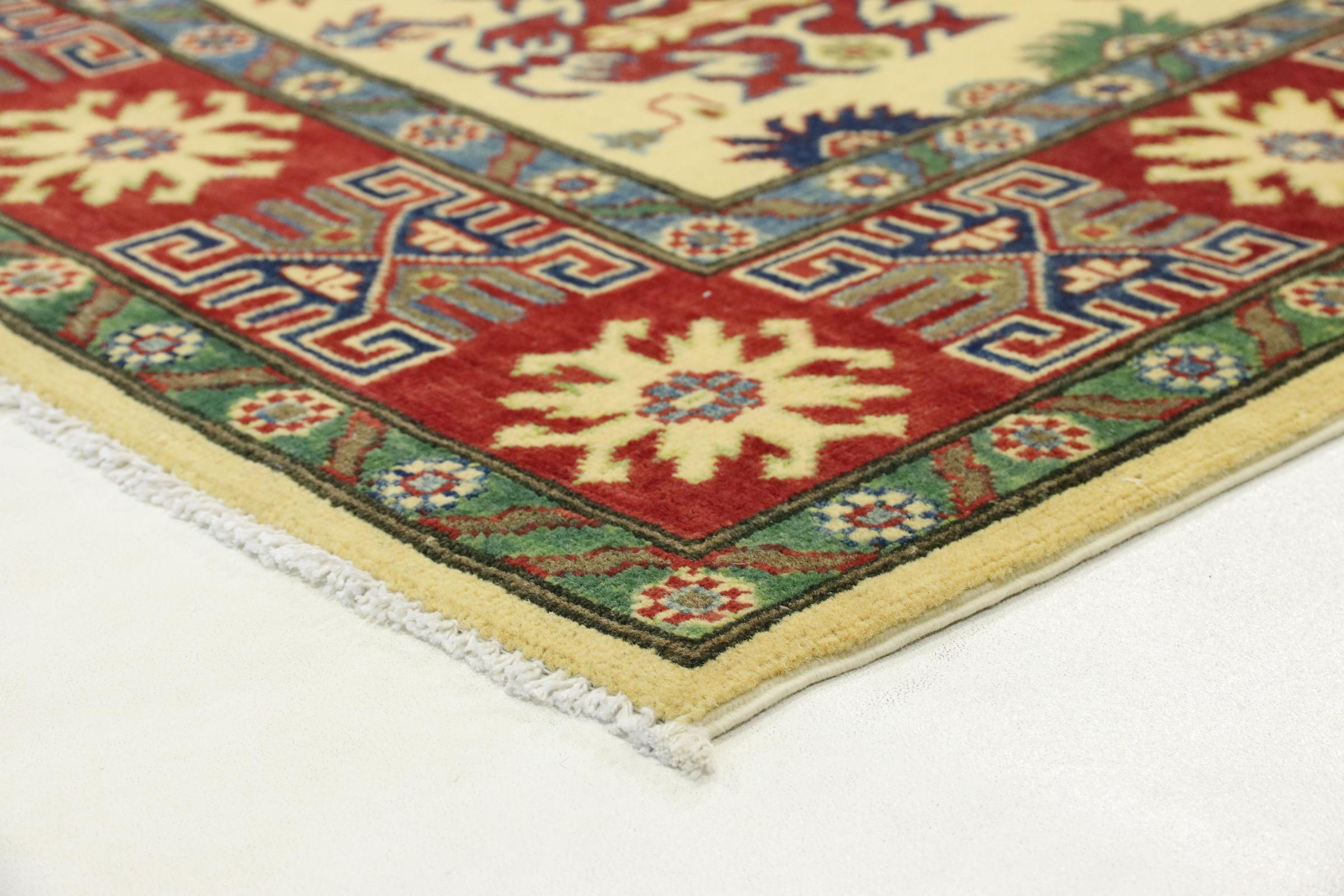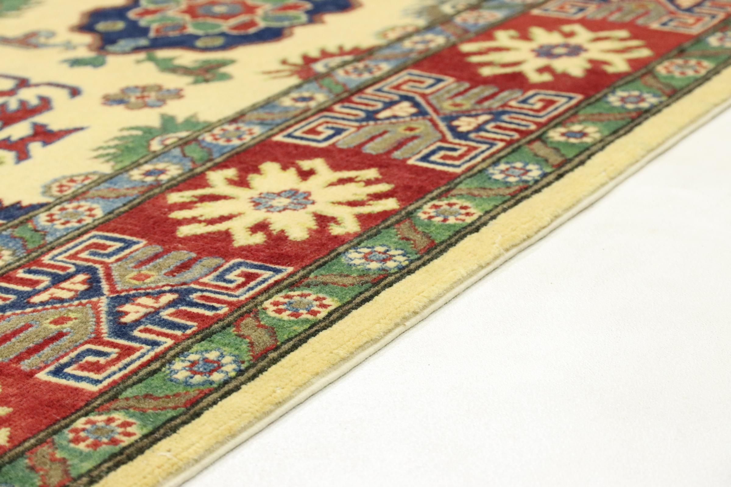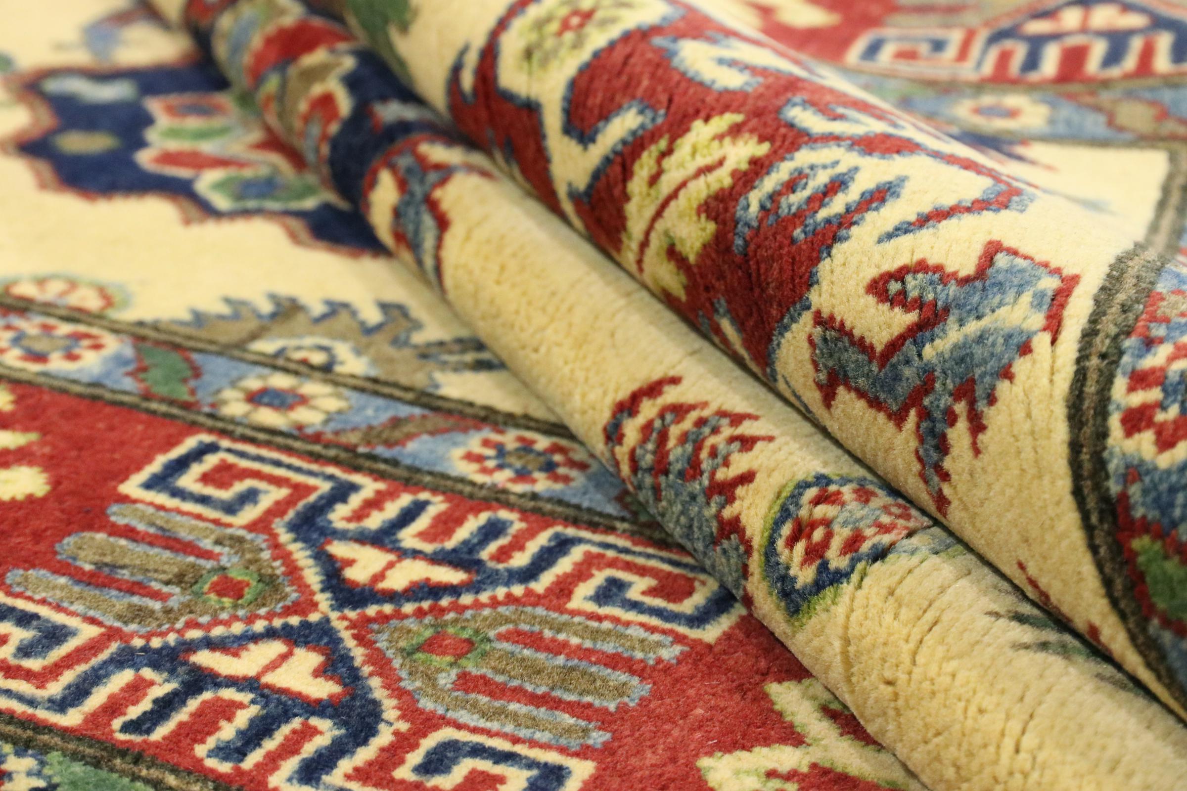This Kazak rug has been crafted by hand along old tradition. The region of origin is famous for its mountains and the handmade rugs with beautiful shades of red, blue and green. The colors are slightly lightened on this rug, like with most Kazak rugs.