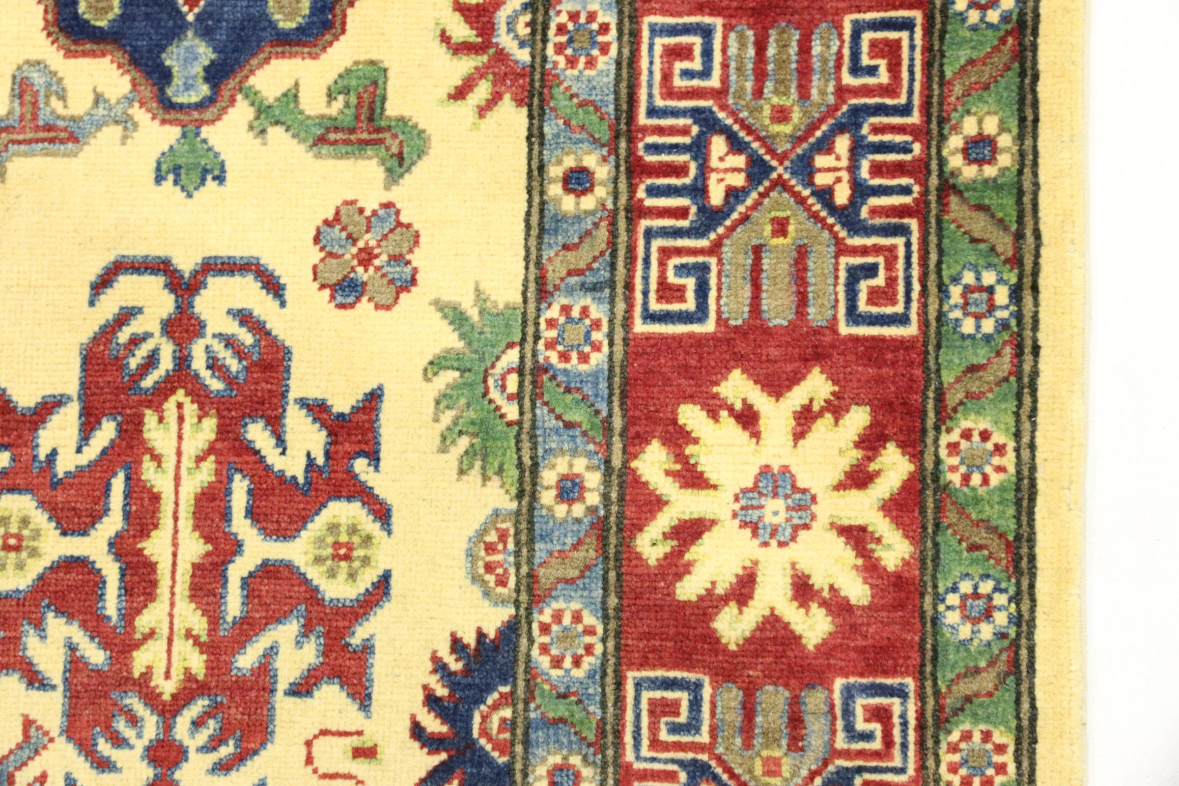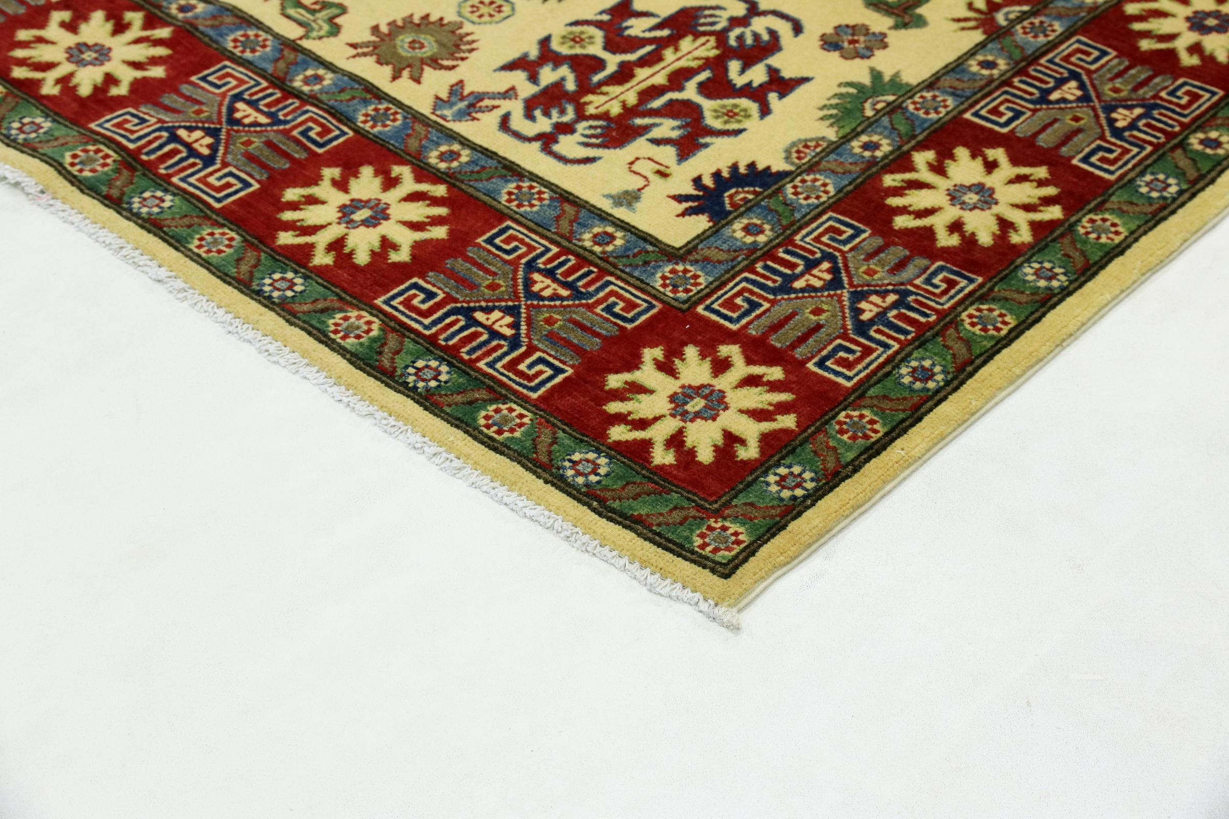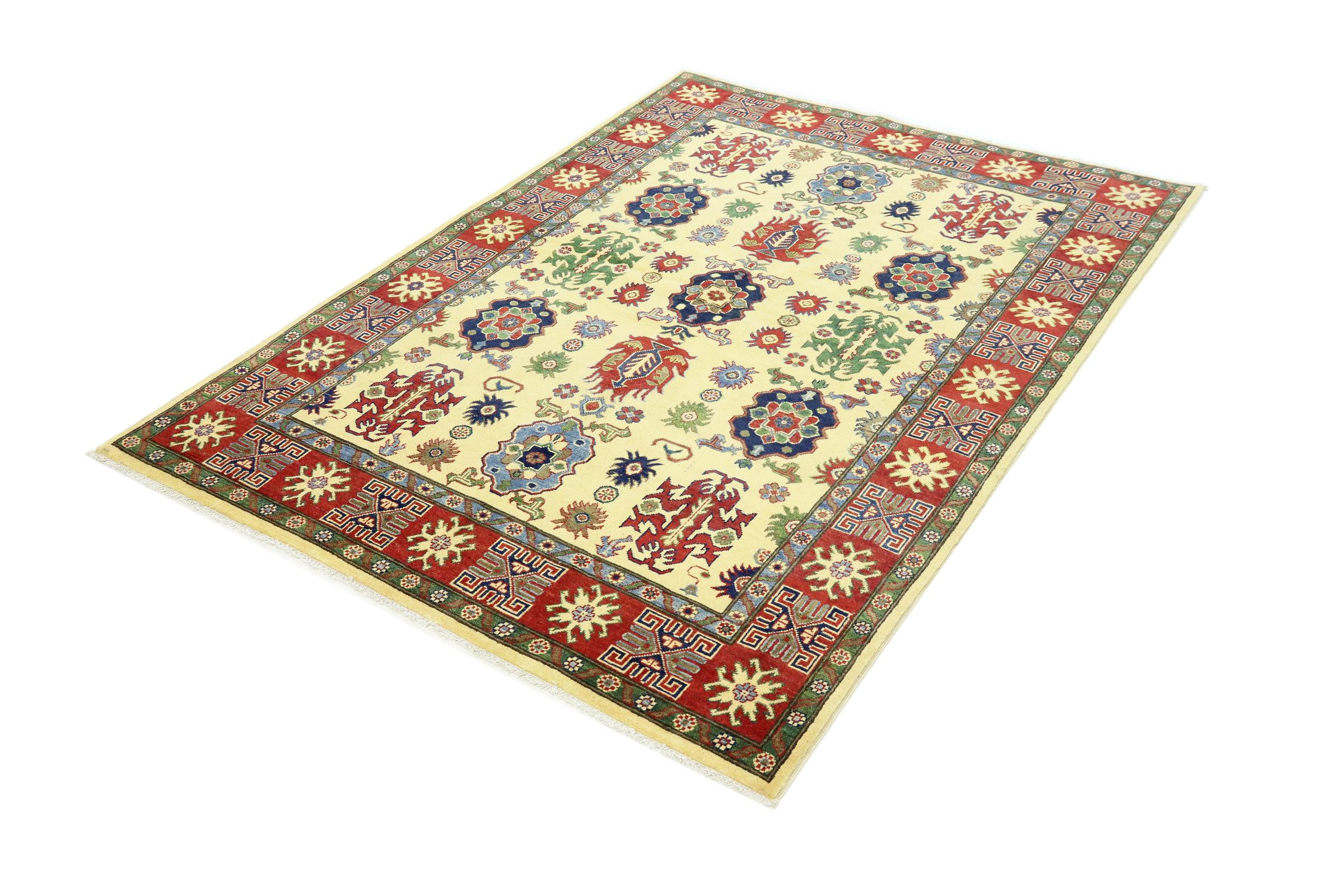 This Kazak rug has been crafted by hand along old tradition. The region of origin is famous for its mountains and the handmade rugs with beautiful shades of red, blue and green. The colors are slightly lightened on this rug, like with most Kazak rugs.