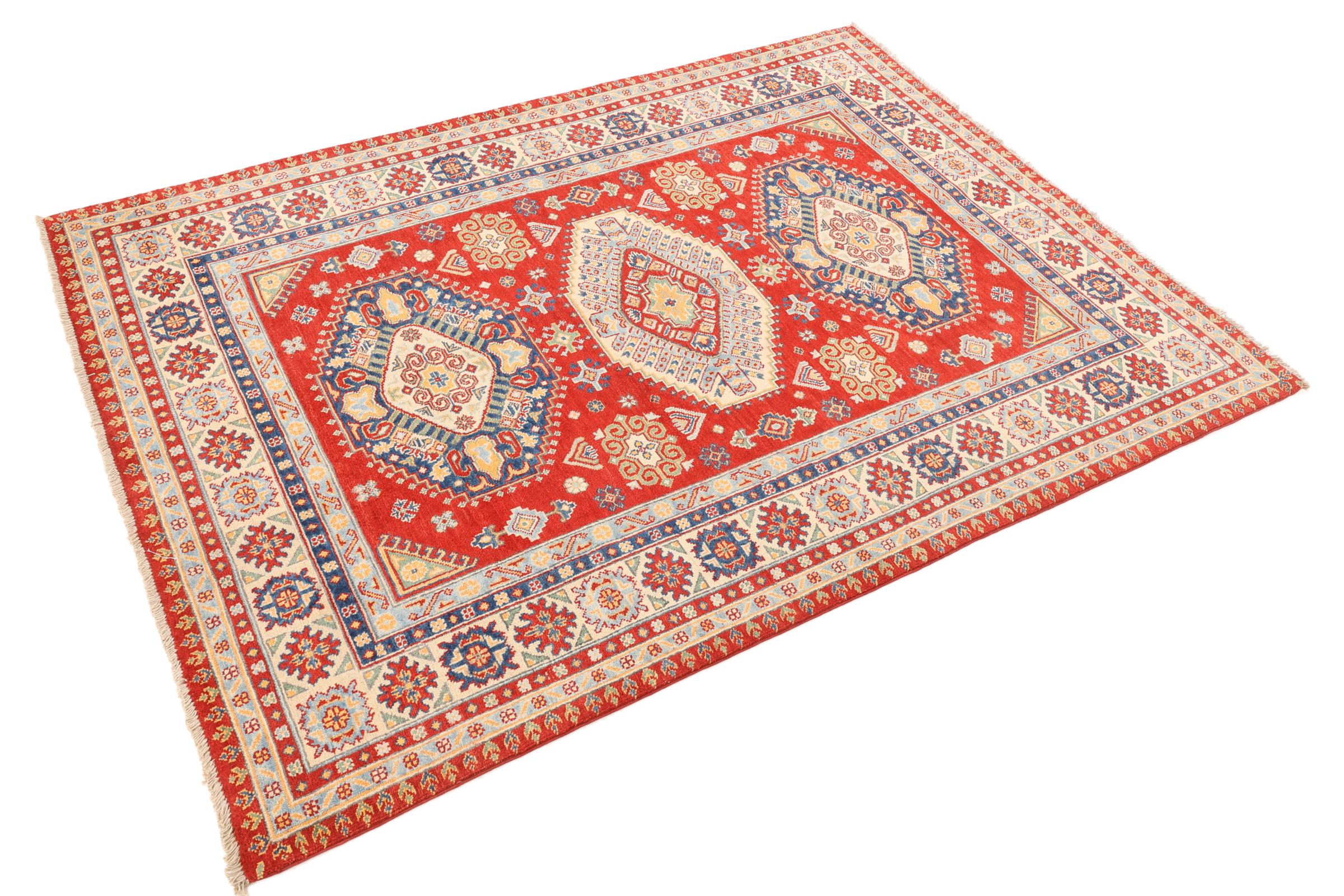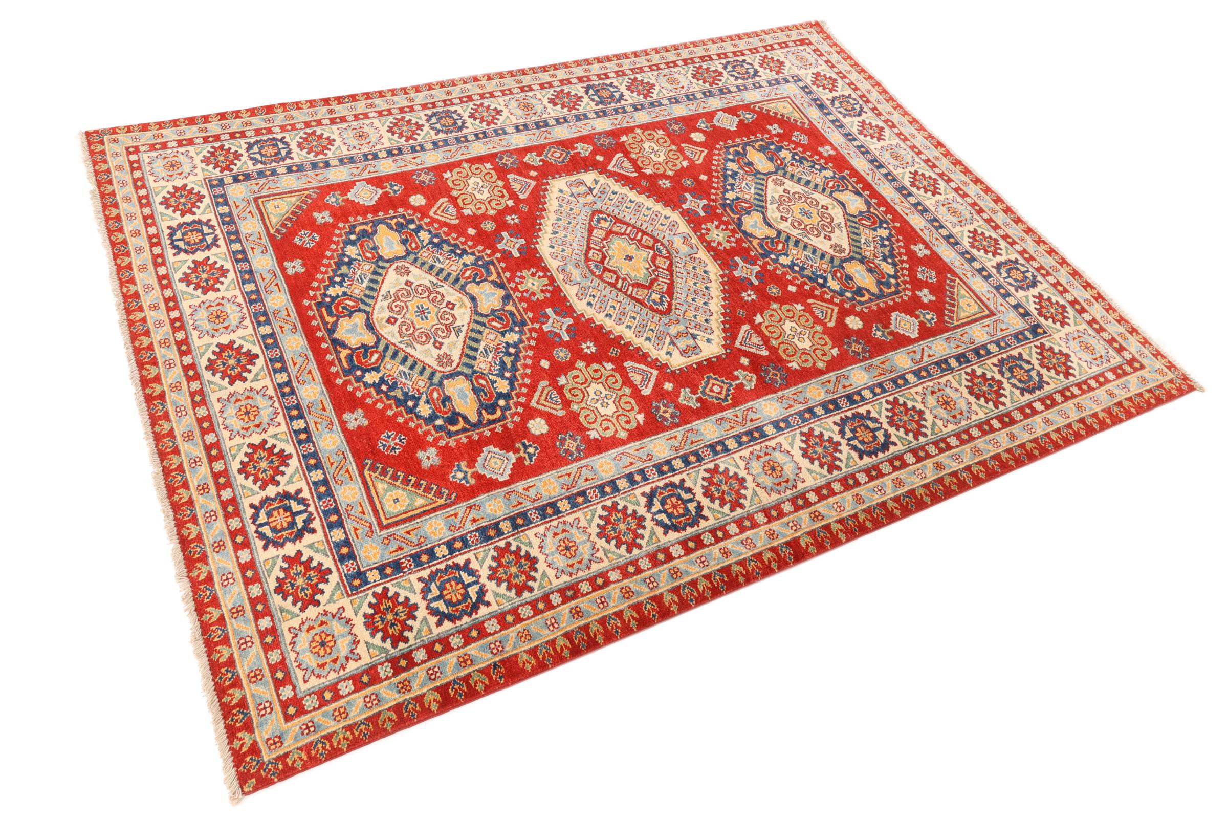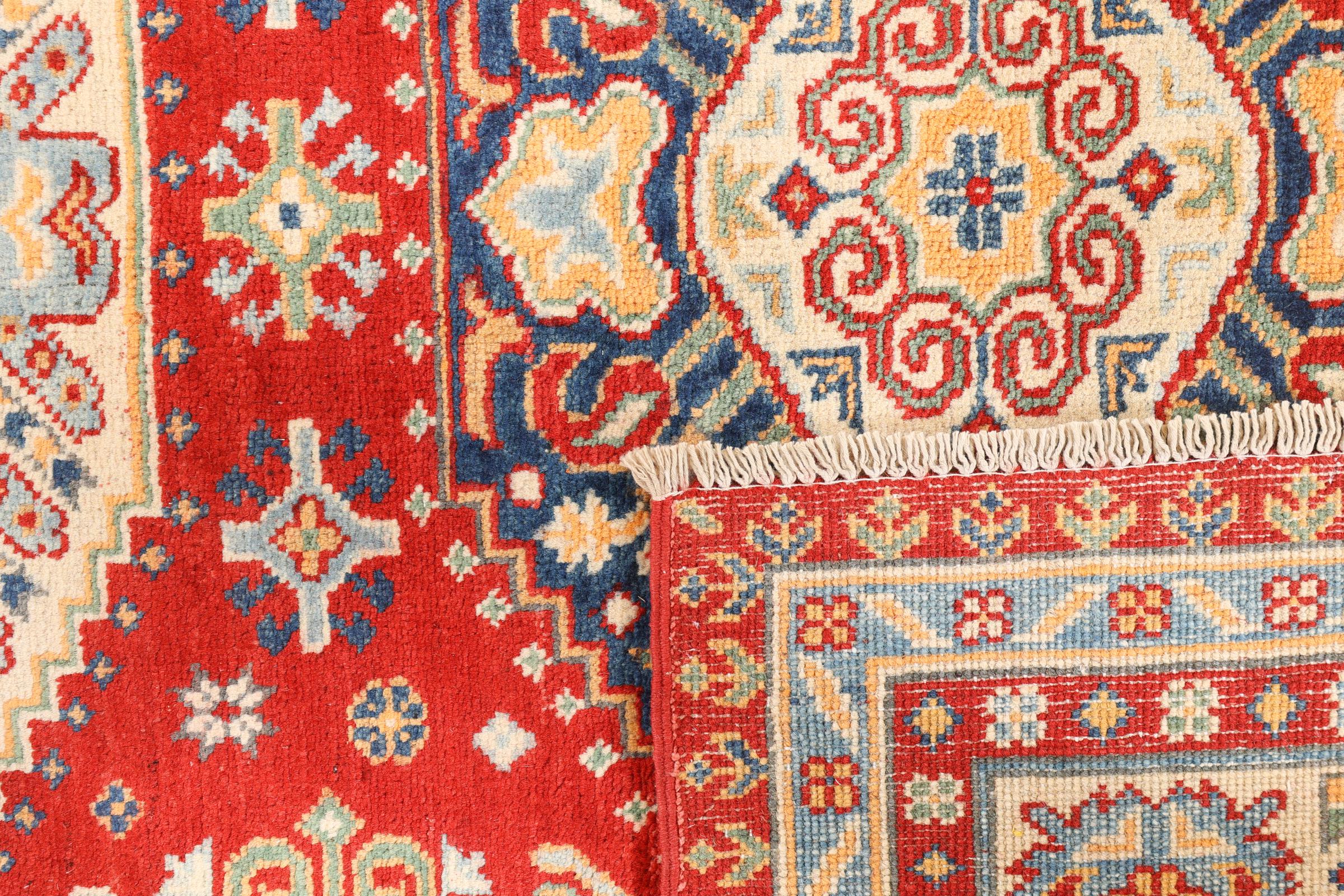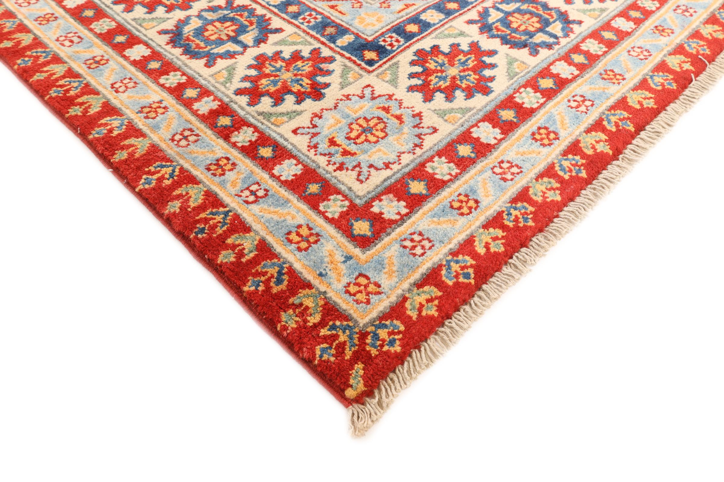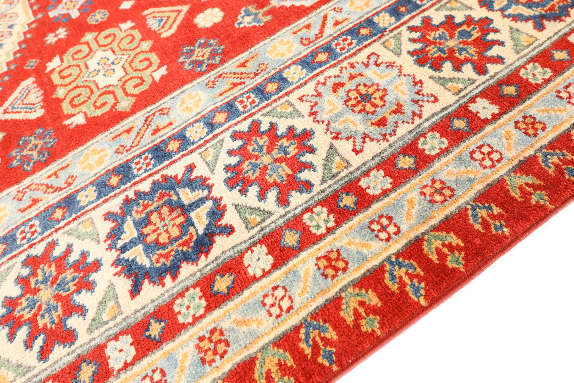 This Kazak rug has been crafted by hand along old tradition. The region of origin is famous for its mountains and the handmade rugs with beautiful shades of red, blue and green. The colors are slightly lightened on this rug, like with most Kazak rugs.