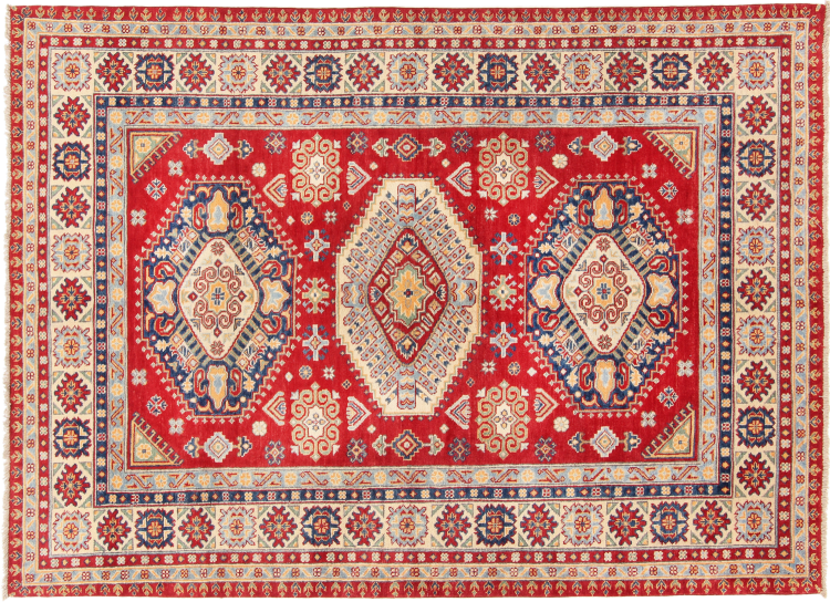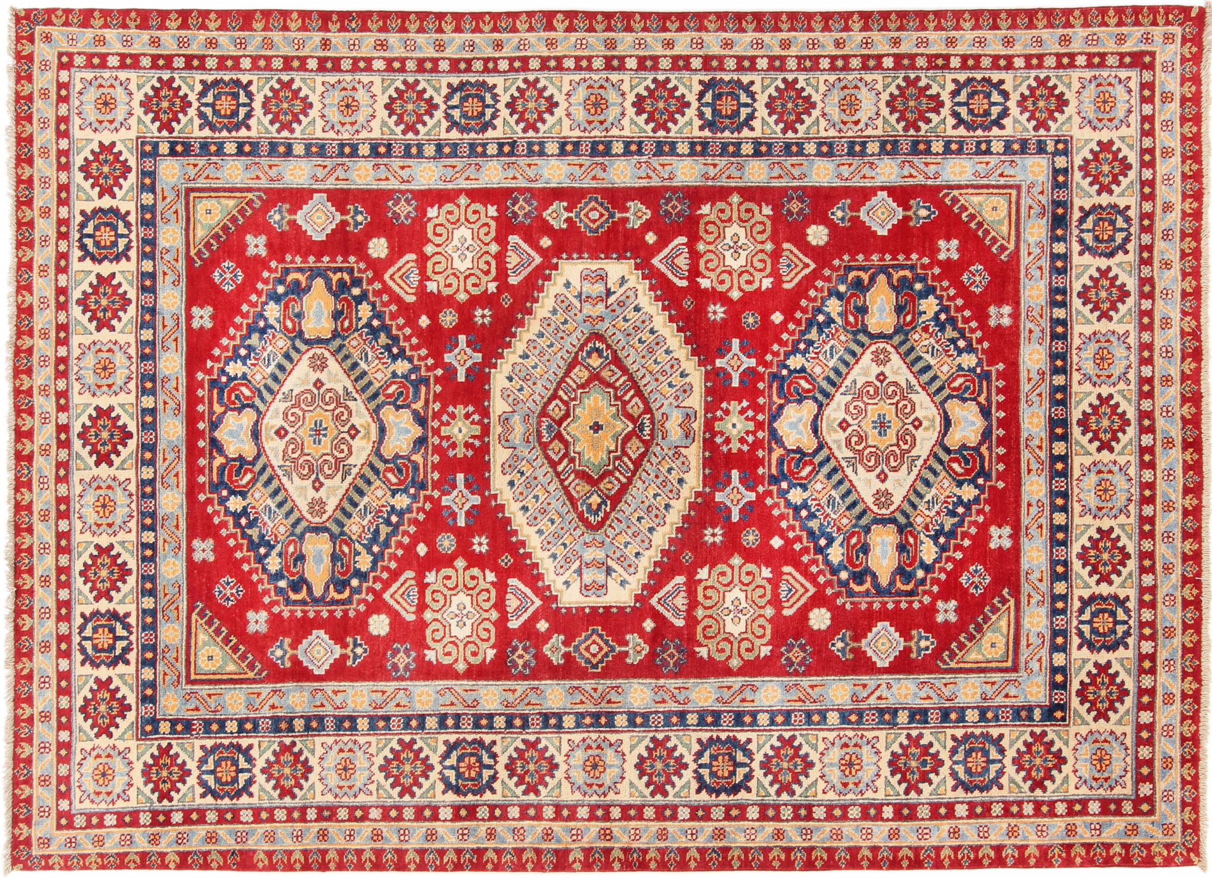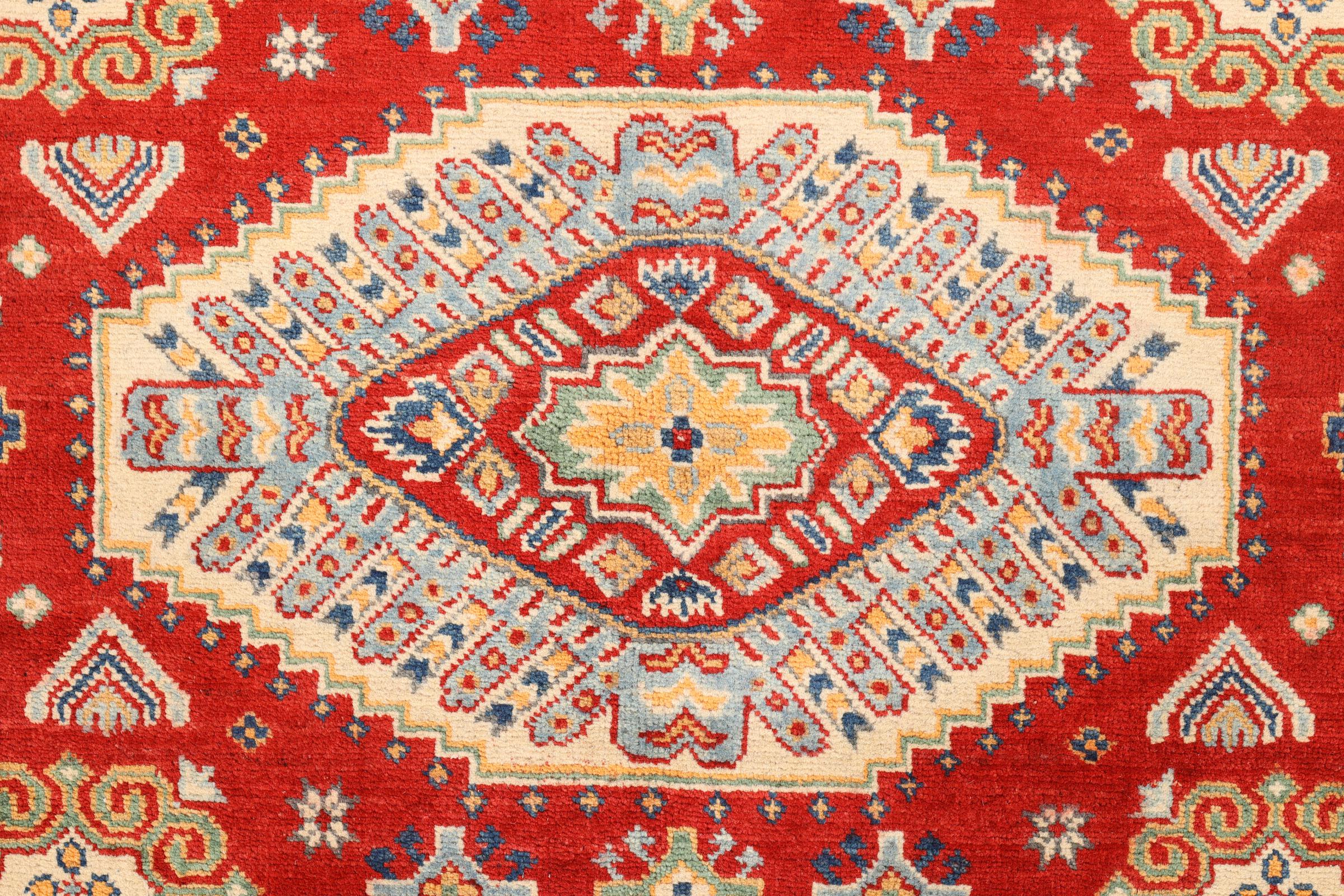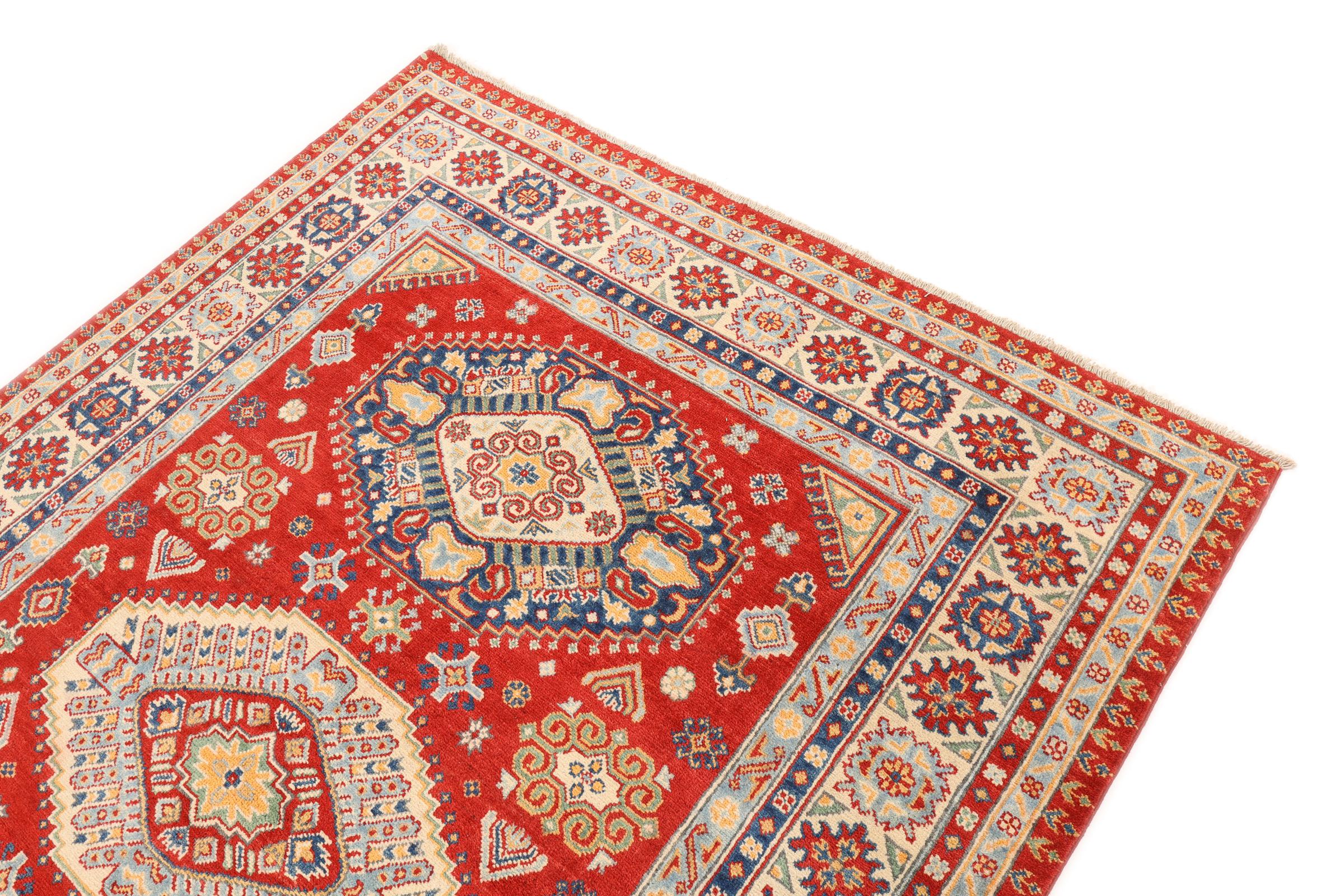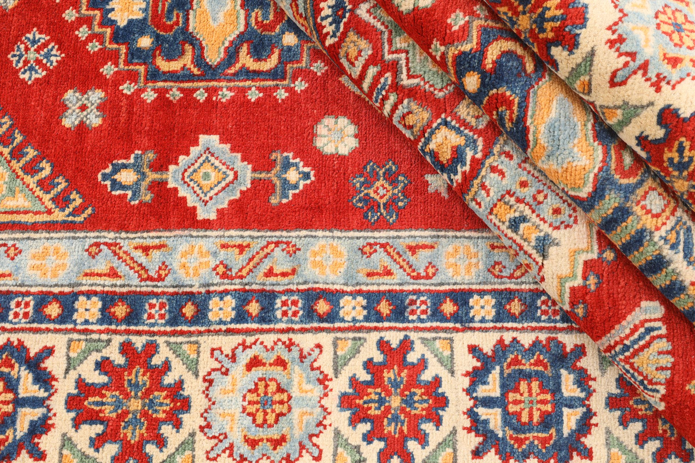 This Kazak rug has been crafted by hand along old tradition. The region of origin is famous for its mountains and the handmade rugs with beautiful shades of red, blue and green. The colors are slightly lightened on this rug, like with most Kazak rugs.