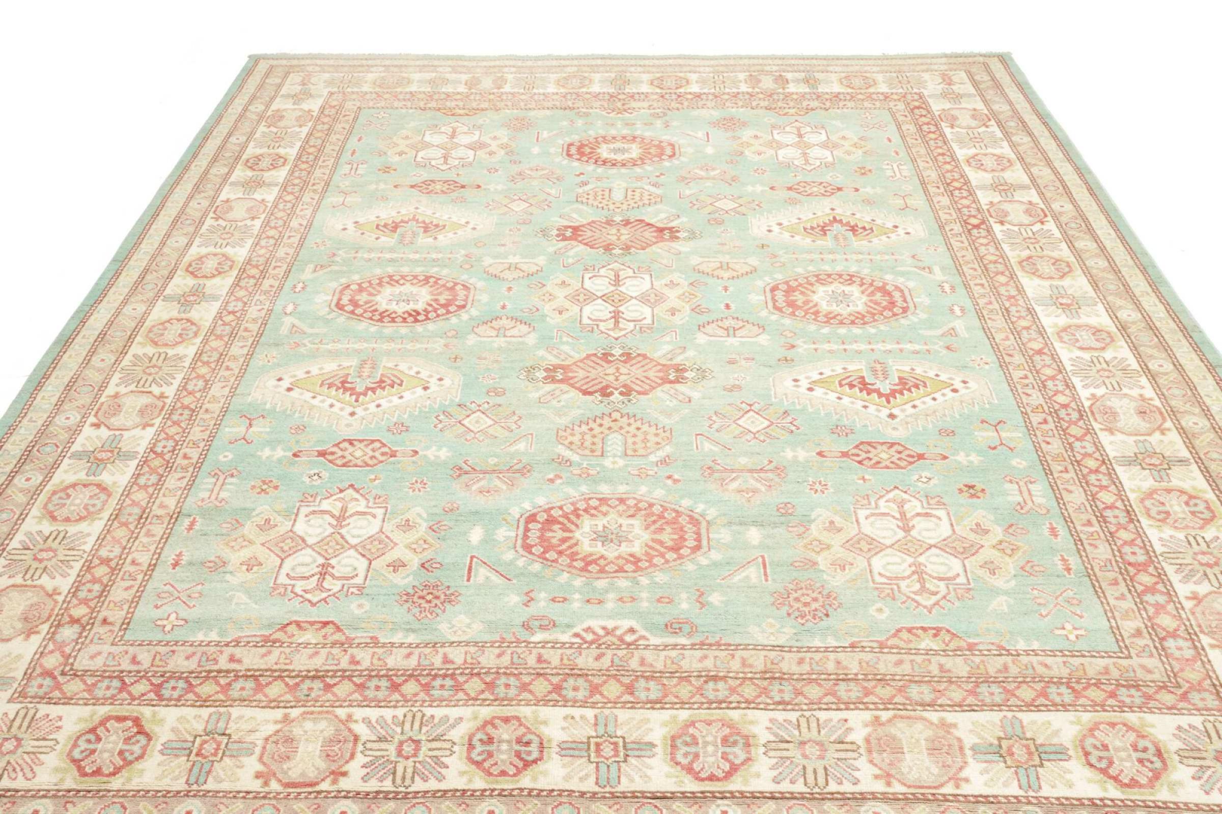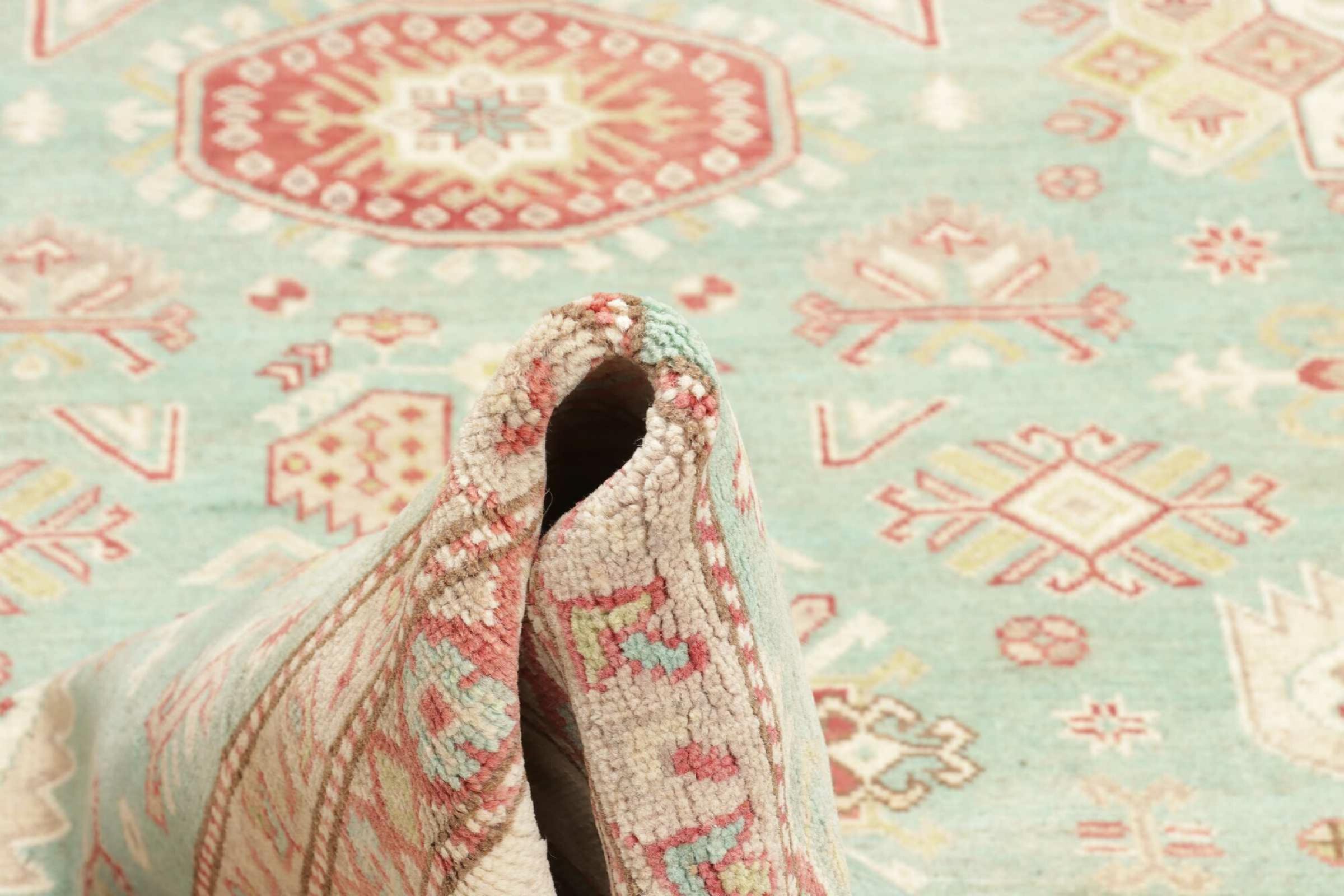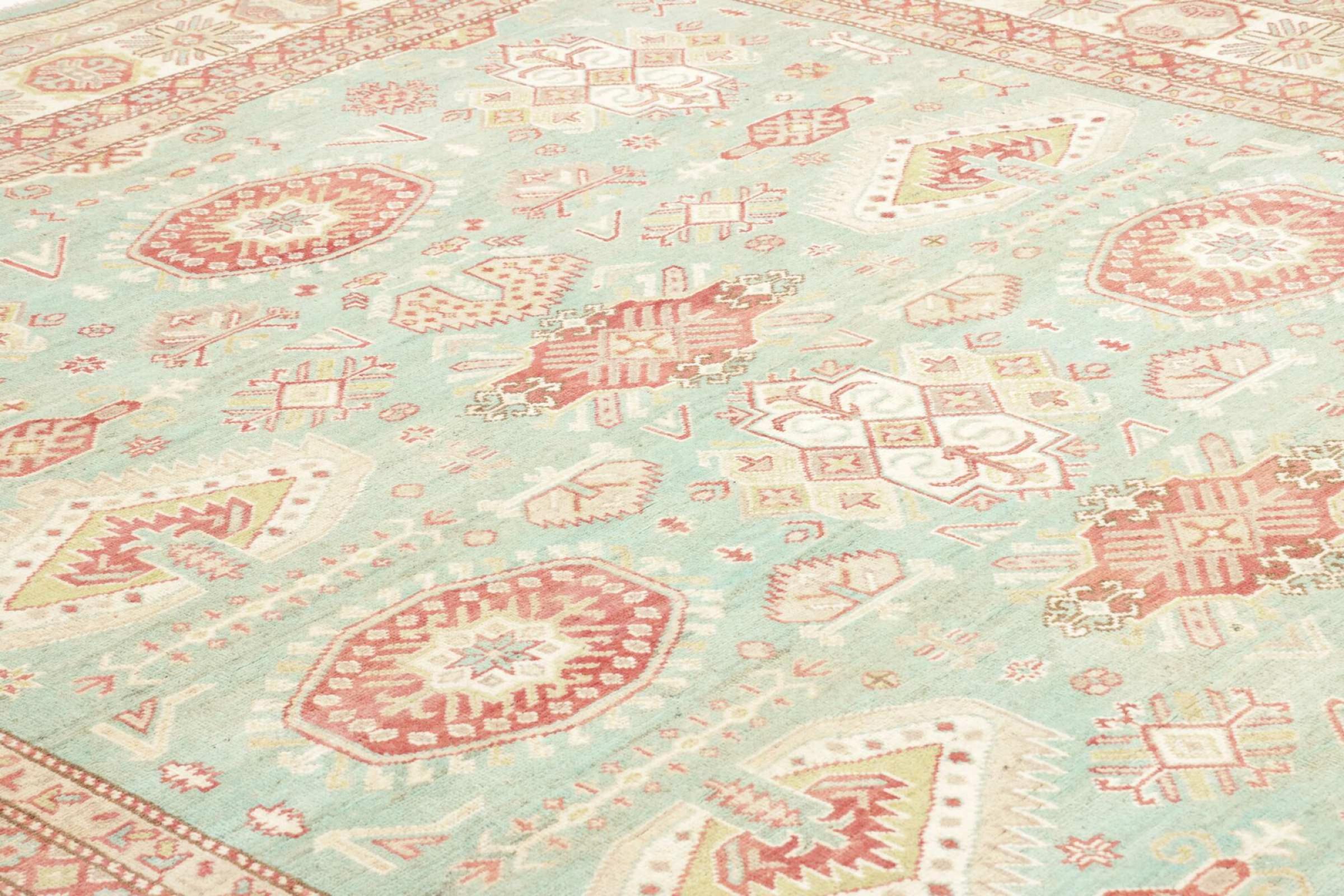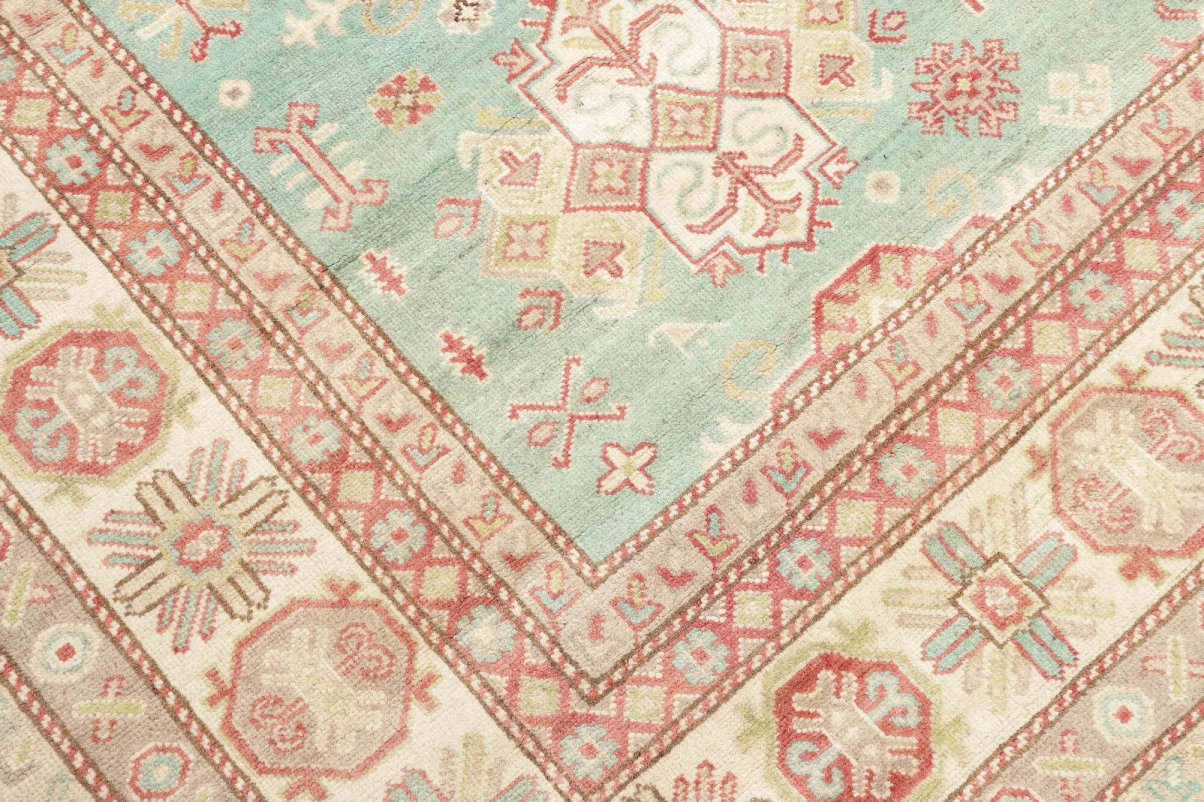 This Kazak rug has been crafted by hand along old tradition. The region of origin is famous for its mountains and the handmade rugs with beautiful shades of red, blue and green. The colors are slightly lightened on this rug, like with most Kazak rugs.
