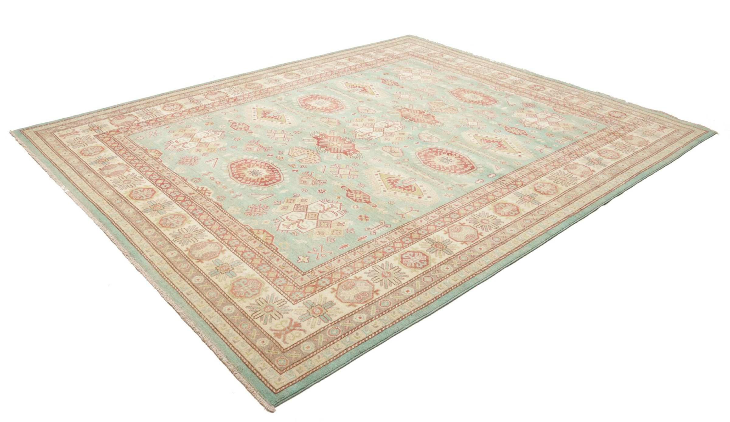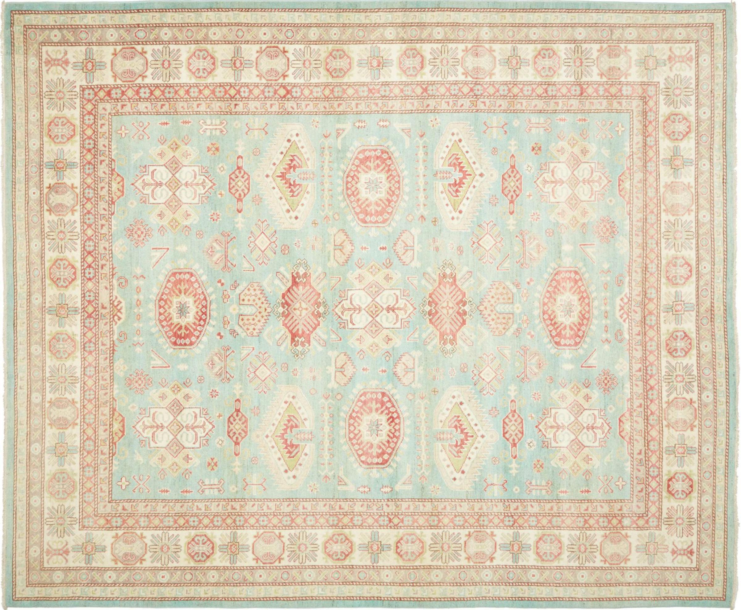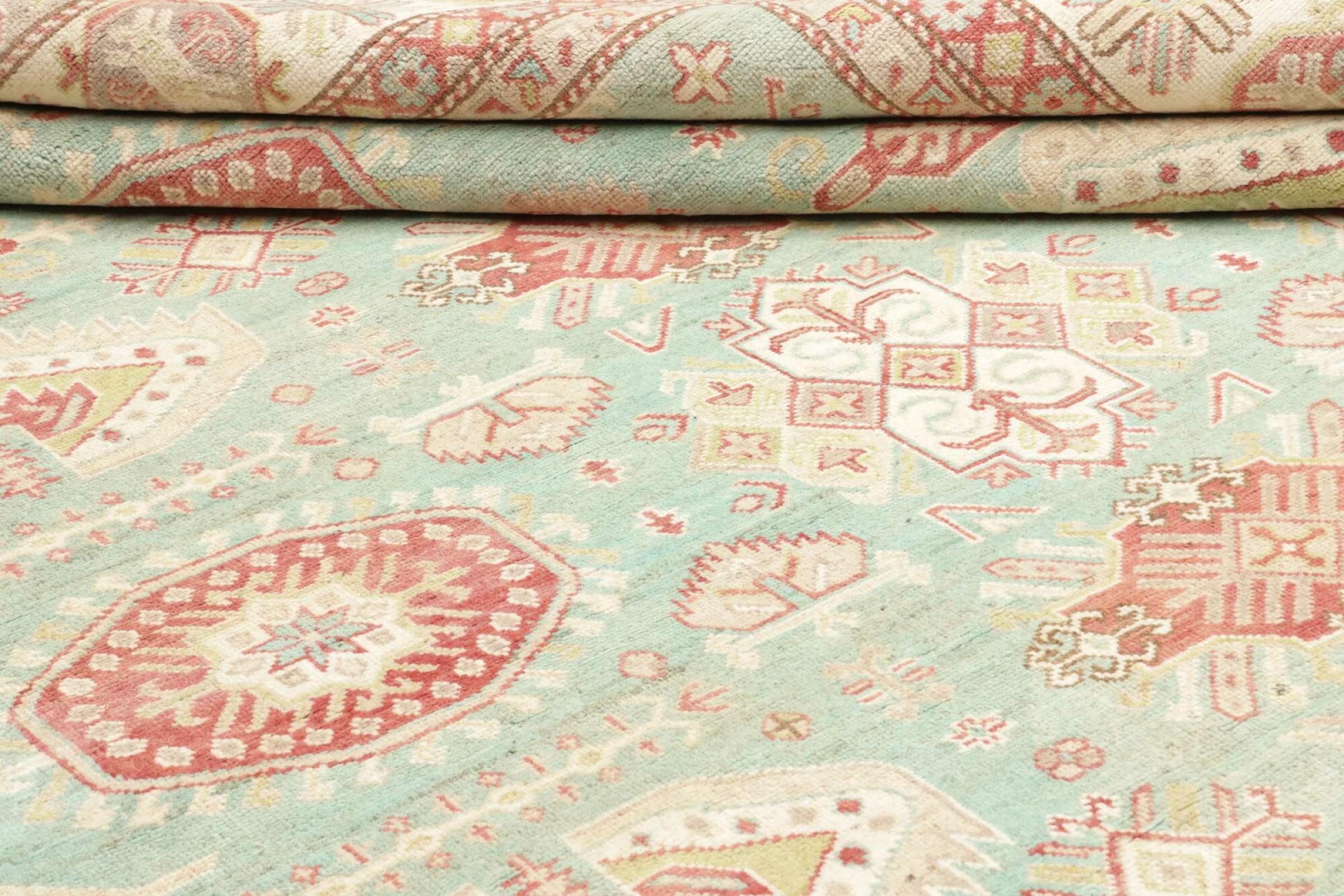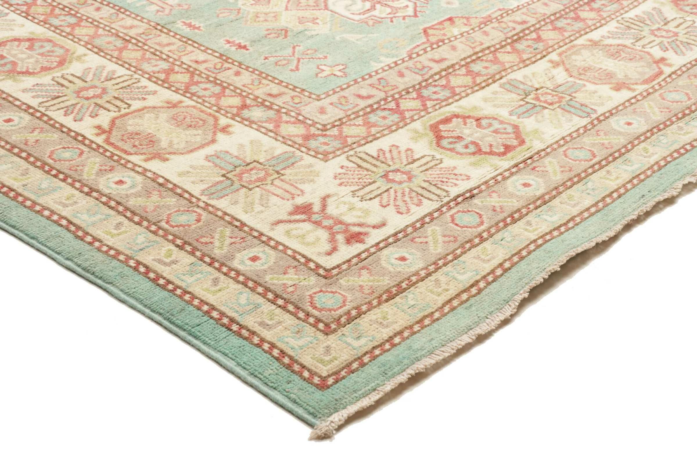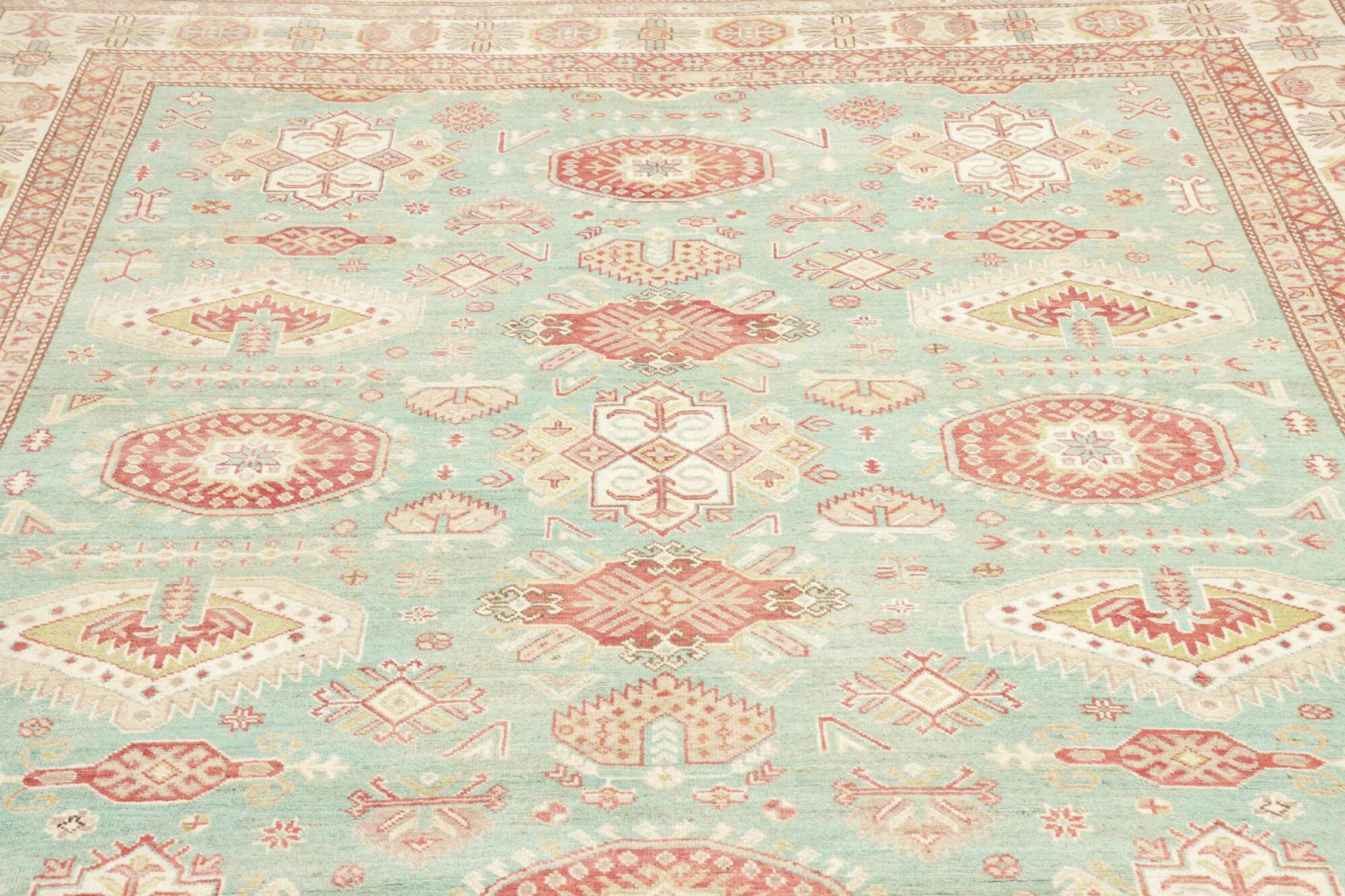 This Kazak rug has been crafted by hand along old tradition. The region of origin is famous for its mountains and the handmade rugs with beautiful shades of red, blue and green. The colors are slightly lightened on this rug, like with most Kazak rugs.