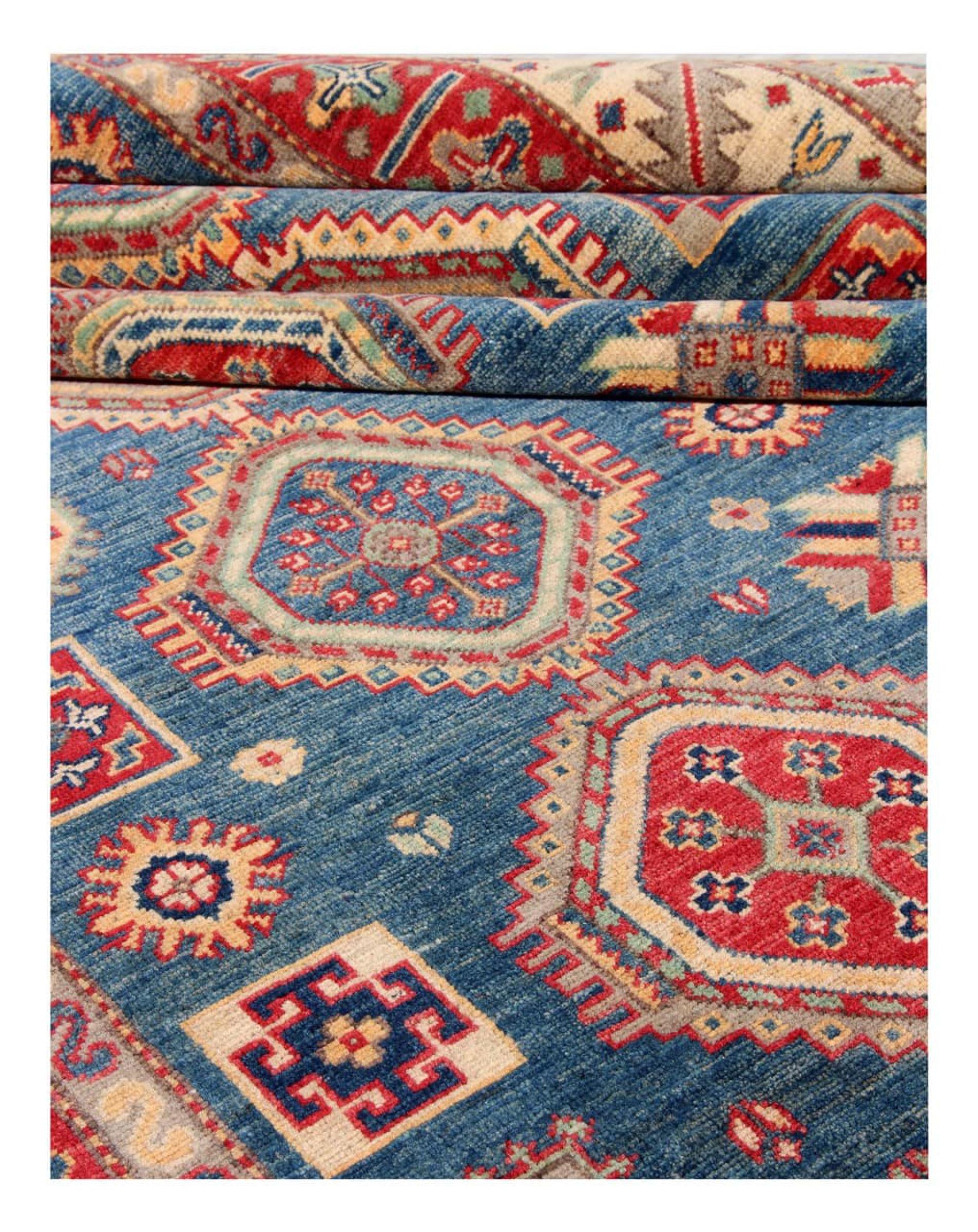 This Kazak rug has been crafted by hand along old tradition. The region of origin is famous for its mountains and the handmade rugs with beautiful shades of red, blue and green. The colors are slightly lightened on this rug, like with most Kazak rugs.