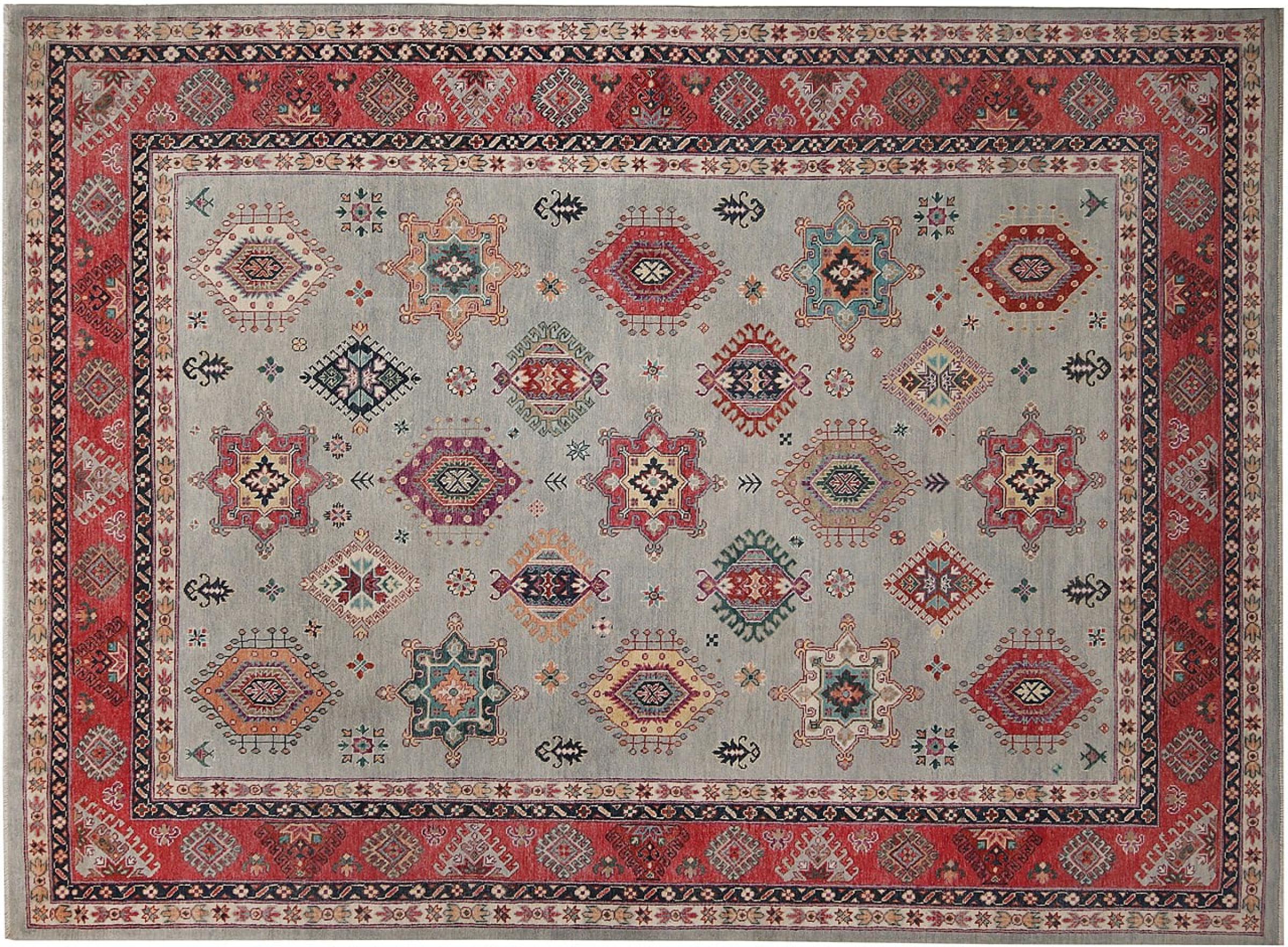 This Kazak rug has been crafted by hand along old tradition. The region of origin is famous for its mountains and the handmade rugs with beautiful shades of red, blue and green. The colors are slightly lightened on this rug, like with most Kazak rugs.