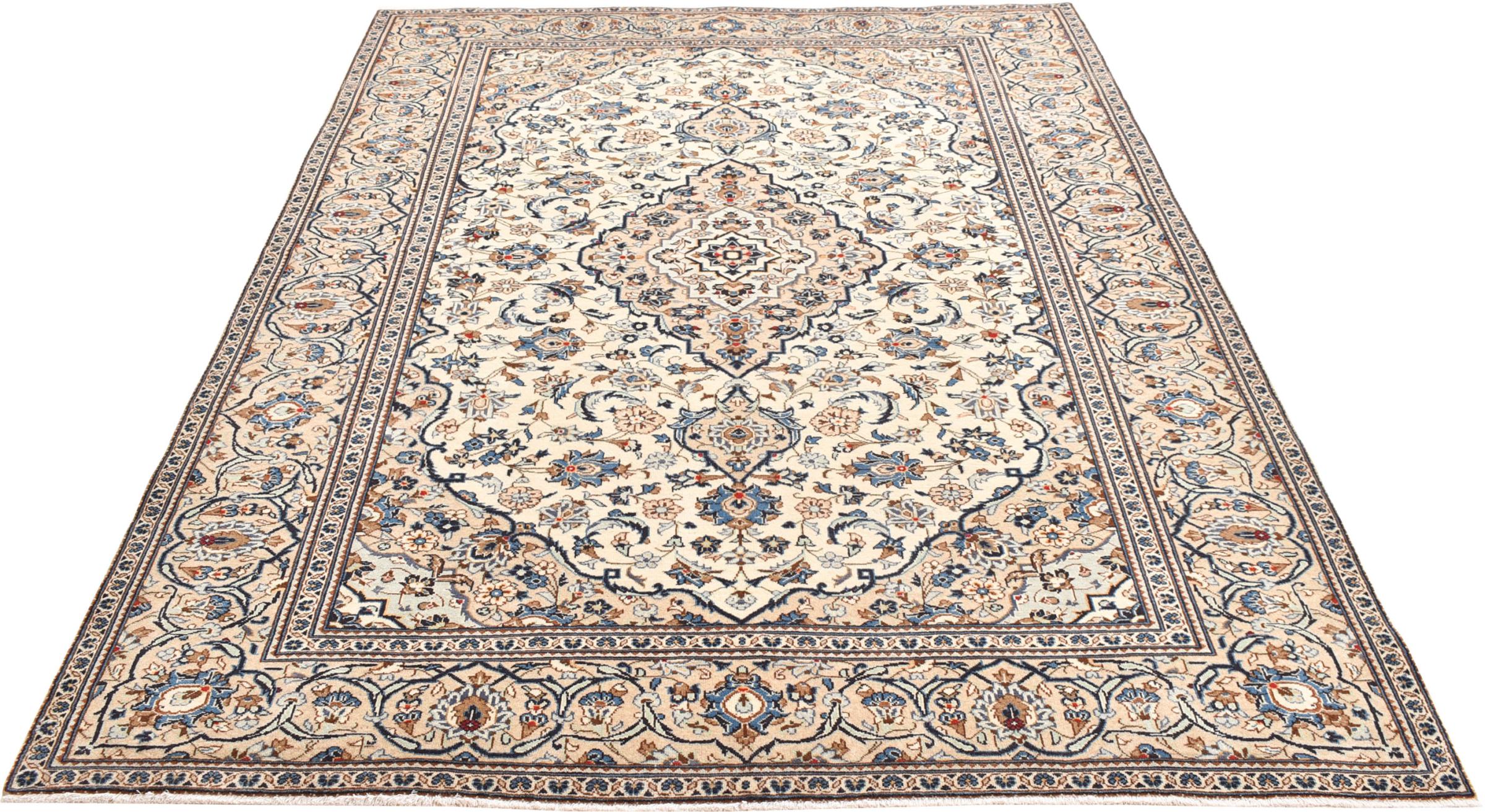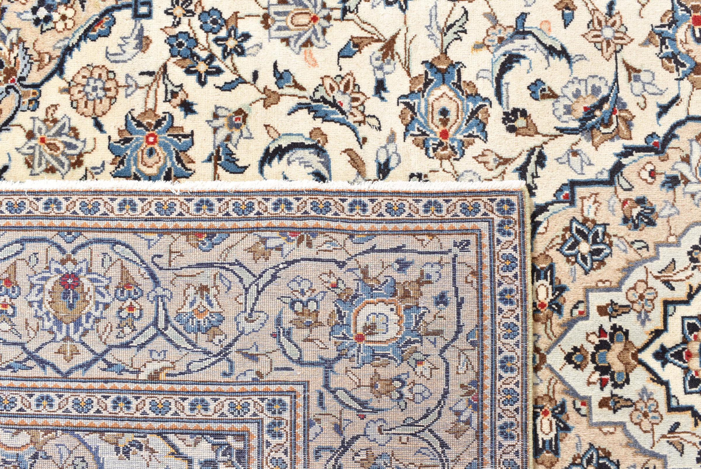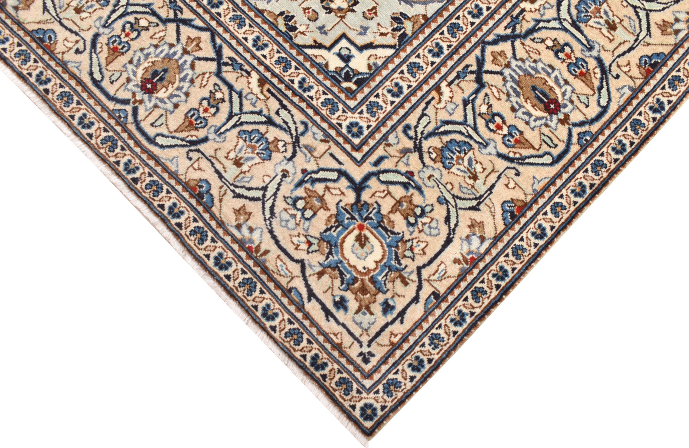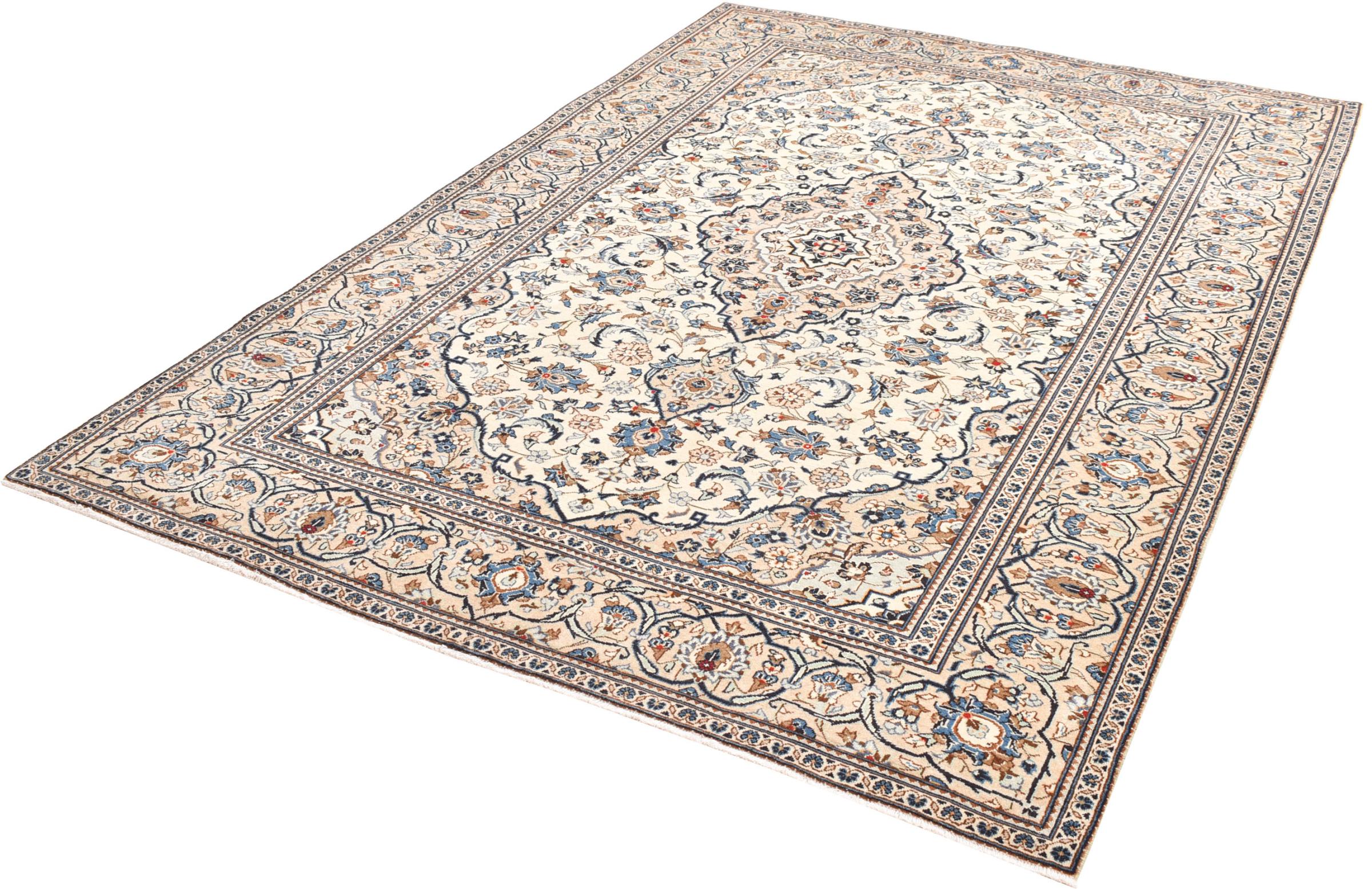 This rug originates from Keshan also called Kashan in Persia. It counts to the most popular Persian rugs. This Keshan comes in a typical design for its type. It has been crafted by hand from fine sheep wool and natural dyes. The ornaments embody a centuries old design pattern, which is still highly popular today.