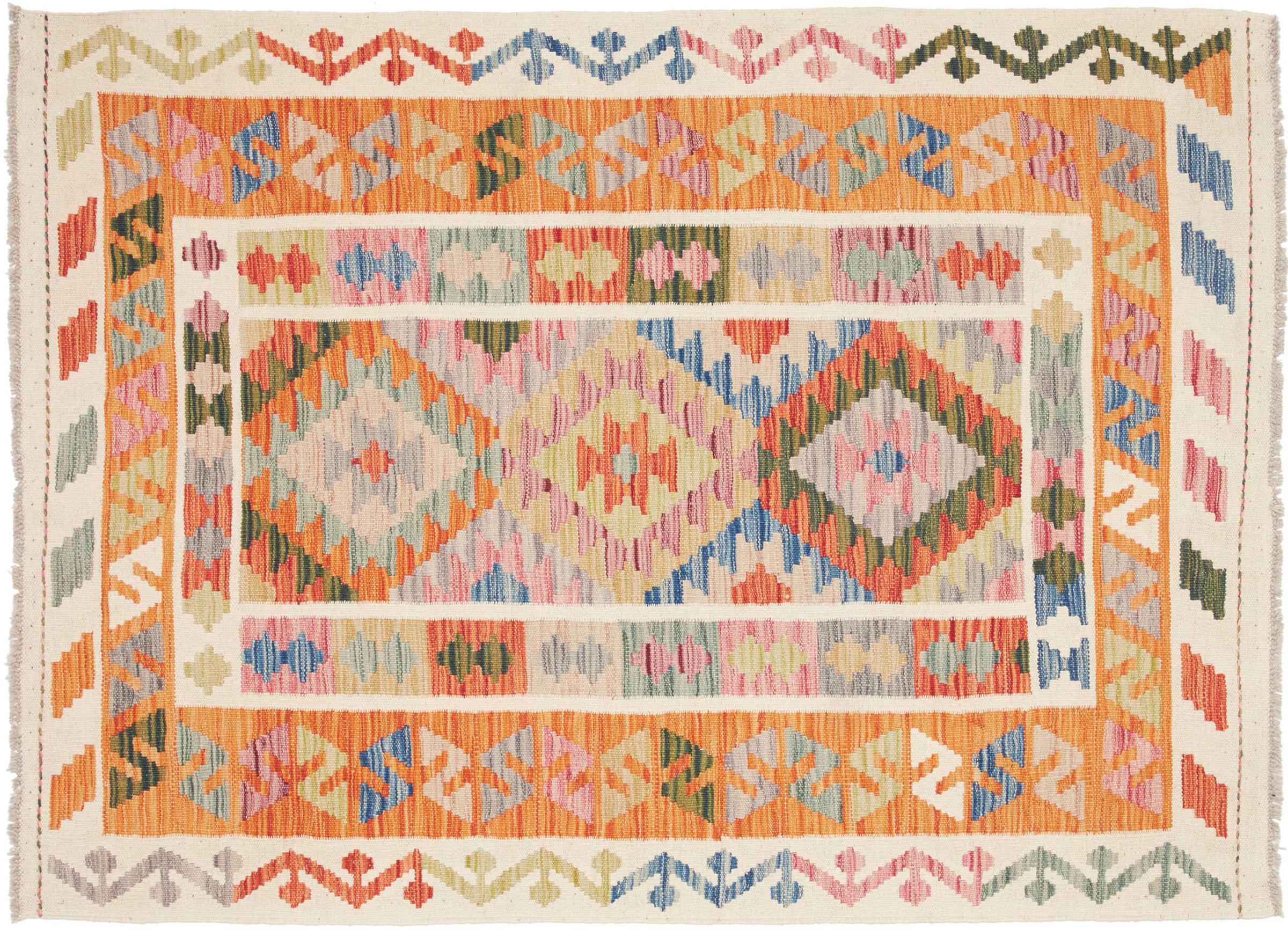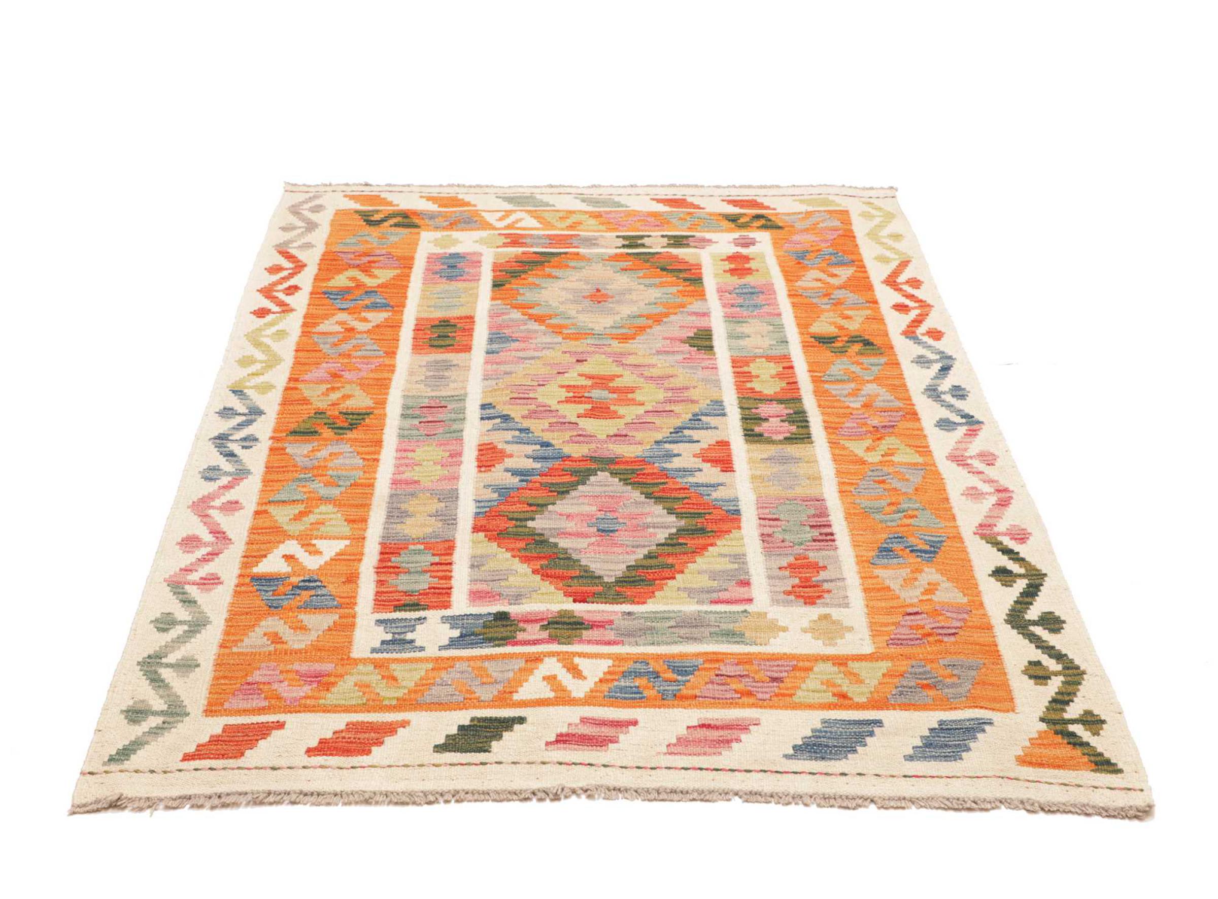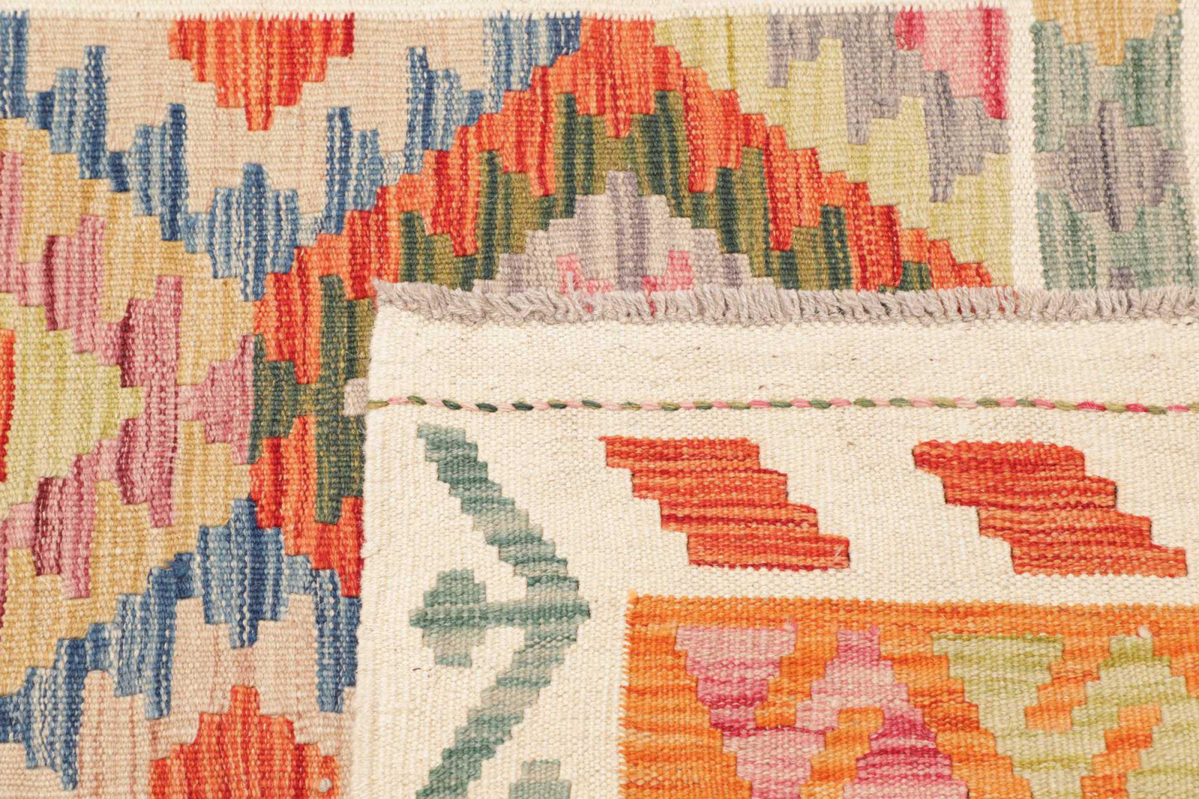 This Kilim Afghan rug has beautiful colors. It is handmade from fine wool. These patterns are traditional design elements that have already been used centuries ago. This particular kilim has been woven by hand in Afghanistan, a country with a long history in weaving and knotting rugs. The rug is robust and can be laid out on both sides.