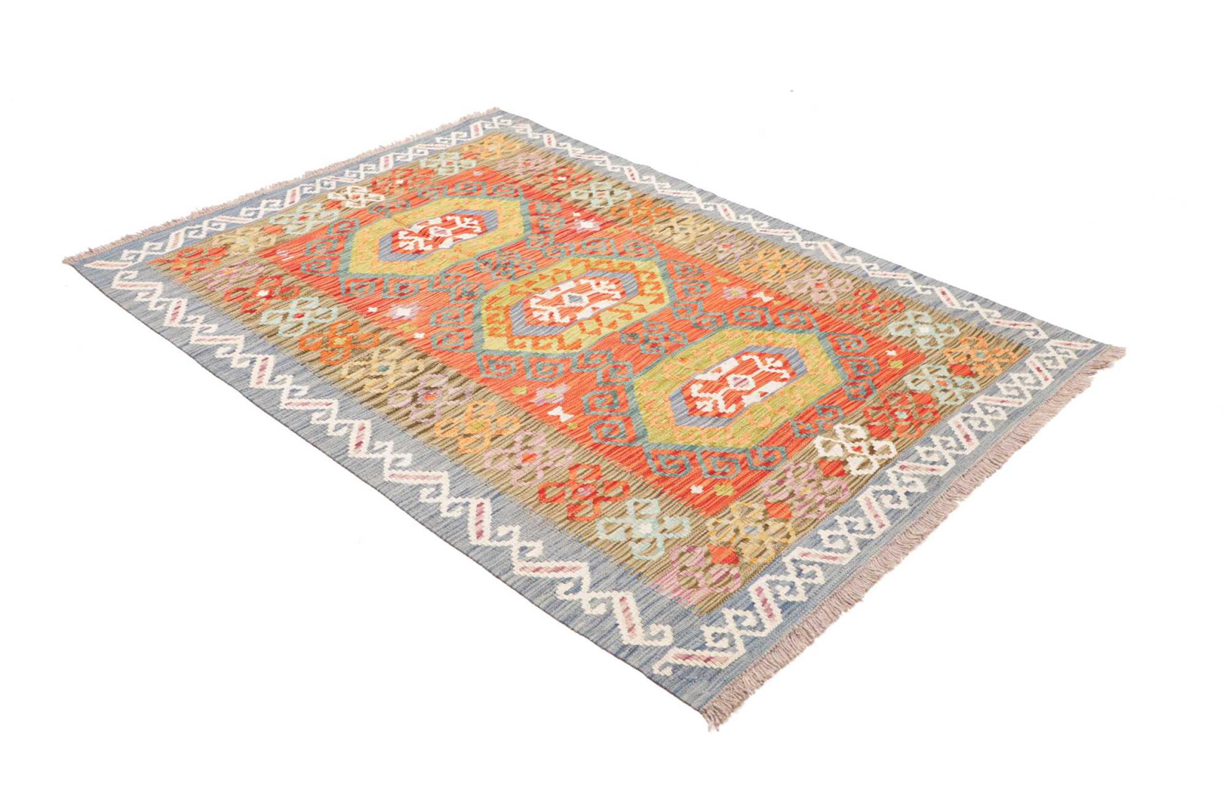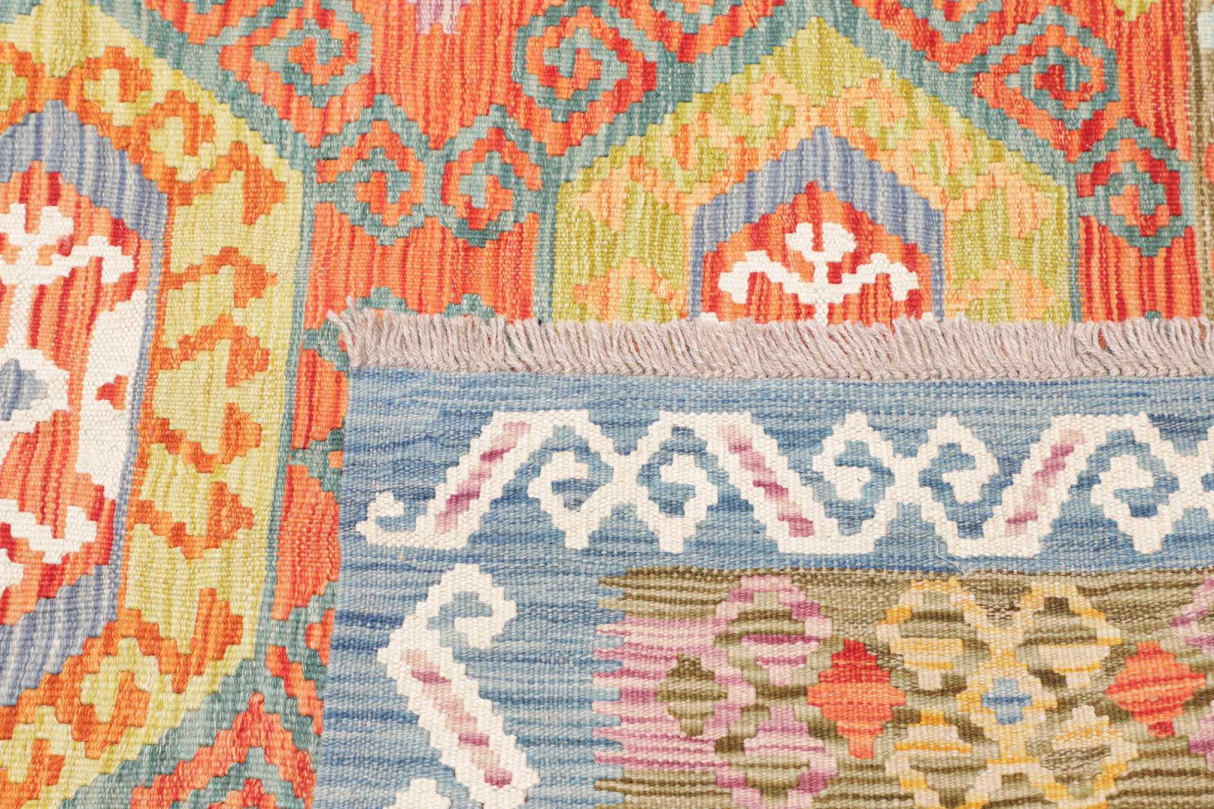 This Kilim Afghan rug has beautiful colors. It is handmade from fine wool. These patterns are traditional design elements that have already been used centuries ago. This particular kilim has been woven by hand in Afghanistan, a country with a long history in weaving and knotting rugs. The rug is robust and can be laid out on both sides.
