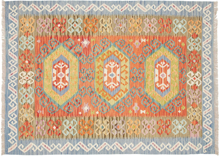 These Kilim rugs have a significant difference from hand-knotted rugs—they are handwoven. As a result, they do not have a high pile of wool and are often flatter and rougher than knotted wool rugs. Their construction is less intricate, making them generally much more affordable. Additionally, Kilim rugs are much lighter and can be laid out on either side. Handwoven Kilims originally come from what was once Persia and are now also widely produced in Afghanistan. They typically feature simple, straight-line patterns, which are characteristic of their weaving technique.