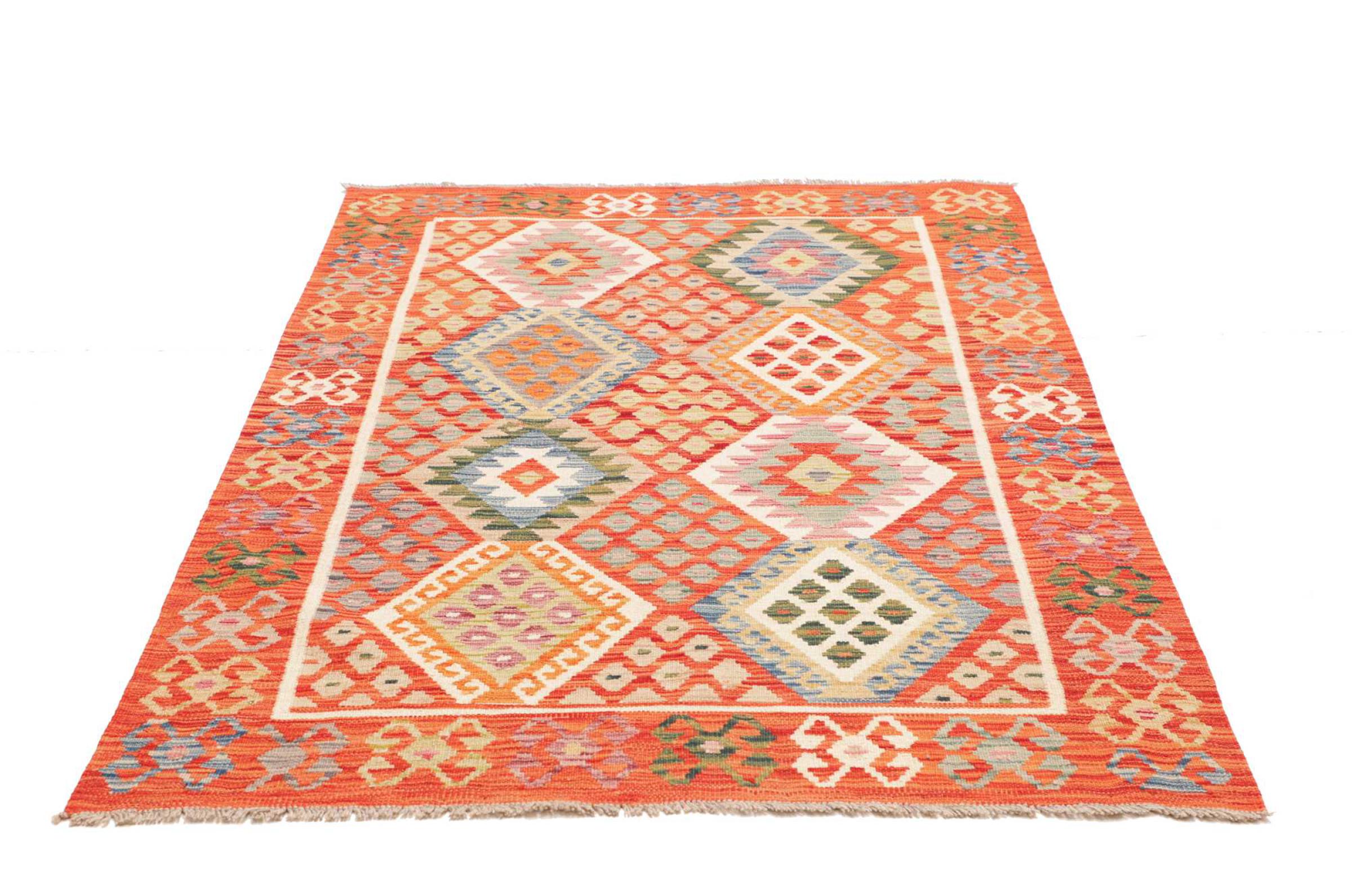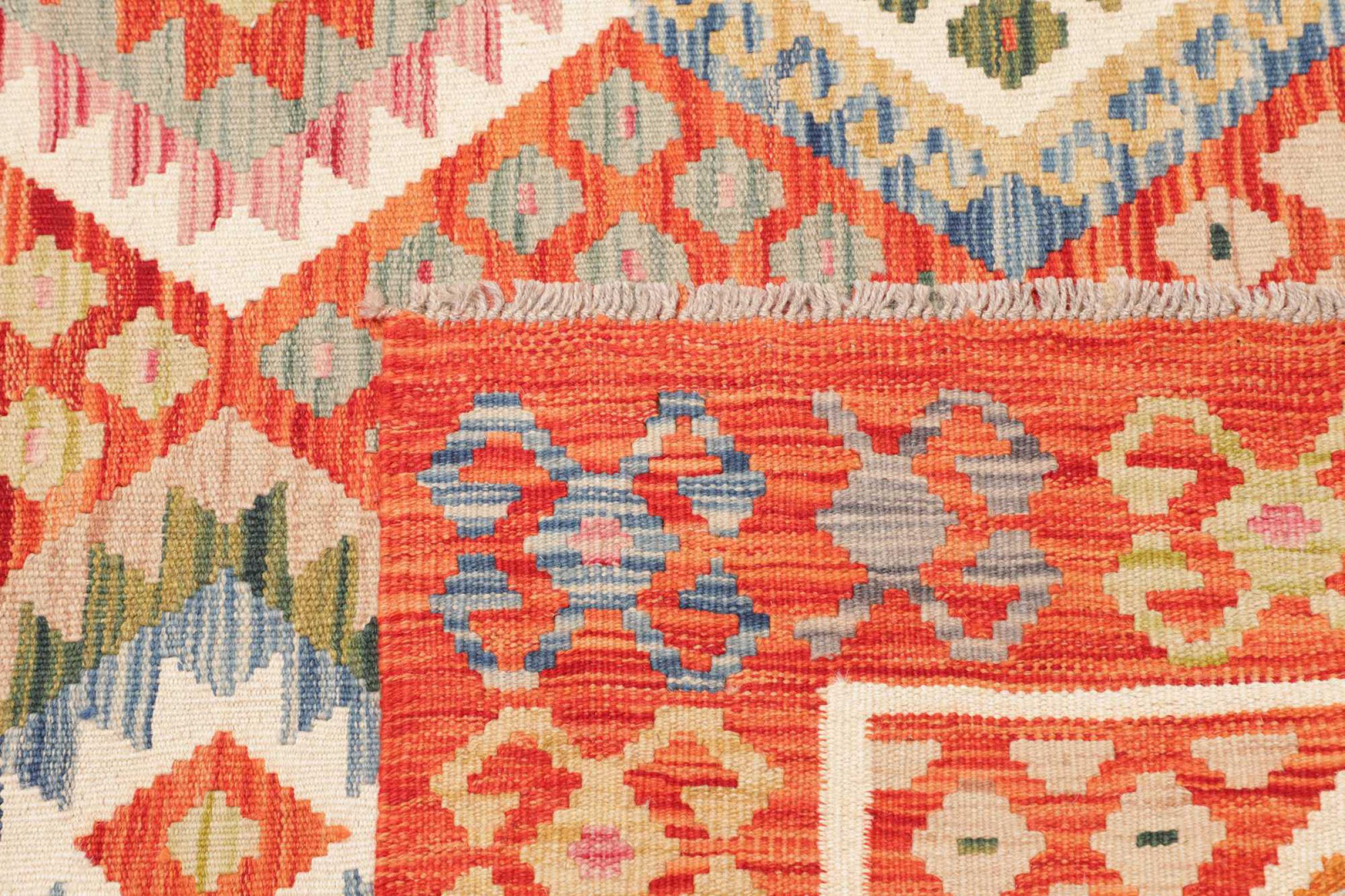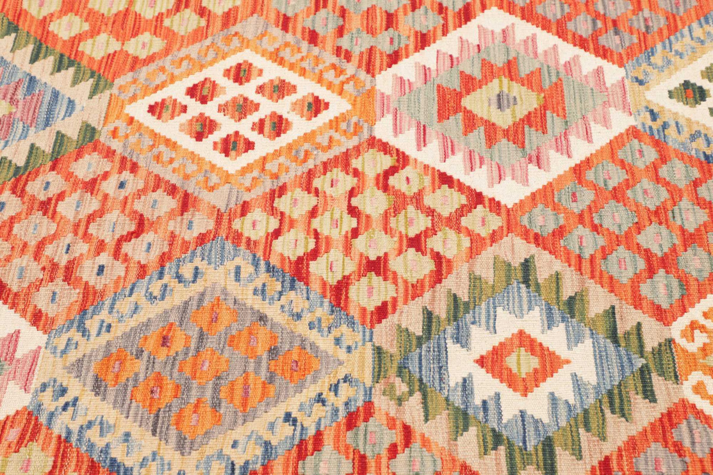 This Kilim Afghan rug has beautiful colors. It is handmade from fine wool. These patterns are traditional design elements that have already been used centuries ago. This particular kilim has been woven by hand in Afghanistan, a country with a long history in weaving and knotting rugs. The rug is robust and can be laid out on both sides.