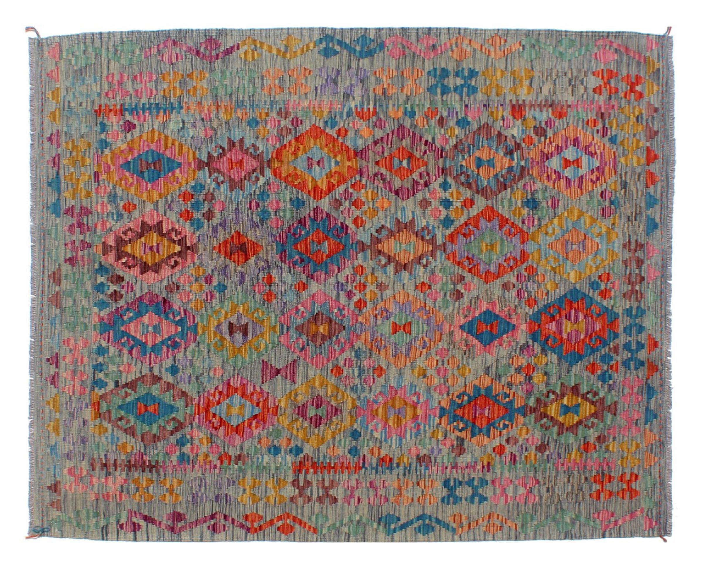 This Kilim Afghan rug has beautiful colors. It is handmade from fine wool. These patterns are traditional design elements that have already been used centuries ago. This particular kilim has been woven by hand in Afghanistan, a country with a long history in weaving and knotting rugs. The rug is robust and can be laid out on both sides.