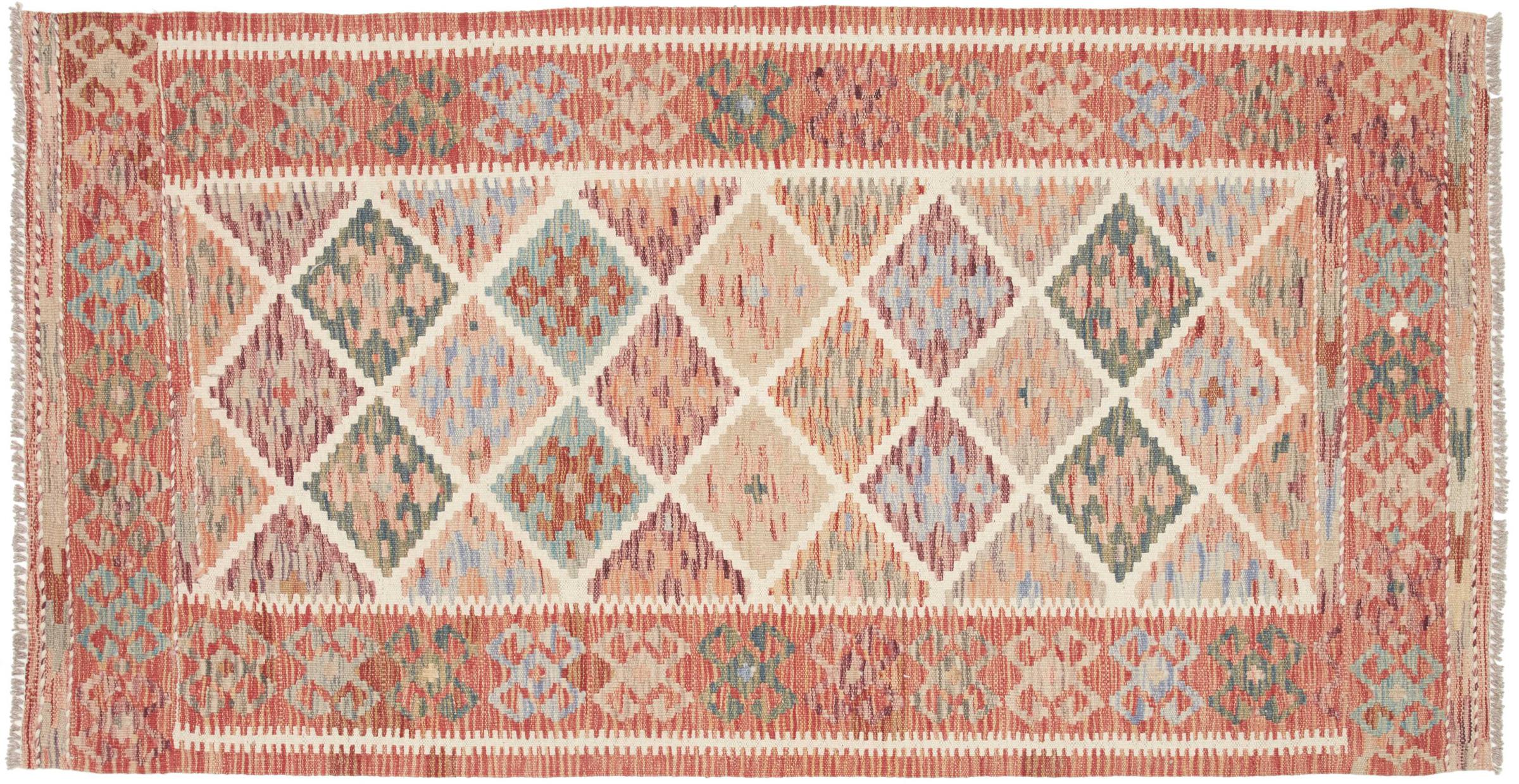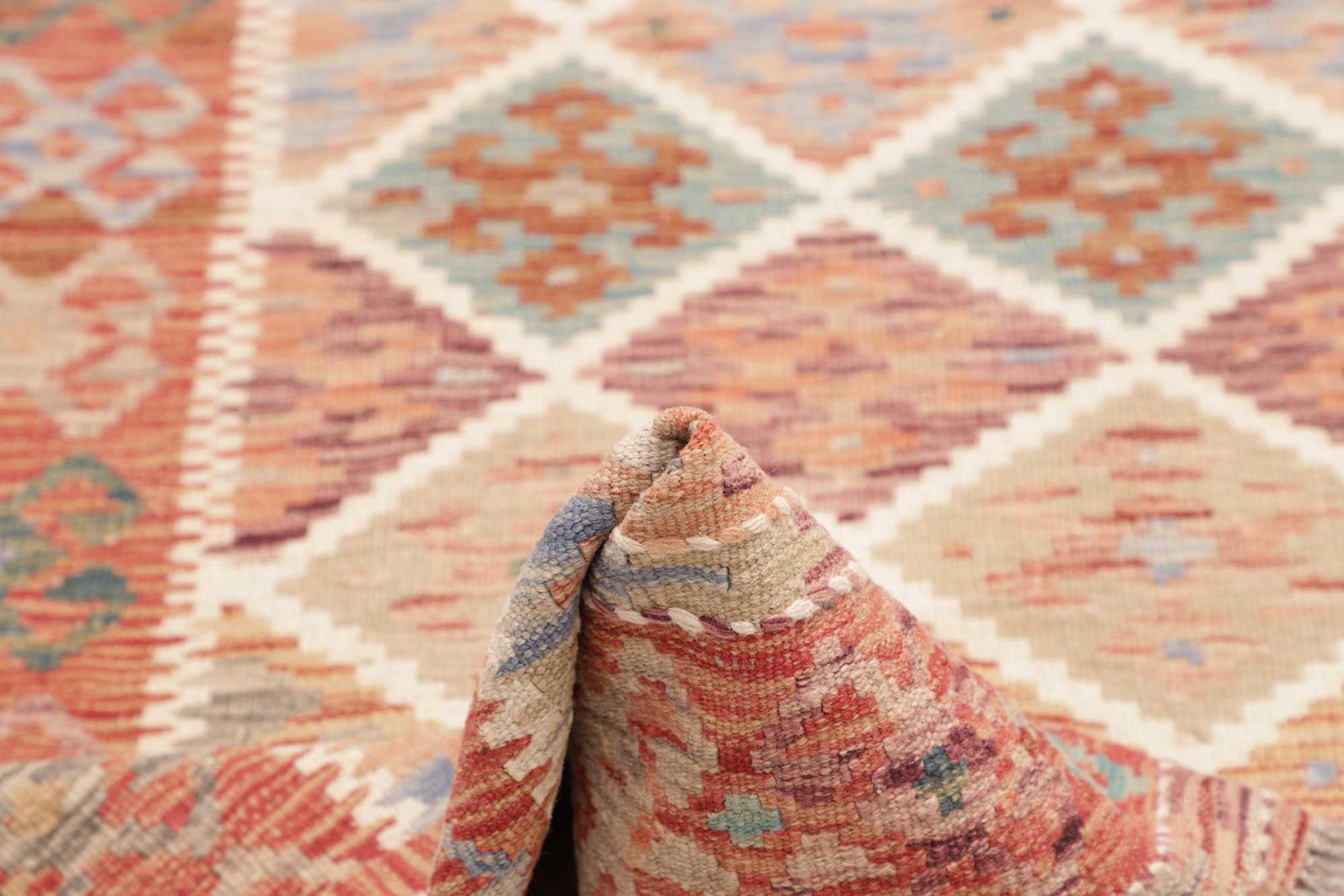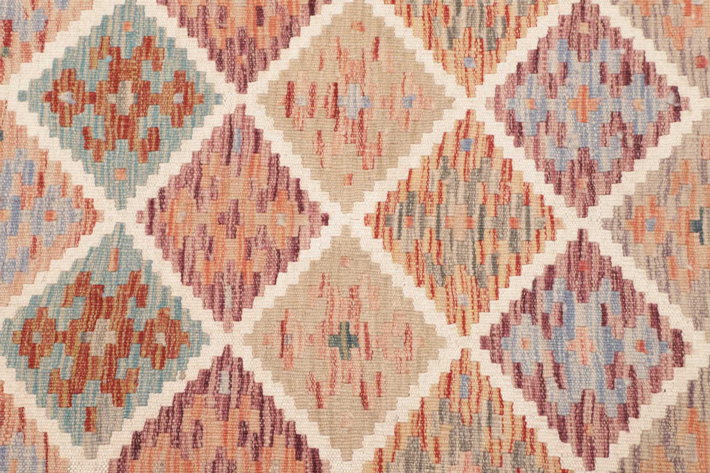 This Kilim Afghan rug has beautiful colors. It is handmade from fine wool. These patterns are traditional design elements that have already been used centuries ago. This particular kilim has been woven by hand in Afghanistan, a country with a long history in weaving and knotting rugs. The rug is robust and can be laid out on both sides.