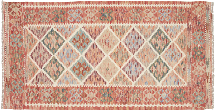 These Kilim rugs have a significant difference from hand-knotted rugs—they are handwoven. As a result, they do not have a high pile of wool and are often flatter and rougher than knotted wool rugs. Their construction is less intricate, making them generally much more affordable. Additionally, Kilim rugs are much lighter and can be laid out on either side. Handwoven Kilims originally come from what was once Persia and are now also widely produced in Afghanistan. They typically feature simple, straight-line patterns, which are characteristic of their weaving technique.
