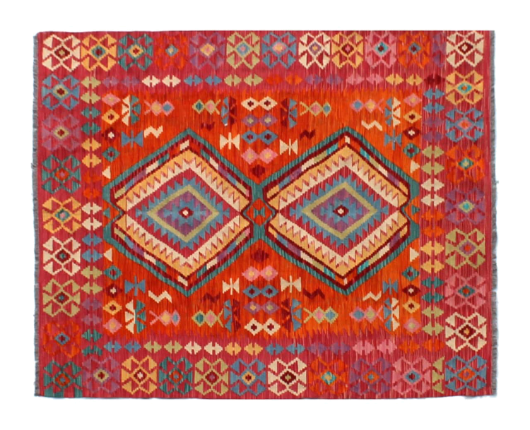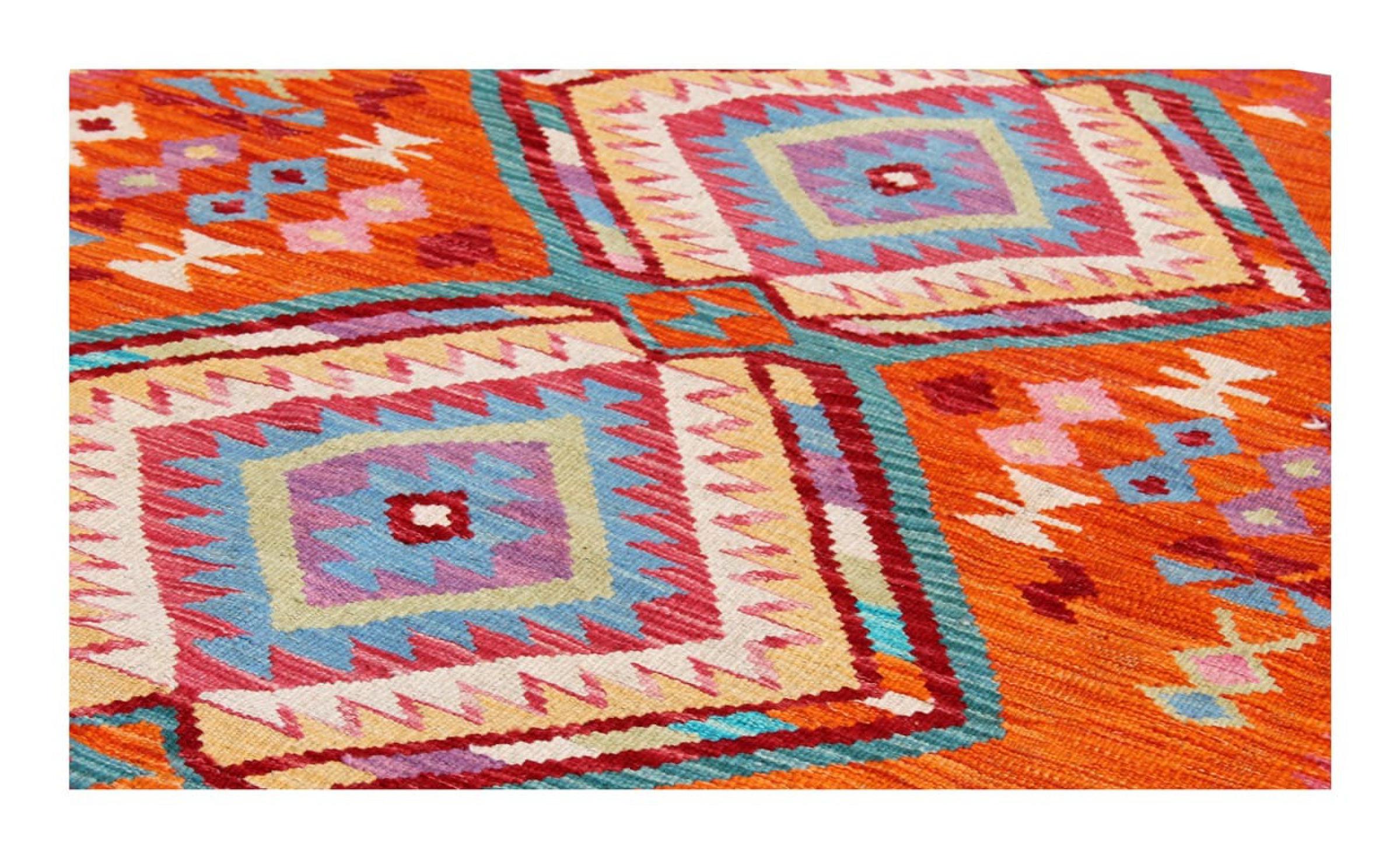 These Kilim rugs have a significant difference from hand-knotted rugs—they are handwoven. As a result, they do not have a high pile of wool and are often flatter and rougher than knotted wool rugs. Their construction is less intricate, making them generally much more affordable. Additionally, Kilim rugs are much lighter and can be laid out on either side. Handwoven Kilims originally come from what was once Persia and are now also widely produced in Afghanistan. They typically feature simple, straight-line patterns, which are characteristic of their weaving technique.