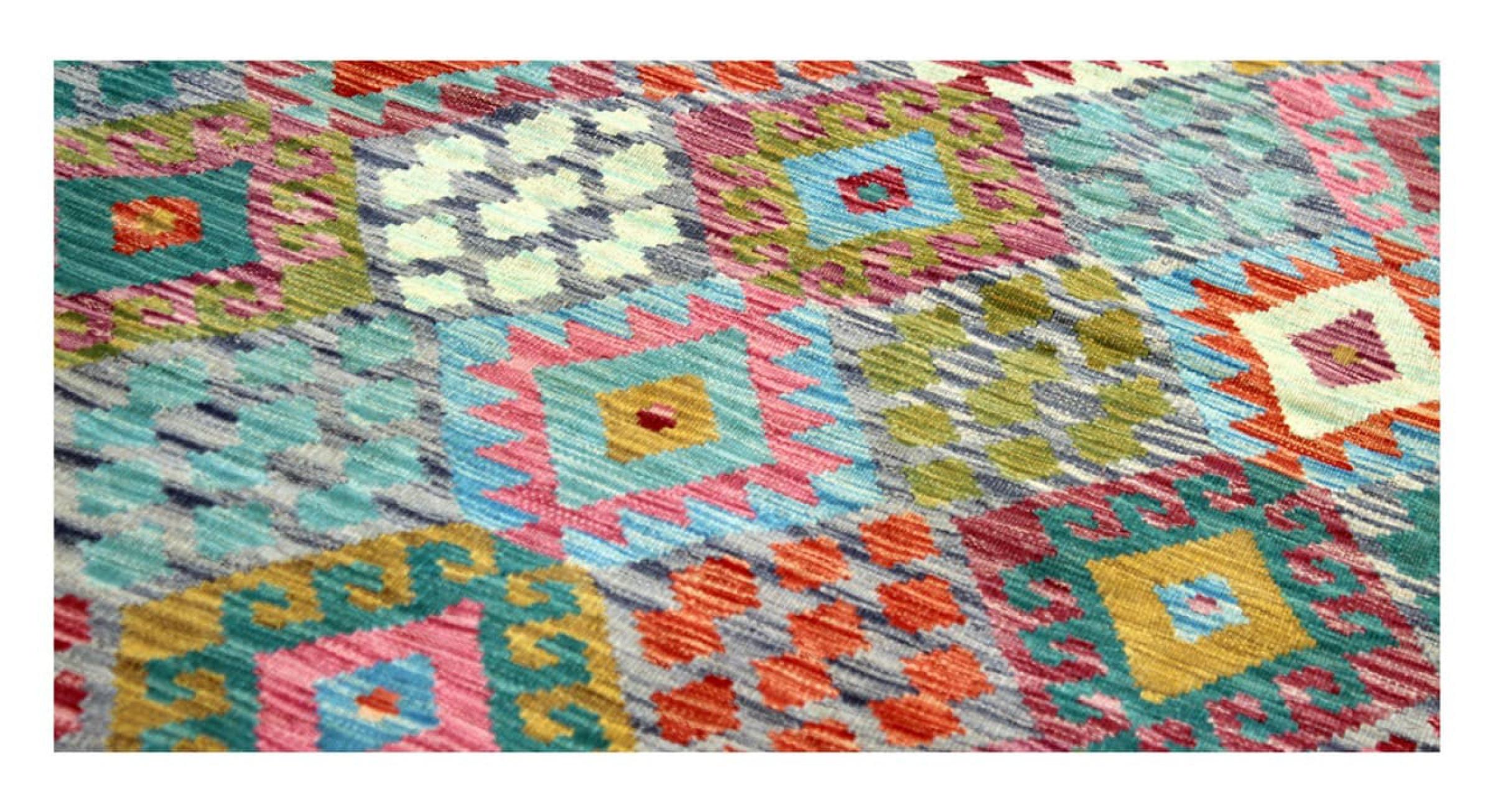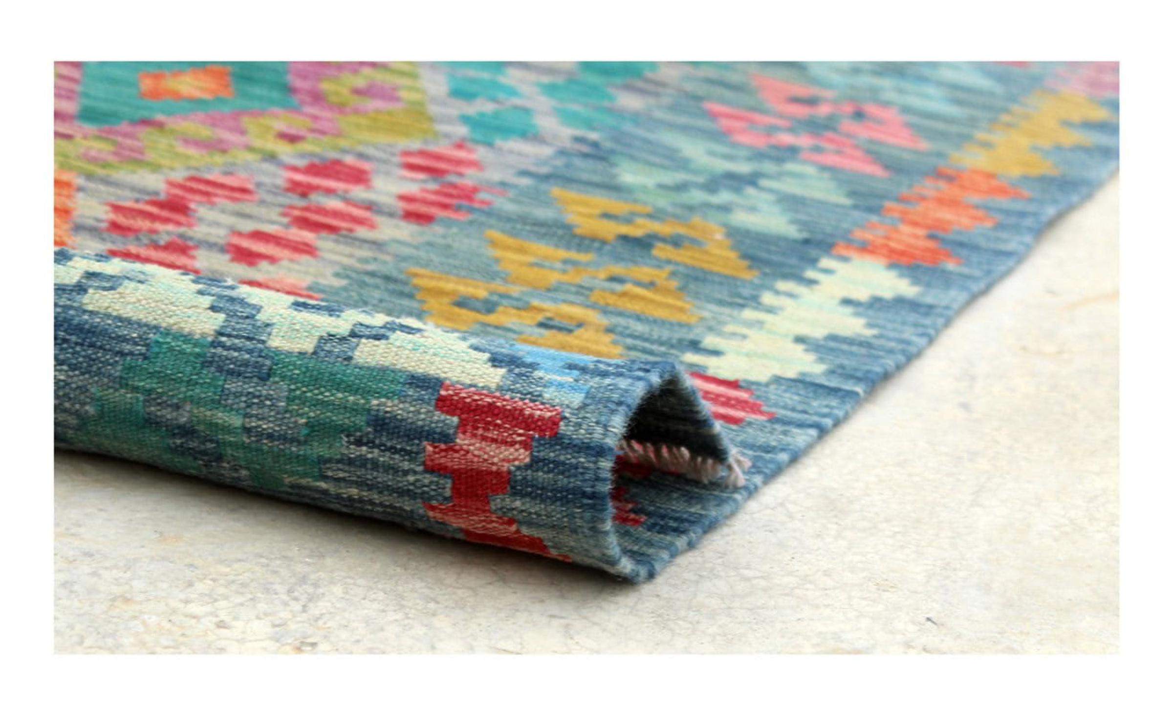 These Kilim rugs have a significant difference from hand-knotted rugs—they are handwoven. As a result, they do not have a high pile of wool and are often flatter and rougher than knotted wool rugs. Their construction is less intricate, making them generally much more affordable. Additionally, Kilim rugs are much lighter and can be laid out on either side. Handwoven Kilims originally come from what was once Persia and are now also widely produced in Afghanistan. They typically feature simple, straight-line patterns, which are characteristic of their weaving technique.