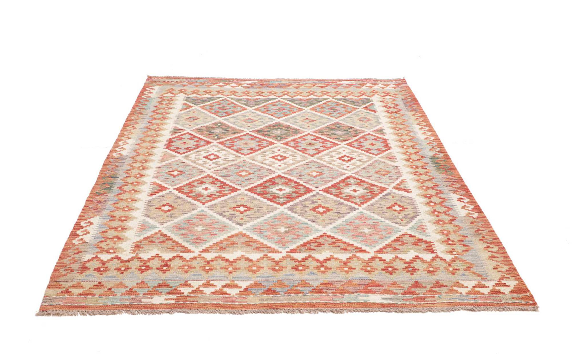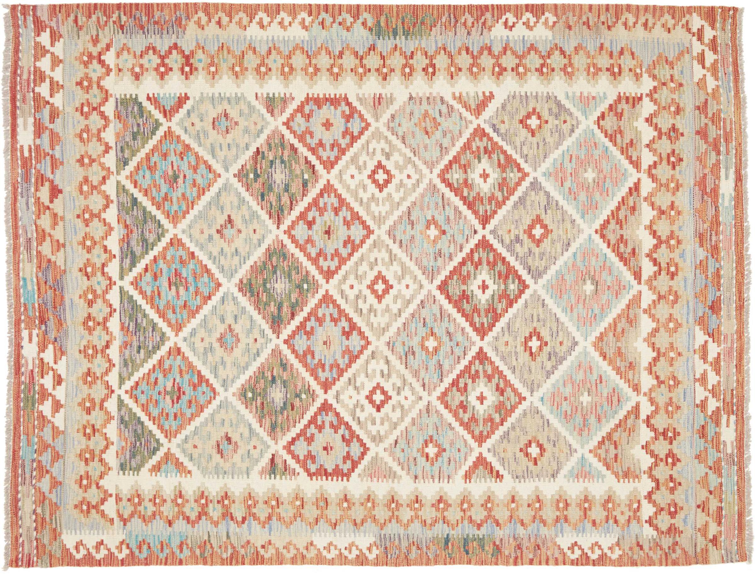 This Kilim Afghan rug has beautiful colors. It is handmade from fine wool. These patterns are traditional design elements that have already been used centuries ago. This particular kilim has been woven by hand in Afghanistan, a country with a long history in weaving and knotting rugs. The rug is robust and can be laid out on both sides.