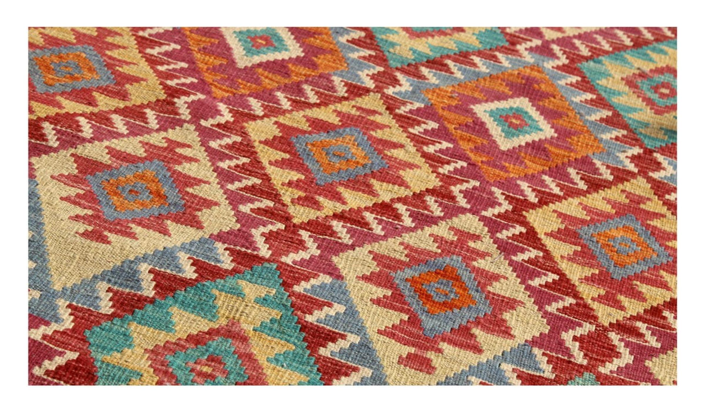 These Kilim rugs have a significant difference from hand-knotted rugs—they are handwoven. As a result, they do not have a high pile of wool and are often flatter and rougher than knotted wool rugs. Their construction is less intricate, making them generally much more affordable. Additionally, Kilim rugs are much lighter and can be laid out on either side. Handwoven Kilims originally come from what was once Persia and are now also widely produced in Afghanistan. They typically feature simple, straight-line patterns, which are characteristic of their weaving technique.