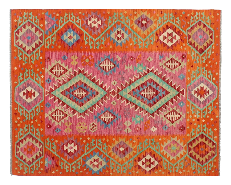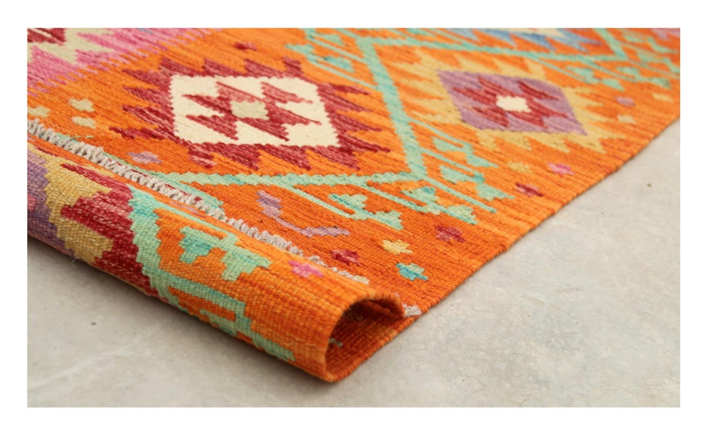 These Kilim rugs have a significant difference from hand-knotted rugs—they are handwoven. As a result, they do not have a high pile of wool and are often flatter and rougher than knotted wool rugs. Their construction is less intricate, making them generally much more affordable. Additionally, Kilim rugs are much lighter and can be laid out on either side. Handwoven Kilims originally come from what was once Persia and are now also widely produced in Afghanistan. They typically feature simple, straight-line patterns, which are characteristic of their weaving technique.