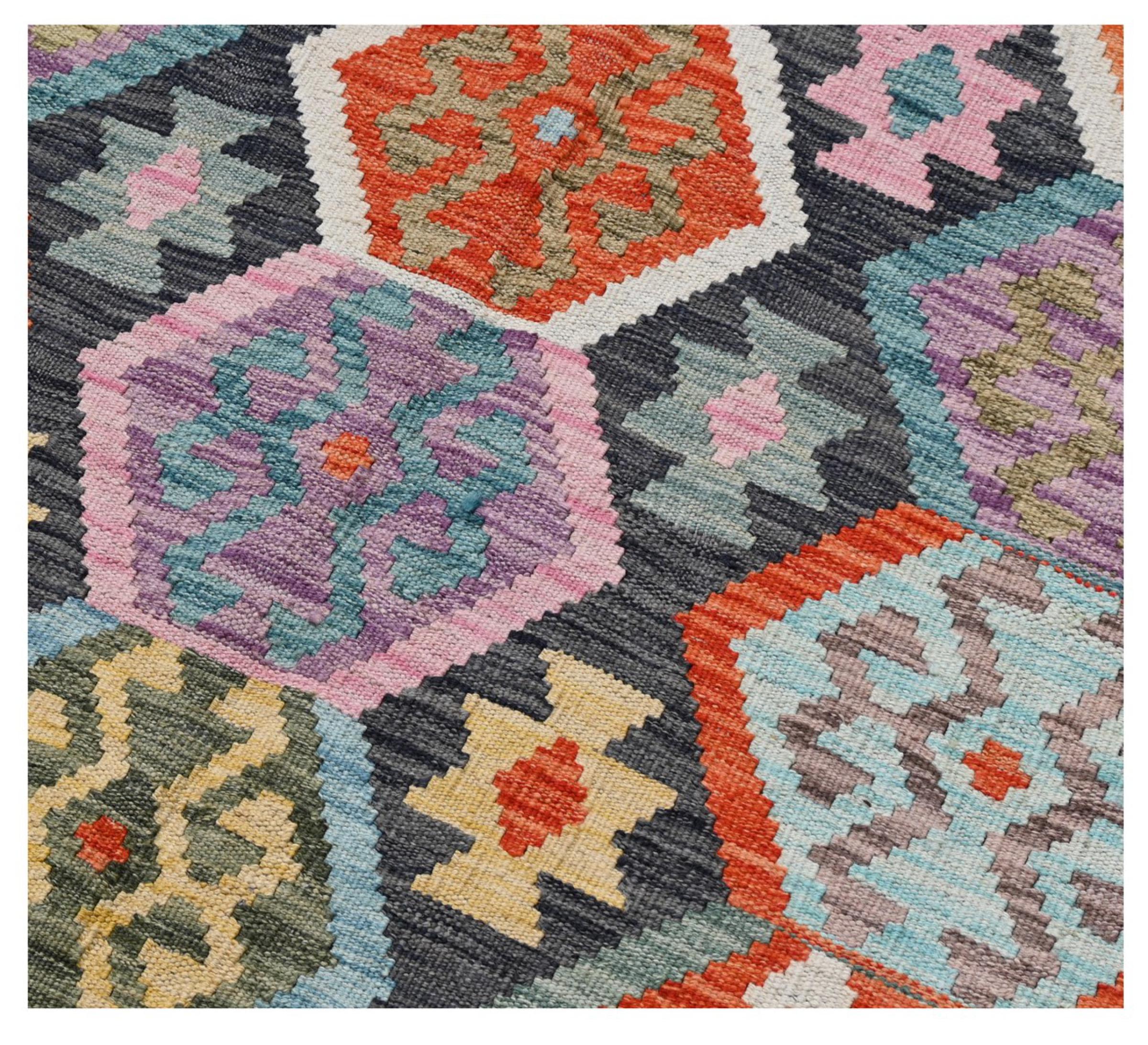 This Kilim Afghan rug has beautiful colors. It is handmade from fine wool. These patterns are traditional design elements that have already been used centuries ago. This particular kilim has been woven by hand in Afghanistan, a country with a long history in weaving and knotting rugs. The rug is robust and can be laid out on both sides.