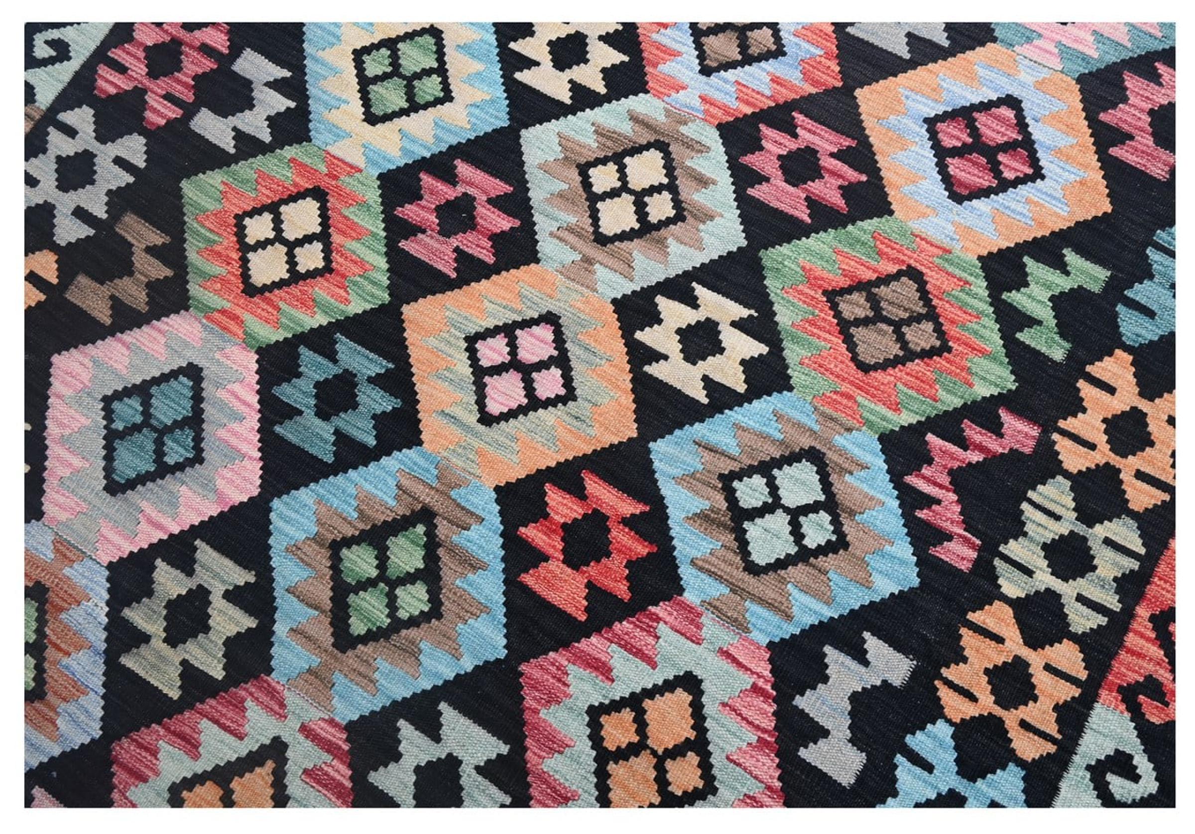 This Kilim Afghan rug has beautiful colors. It is handmade from fine wool. These patterns are traditional design elements that have already been used centuries ago. This particular kilim has been woven by hand in Afghanistan, a country with a long history in weaving and knotting rugs. The rug is robust and can be laid out on both sides.