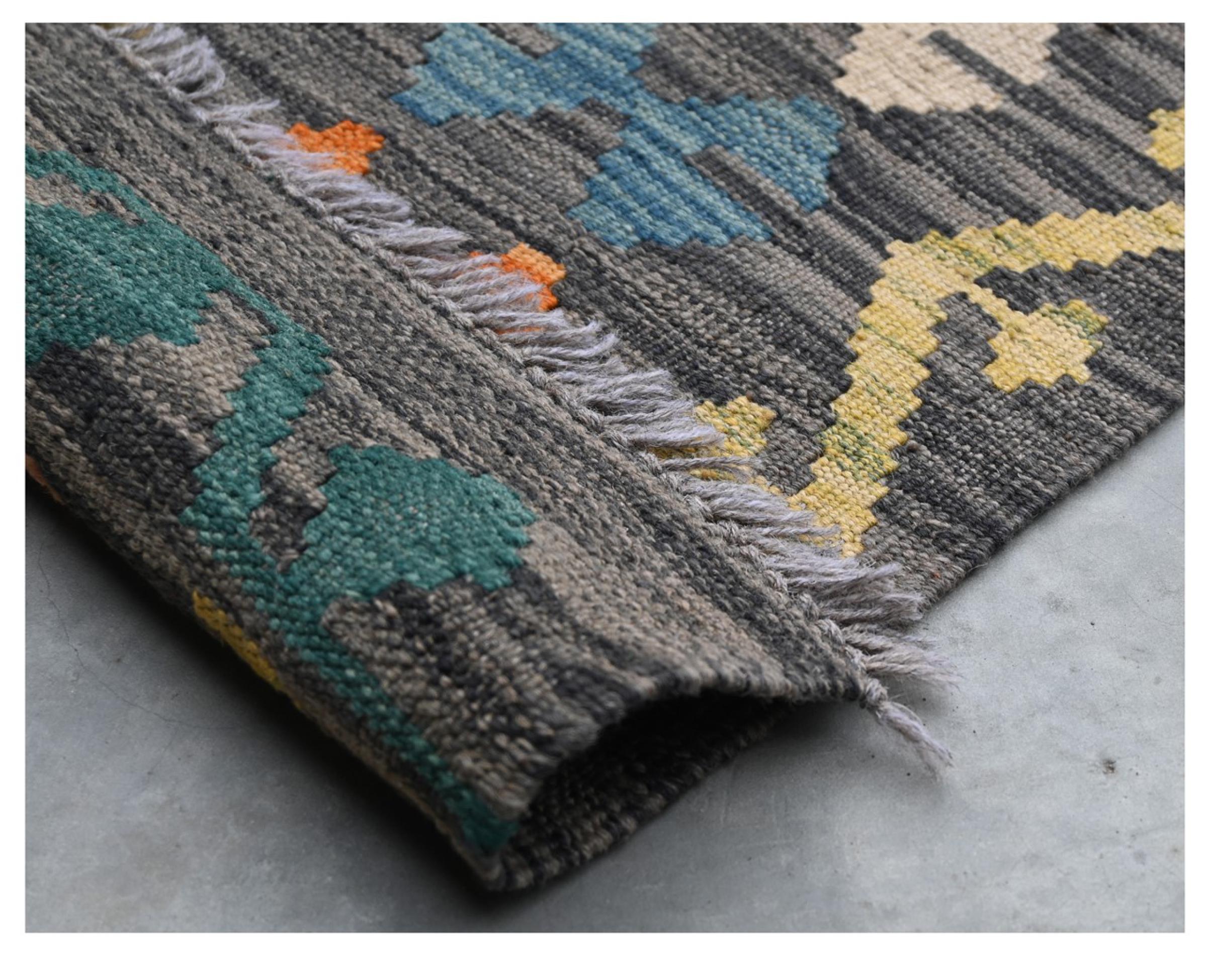 This rug was made as a flat weave by hand on a loom. Flatweave is the term used to describe rugs that have no pile. As the name promises, these rugs are woven and not knotted. This results in a flat rug with a structured surface. Flatweaves are not as soft and usually thinner than knotted rugs. At the same time they are much less complex to manufacture and can usually be laid out from both sides (front and back). Their patterns are usually geometric, which is determined by the fabric.