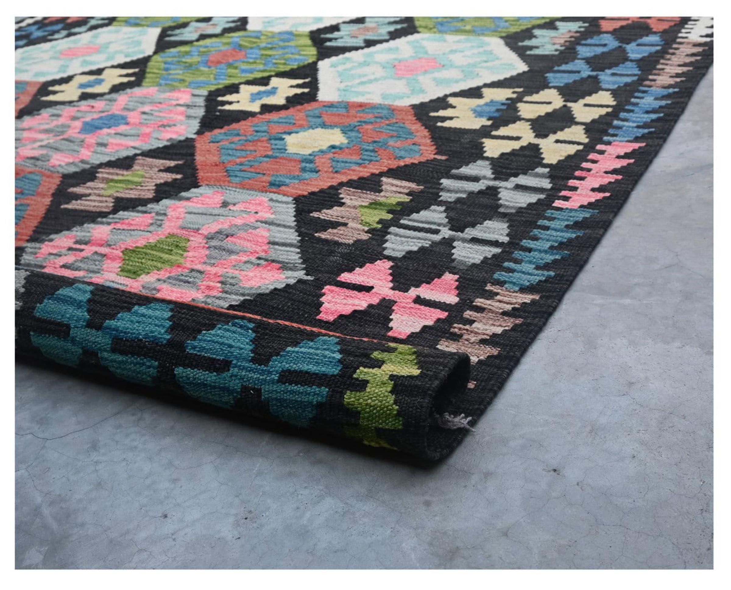 These Kilim rugs have a significant difference from hand-knotted rugs—they are handwoven. As a result, they do not have a high pile of wool and are often flatter and rougher than knotted wool rugs. Their construction is less intricate, making them generally much more affordable. Additionally, Kilim rugs are much lighter and can be laid out on either side. Handwoven Kilims originally come from what was once Persia and are now also widely produced in Afghanistan. They typically feature simple, straight-line patterns, which are characteristic of their weaving technique.