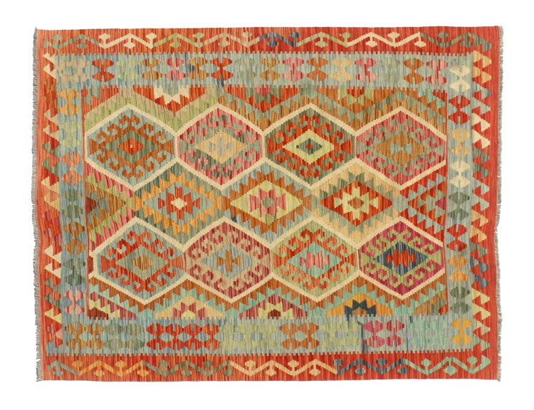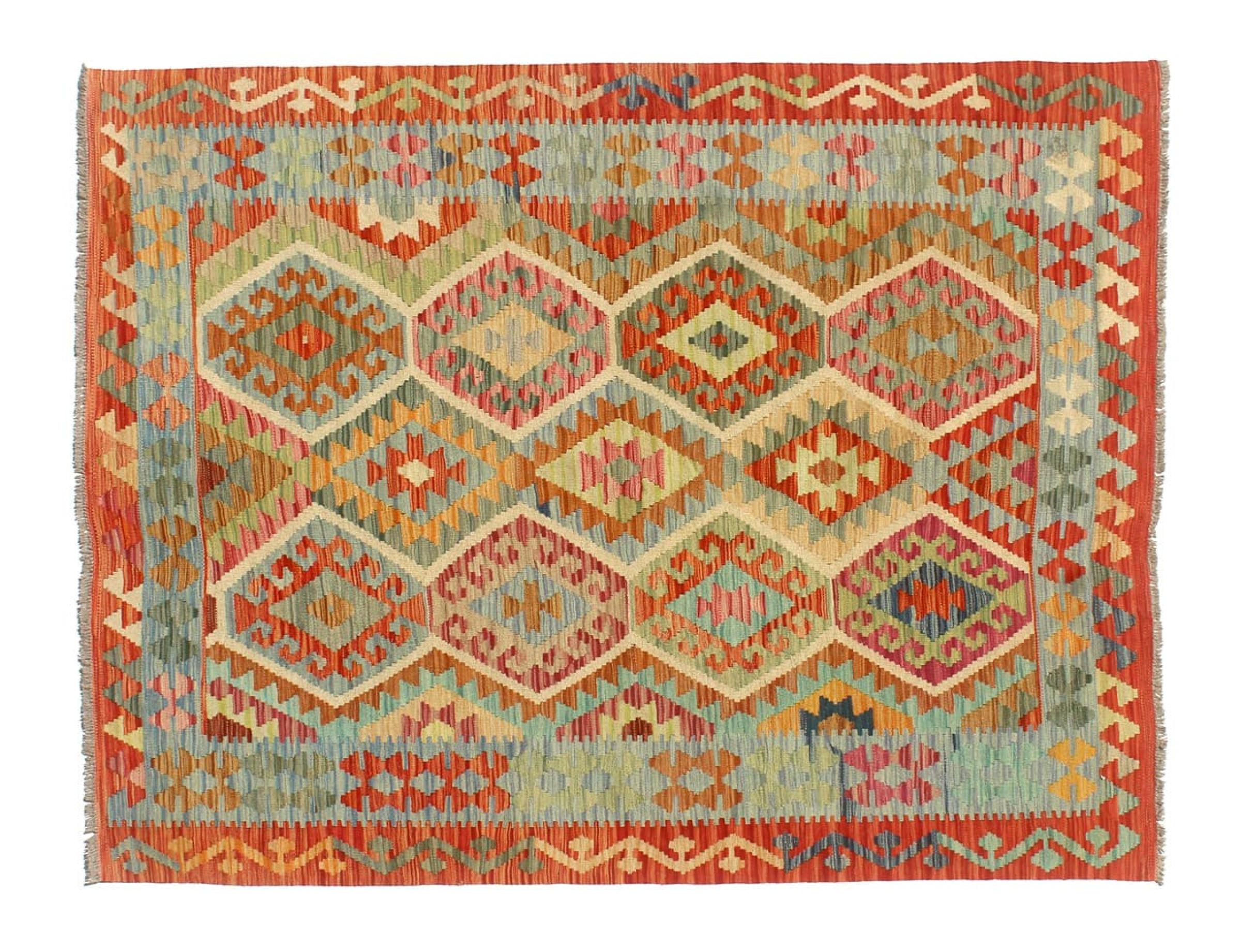 This Kilim Afghan rug has beautiful colors. It is handmade from fine wool. These patterns are traditional design elements that have already been used centuries ago. This particular kilim has been woven by hand in Afghanistan, a country with a long history in weaving and knotting rugs. The rug is robust and can be laid out on both sides.