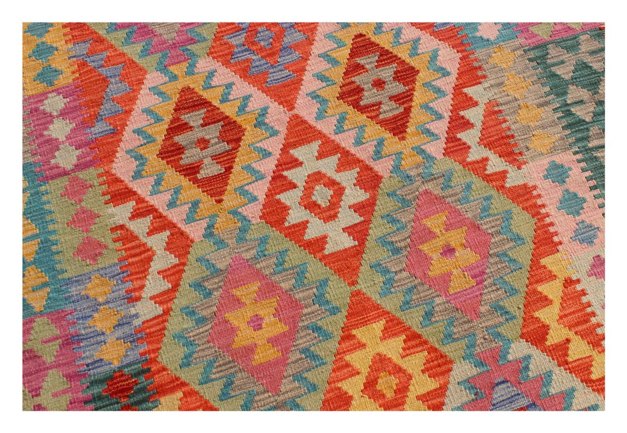 This Kilim Afghan rug has beautiful colors. It is handmade from fine wool. These patterns are traditional design elements that have already been used centuries ago. This particular kilim has been woven by hand in Afghanistan, a country with a long history in weaving and knotting rugs. The rug is robust and can be laid out on both sides.