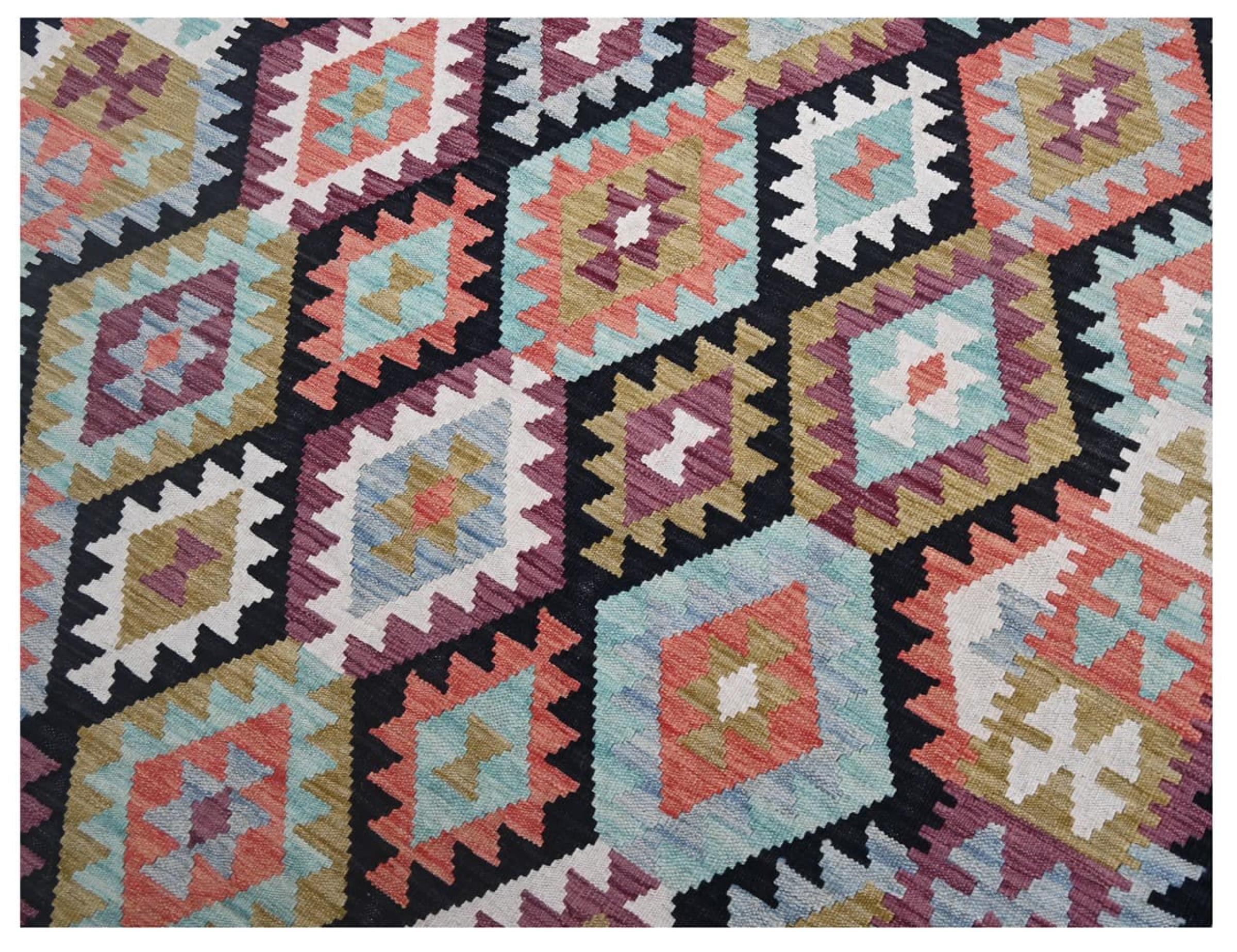 These Kilim rugs have a significant difference from hand-knotted rugs—they are handwoven. As a result, they do not have a high pile of wool and are often flatter and rougher than knotted wool rugs. Their construction is less intricate, making them generally much more affordable. Additionally, Kilim rugs are much lighter and can be laid out on either side. Handwoven Kilims originally come from what was once Persia and are now also widely produced in Afghanistan. They typically feature simple, straight-line patterns, which are characteristic of their weaving technique.