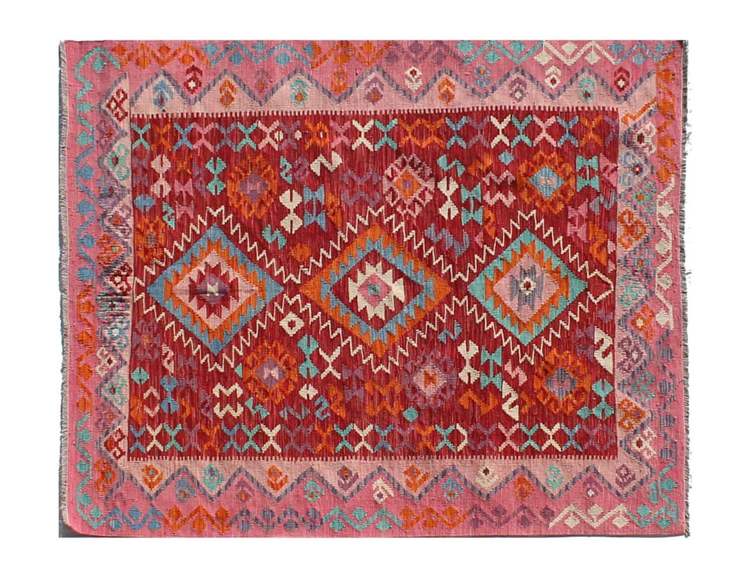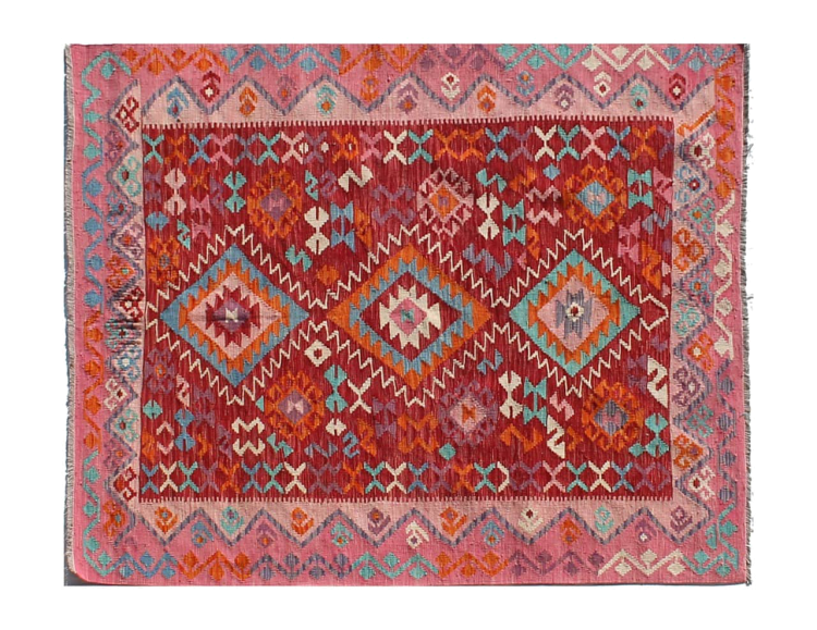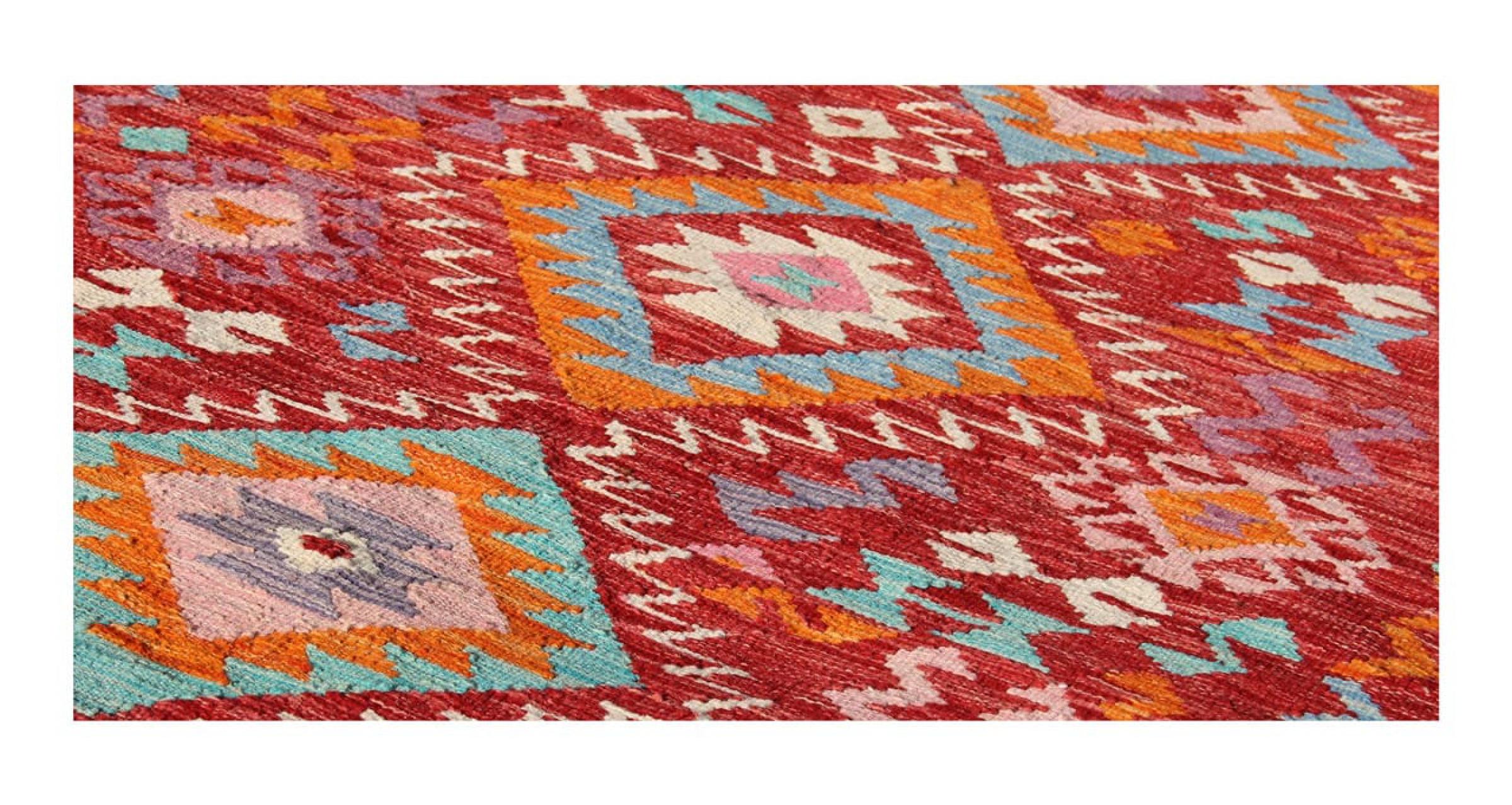 These Kilim rugs have a significant difference from hand-knotted rugs—they are handwoven. As a result, they do not have a high pile of wool and are often flatter and rougher than knotted wool rugs. Their construction is less intricate, making them generally much more affordable. Additionally, Kilim rugs are much lighter and can be laid out on either side. Handwoven Kilims originally come from what was once Persia and are now also widely produced in Afghanistan. They typically feature simple, straight-line patterns, which are characteristic of their weaving technique.