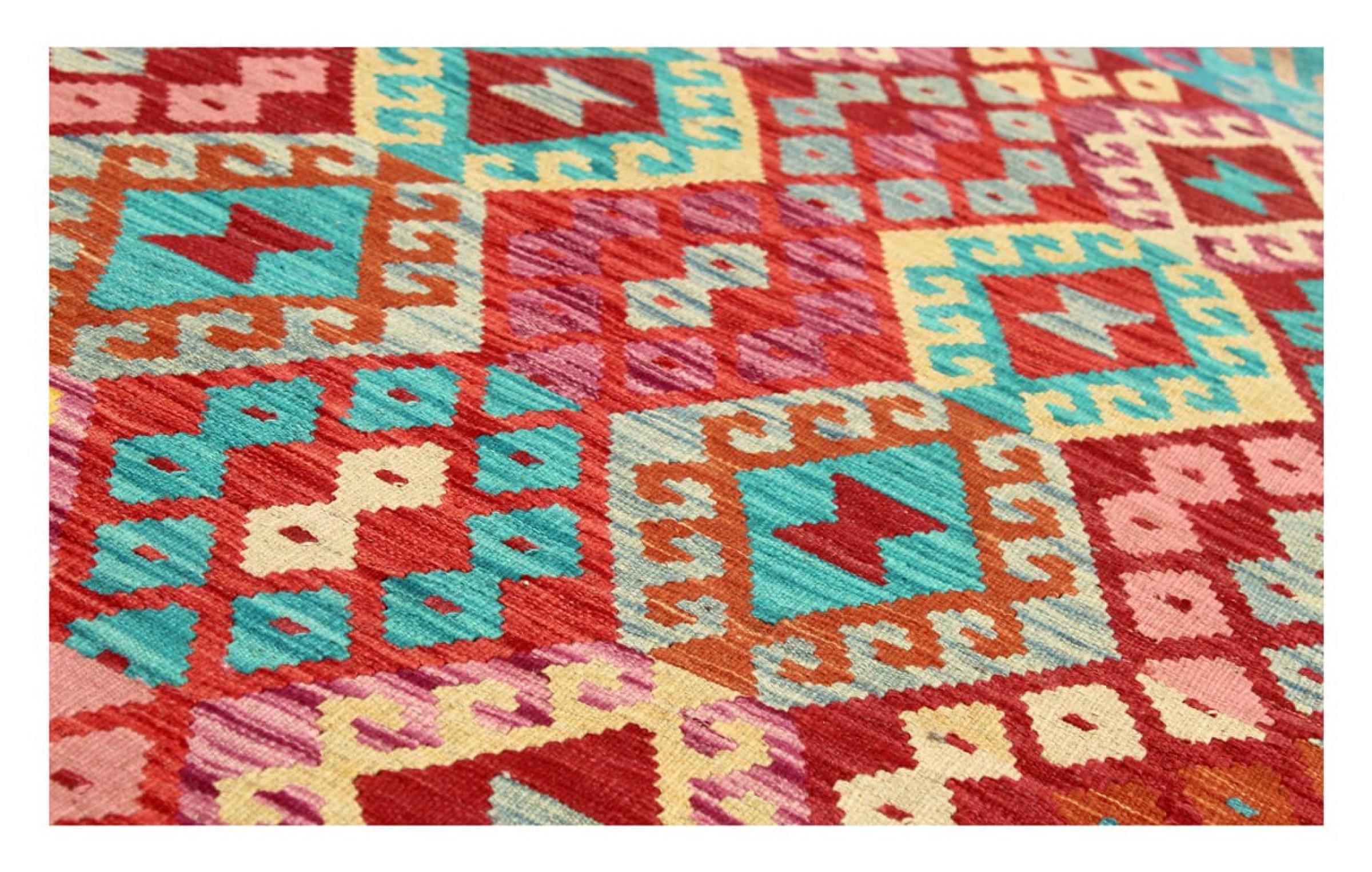 This Kilim Afghan rug has beautiful colors. It is handmade from fine wool. These patterns are traditional design elements that have already been used centuries ago. This particular kilim has been woven by hand in Afghanistan, a country with a long history in weaving and knotting rugs. The rug is robust and can be laid out on both sides.