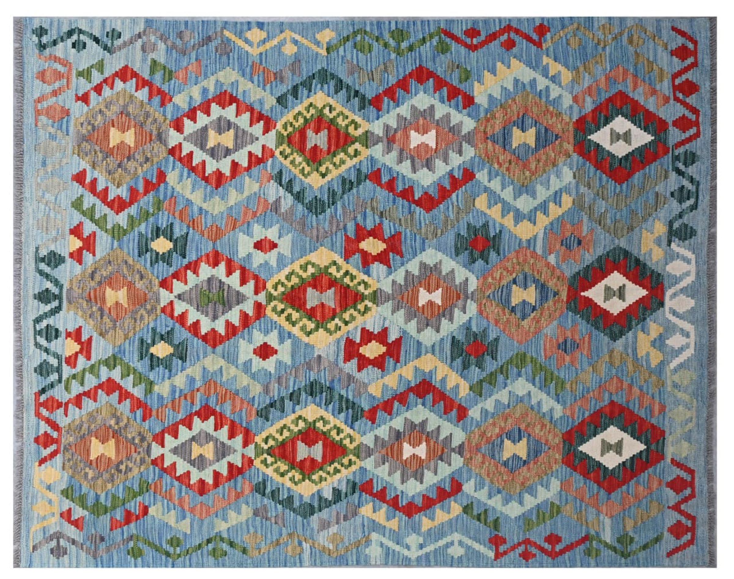 These Kilim rugs have a significant difference from hand-knotted rugs—they are handwoven. As a result, they do not have a high pile of wool and are often flatter and rougher than knotted wool rugs. Their construction is less intricate, making them generally much more affordable. Additionally, Kilim rugs are much lighter and can be laid out on either side. Handwoven Kilims originally come from what was once Persia and are now also widely produced in Afghanistan. They typically feature simple, straight-line patterns, which are characteristic of their weaving technique.