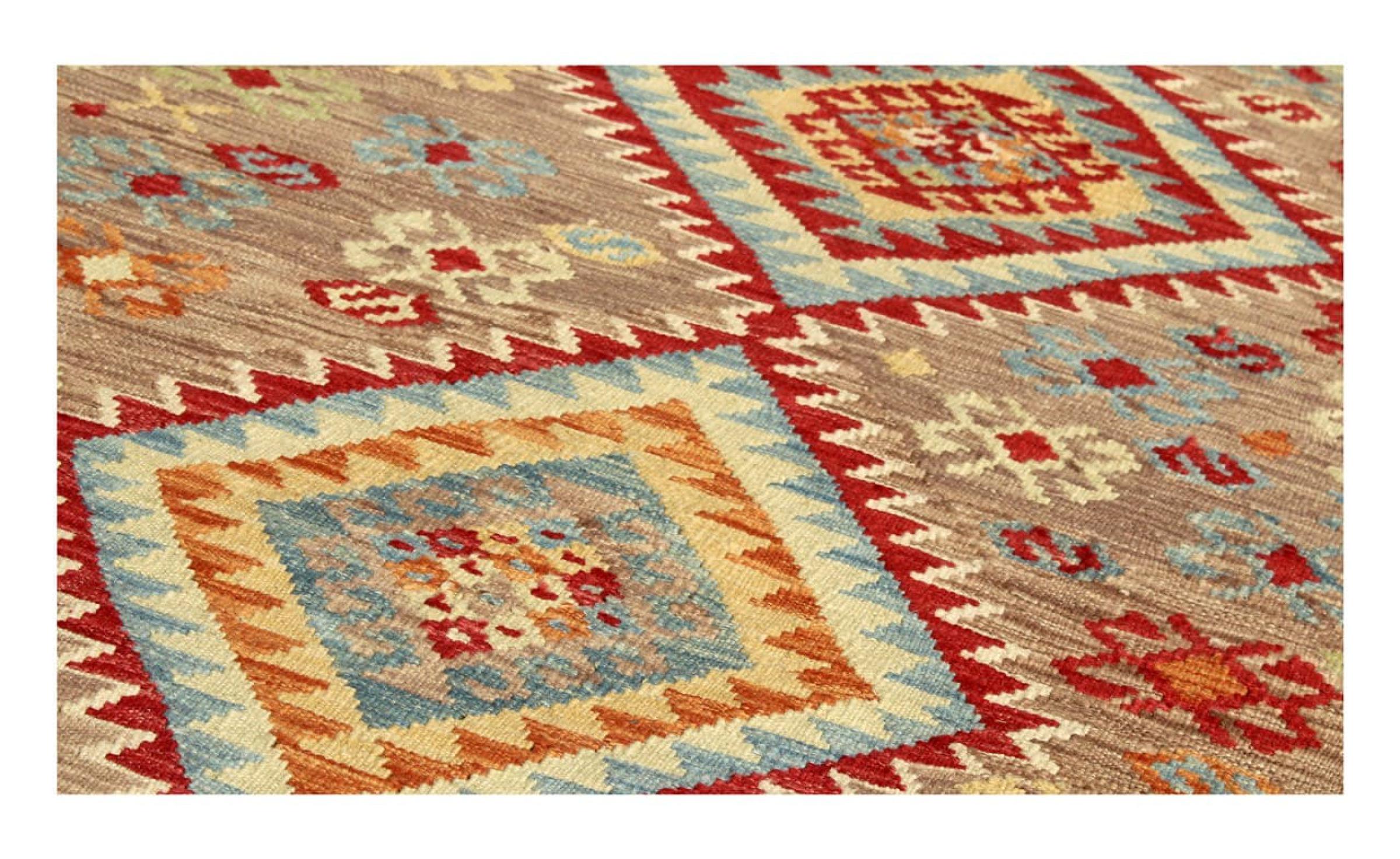 This Kilim Afghan rug has beautiful colors. It is handmade from fine wool. These patterns are traditional design elements that have already been used centuries ago. This particular kilim has been woven by hand in Afghanistan, a country with a long history in weaving and knotting rugs. The rug is robust and can be laid out on both sides.