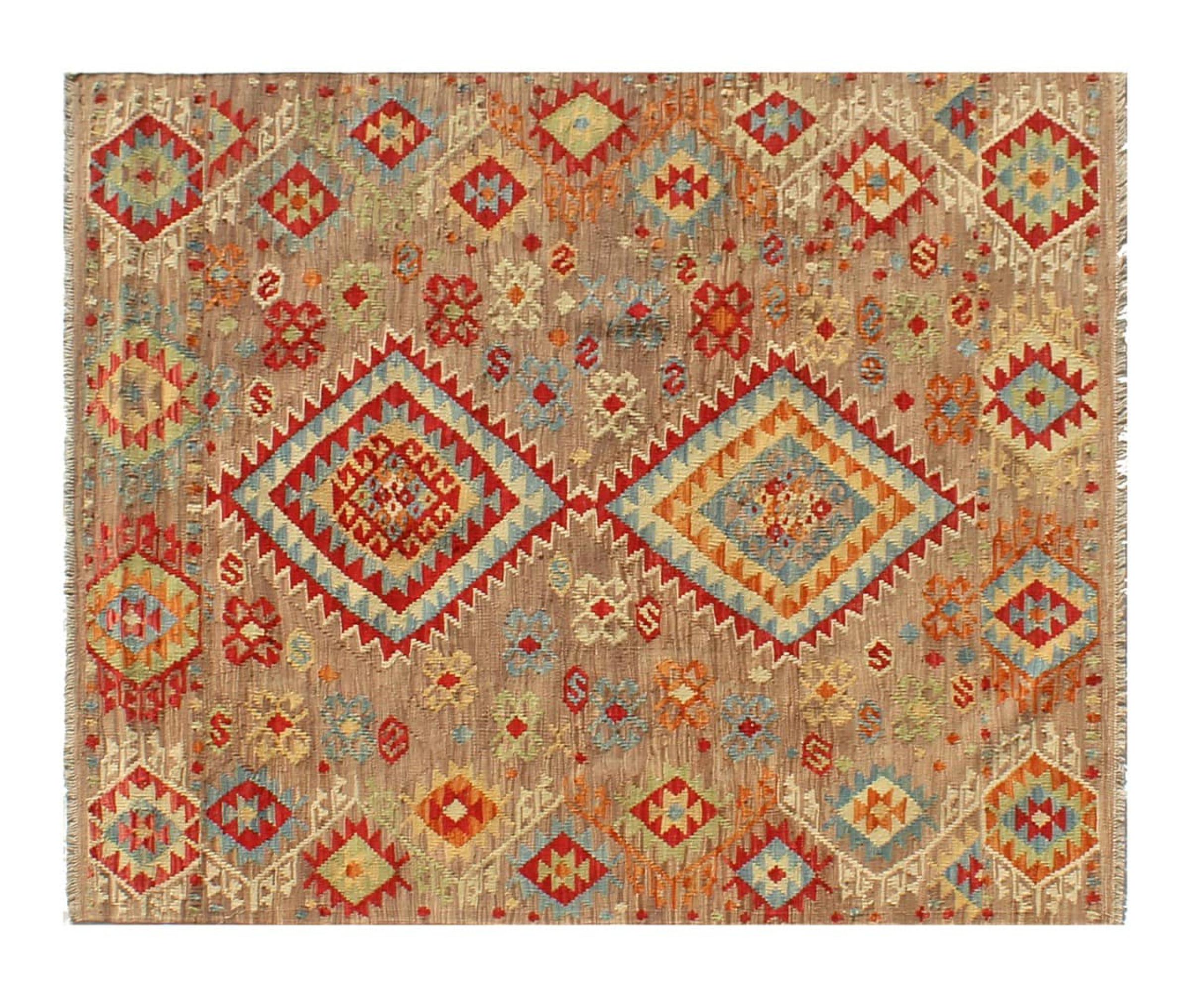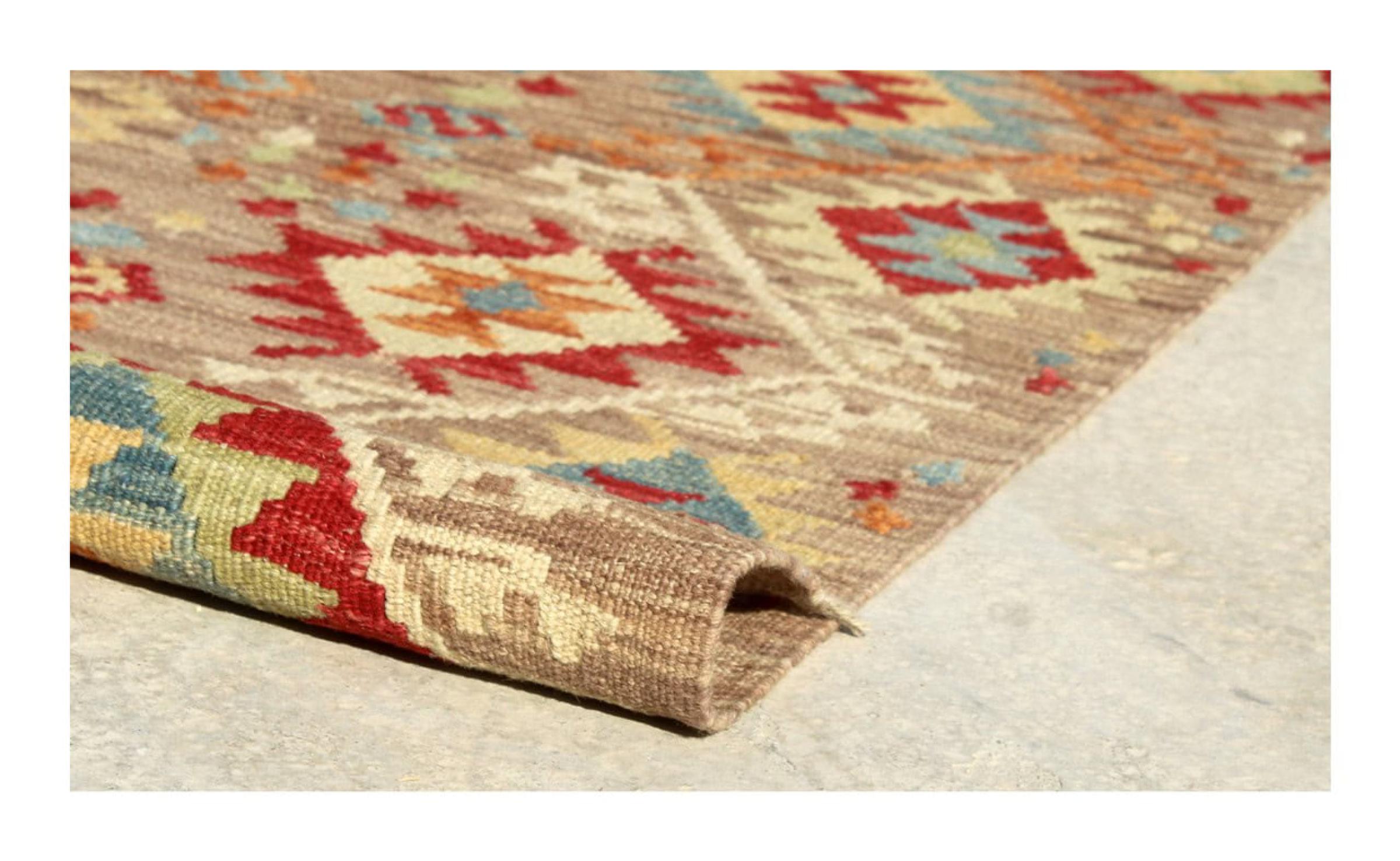 These Kilim rugs have a significant difference from hand-knotted rugs—they are handwoven. As a result, they do not have a high pile of wool and are often flatter and rougher than knotted wool rugs. Their construction is less intricate, making them generally much more affordable. Additionally, Kilim rugs are much lighter and can be laid out on either side. Handwoven Kilims originally come from what was once Persia and are now also widely produced in Afghanistan. They typically feature simple, straight-line patterns, which are characteristic of their weaving technique.
