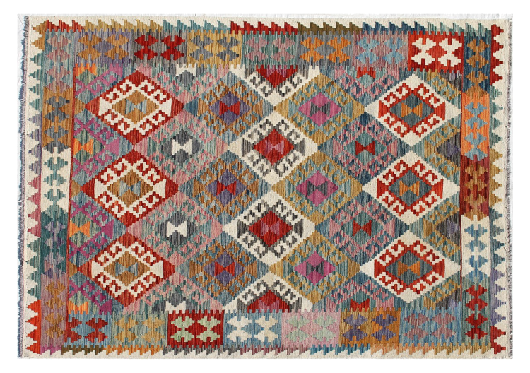 These Kilim rugs have a significant difference from hand-knotted rugs—they are handwoven. As a result, they do not have a high pile of wool and are often flatter and rougher than knotted wool rugs. Their construction is less intricate, making them generally much more affordable. Additionally, Kilim rugs are much lighter and can be laid out on either side. Handwoven Kilims originally come from what was once Persia and are now also widely produced in Afghanistan. They typically feature simple, straight-line patterns, which are characteristic of their weaving technique.