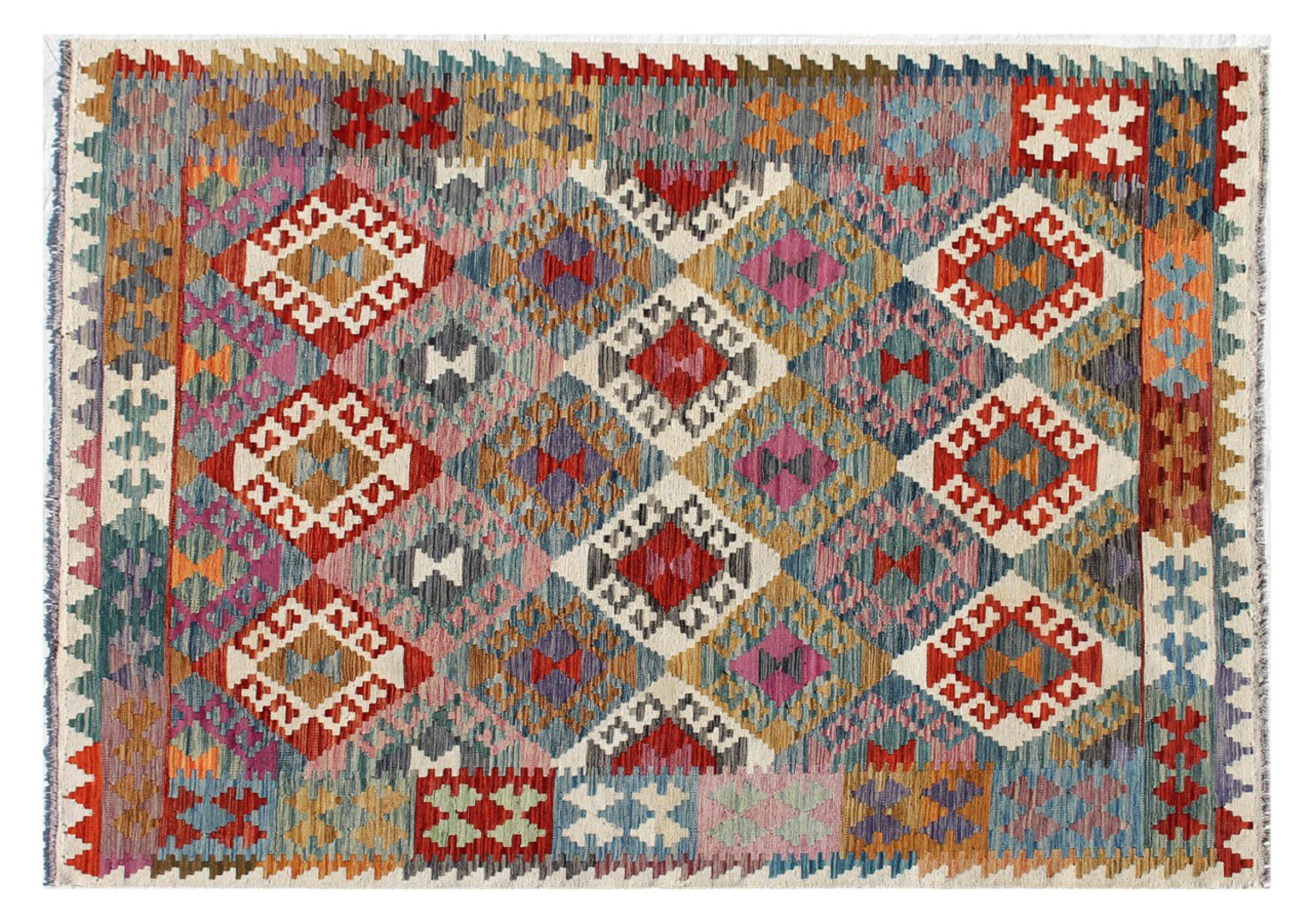This Kilim Afghan rug has beautiful colors. It is handmade from fine wool. These patterns are traditional design elements that have already been used centuries ago. This particular kilim has been woven by hand in Afghanistan, a country with a long history in weaving and knotting rugs. The rug is robust and can be laid out on both sides.