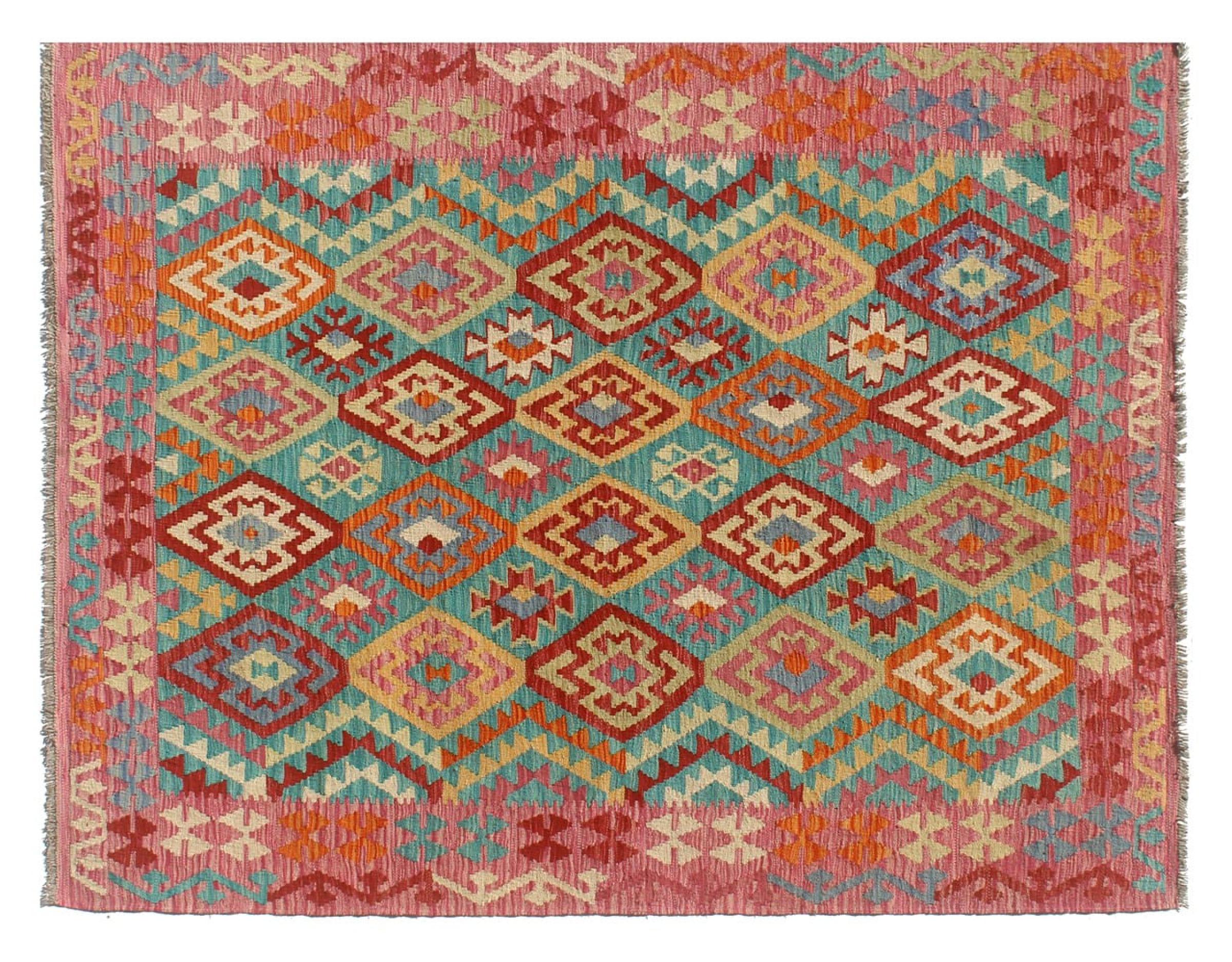 This Kilim Afghan rug has beautiful colors. It is handmade from fine wool. These patterns are traditional design elements that have already been used centuries ago. This particular kilim has been woven by hand in Afghanistan, a country with a long history in weaving and knotting rugs. The rug is robust and can be laid out on both sides.