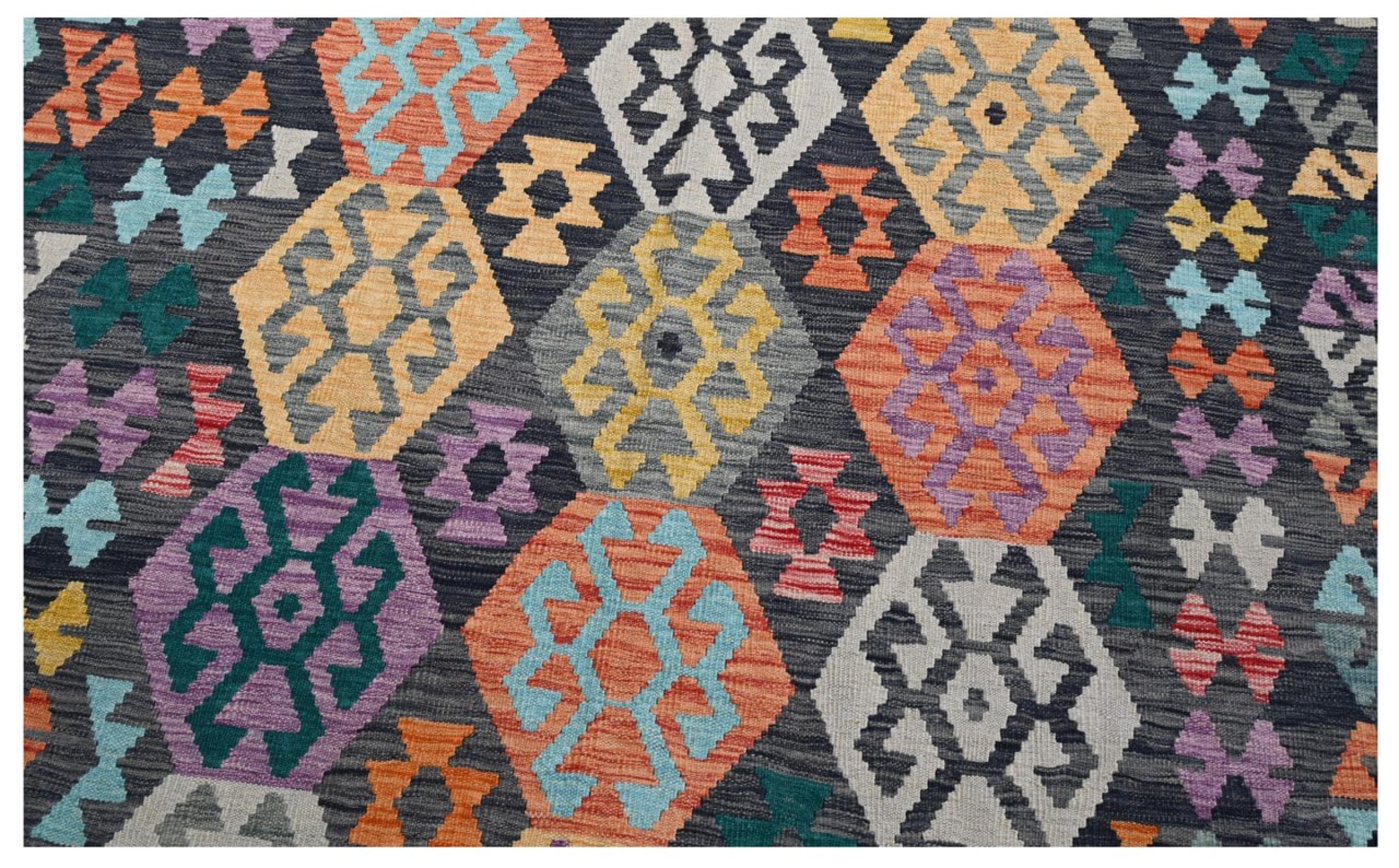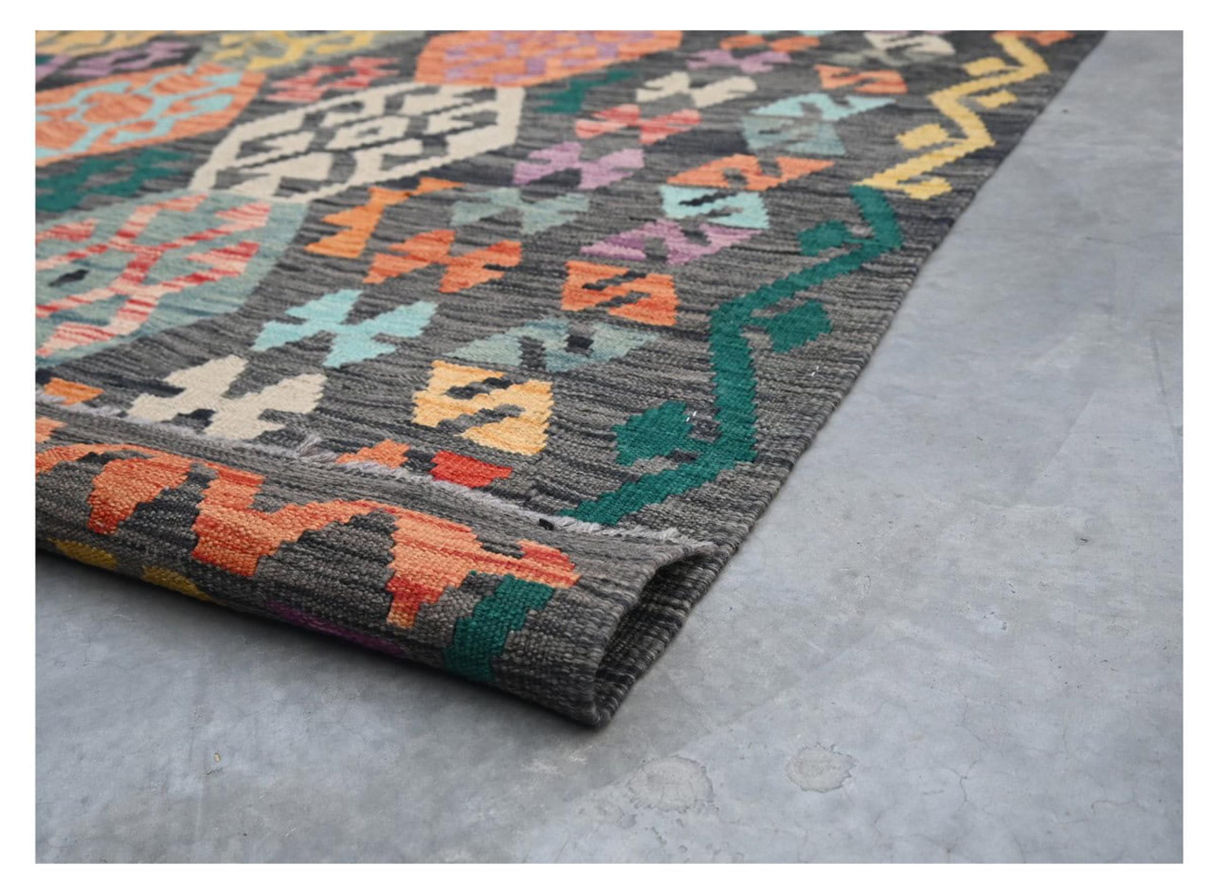 This Kilim Afghan rug has beautiful colors. It is handmade from fine wool. These patterns are traditional design elements that have already been used centuries ago. This particular kilim has been woven by hand in Afghanistan, a country with a long history in weaving and knotting rugs. The rug is robust and can be laid out on both sides.