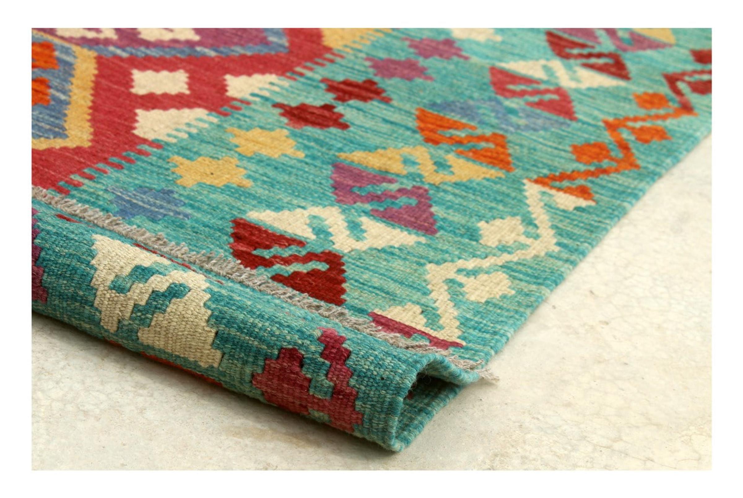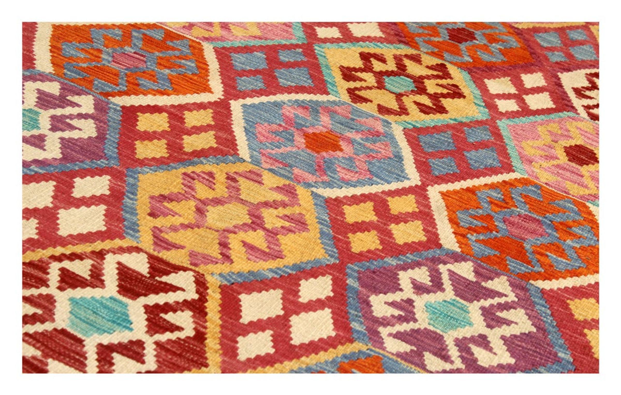 This Kilim Afghan rug has beautiful colors. It is handmade from fine wool. These patterns are traditional design elements that have already been used centuries ago. This particular kilim has been woven by hand in Afghanistan, a country with a long history in weaving and knotting rugs. The rug is robust and can be laid out on both sides.