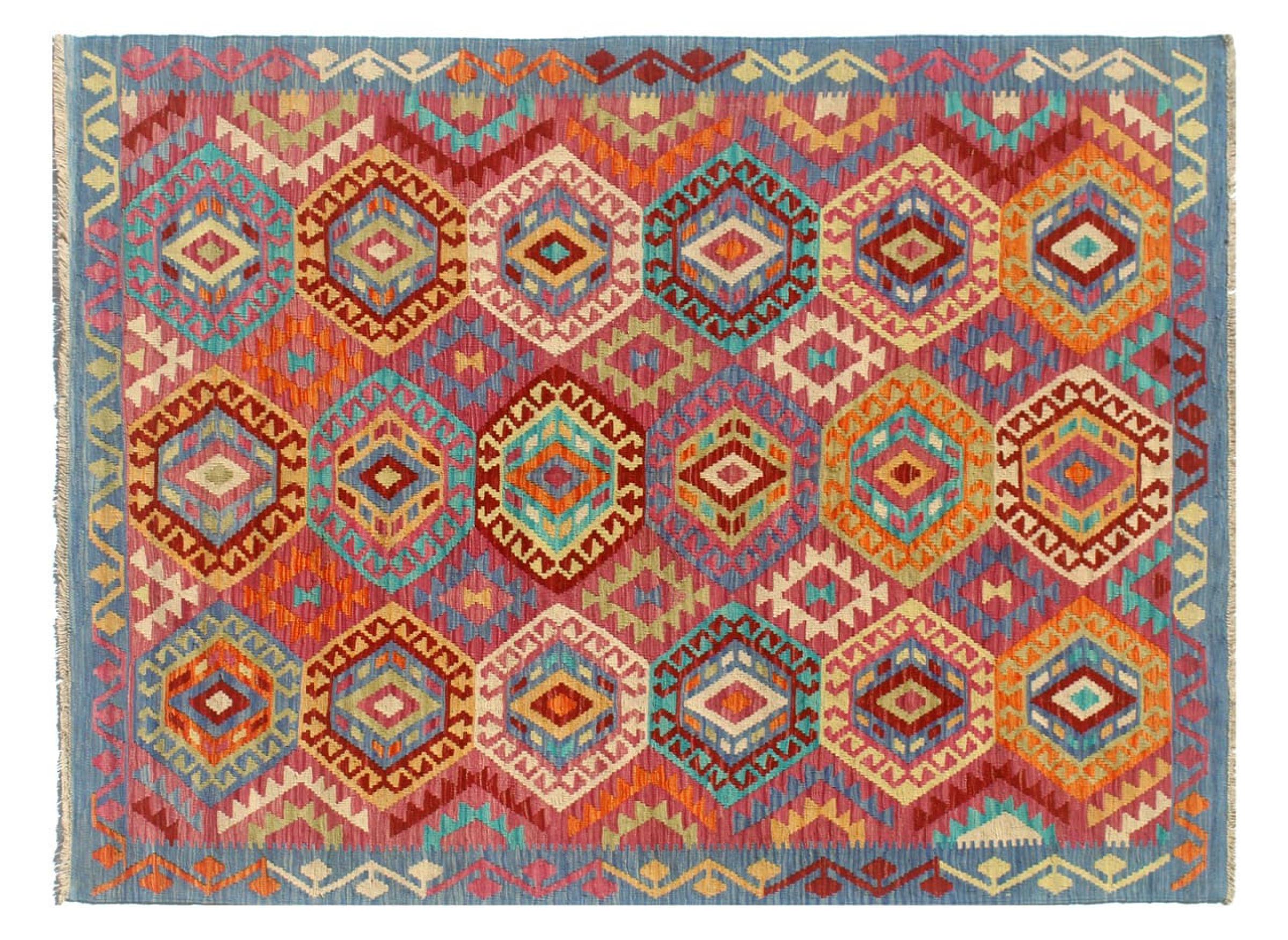 These Kilim rugs have a significant difference from hand-knotted rugs—they are handwoven. As a result, they do not have a high pile of wool and are often flatter and rougher than knotted wool rugs. Their construction is less intricate, making them generally much more affordable. Additionally, Kilim rugs are much lighter and can be laid out on either side. Handwoven Kilims originally come from what was once Persia and are now also widely produced in Afghanistan. They typically feature simple, straight-line patterns, which are characteristic of their weaving technique.
