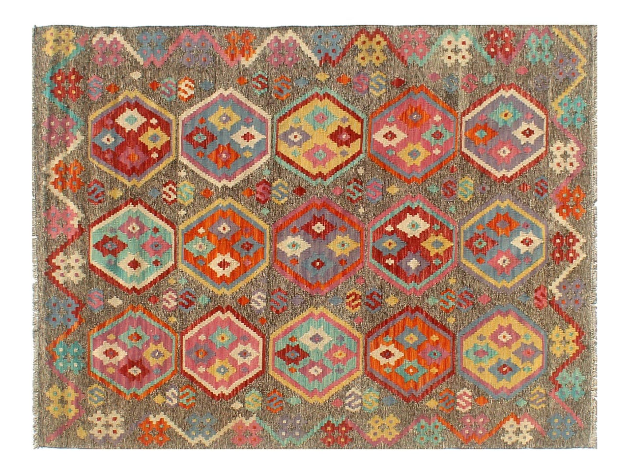 This Kilim Afghan rug has beautiful colors. It is handmade from fine wool. These patterns are traditional design elements that have already been used centuries ago. This particular kilim has been woven by hand in Afghanistan, a country with a long history in weaving and knotting rugs. The rug is robust and can be laid out on both sides.