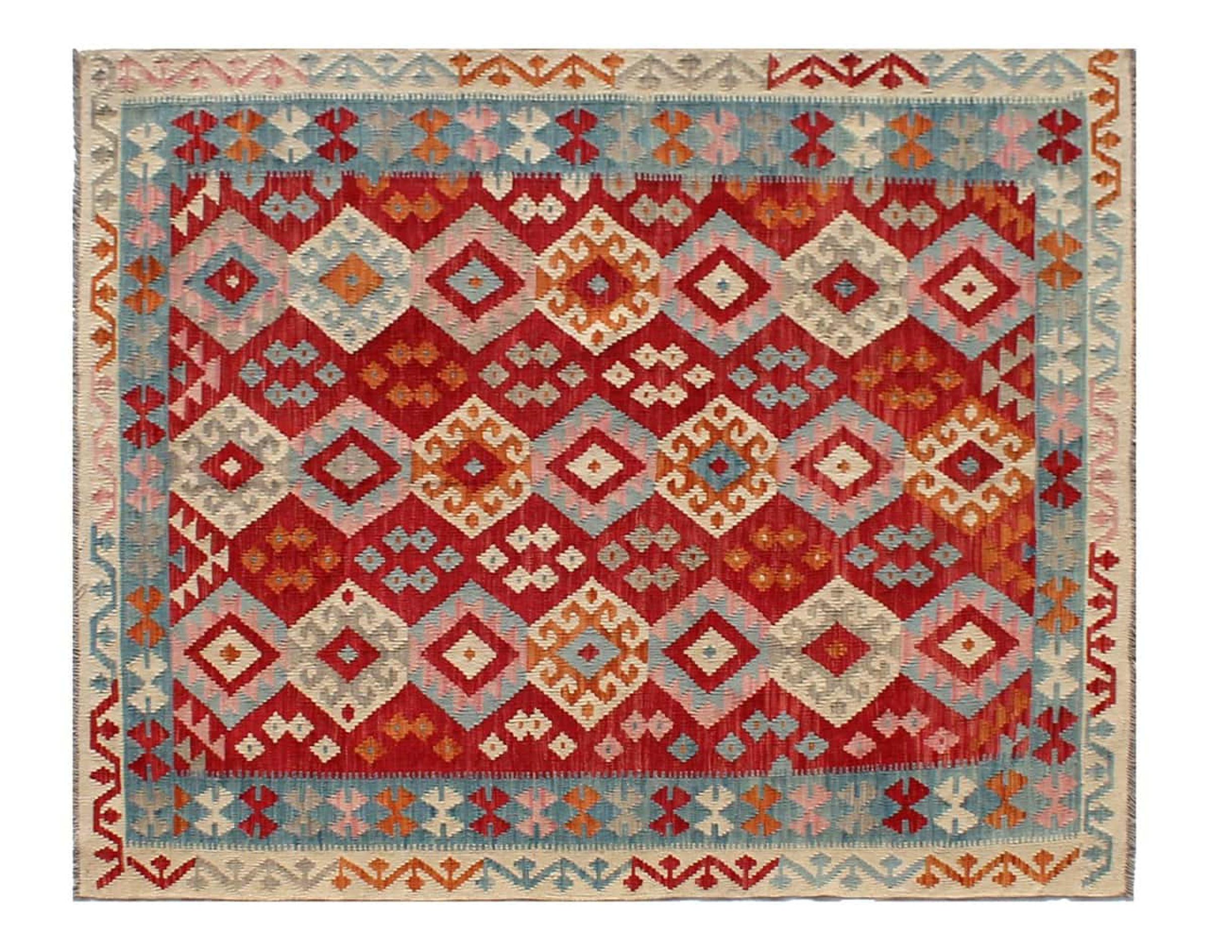 These Kilim rugs have a significant difference from hand-knotted rugs—they are handwoven. As a result, they do not have a high pile of wool and are often flatter and rougher than knotted wool rugs. Their construction is less intricate, making them generally much more affordable. Additionally, Kilim rugs are much lighter and can be laid out on either side. Handwoven Kilims originally come from what was once Persia and are now also widely produced in Afghanistan. They typically feature simple, straight-line patterns, which are characteristic of their weaving technique.