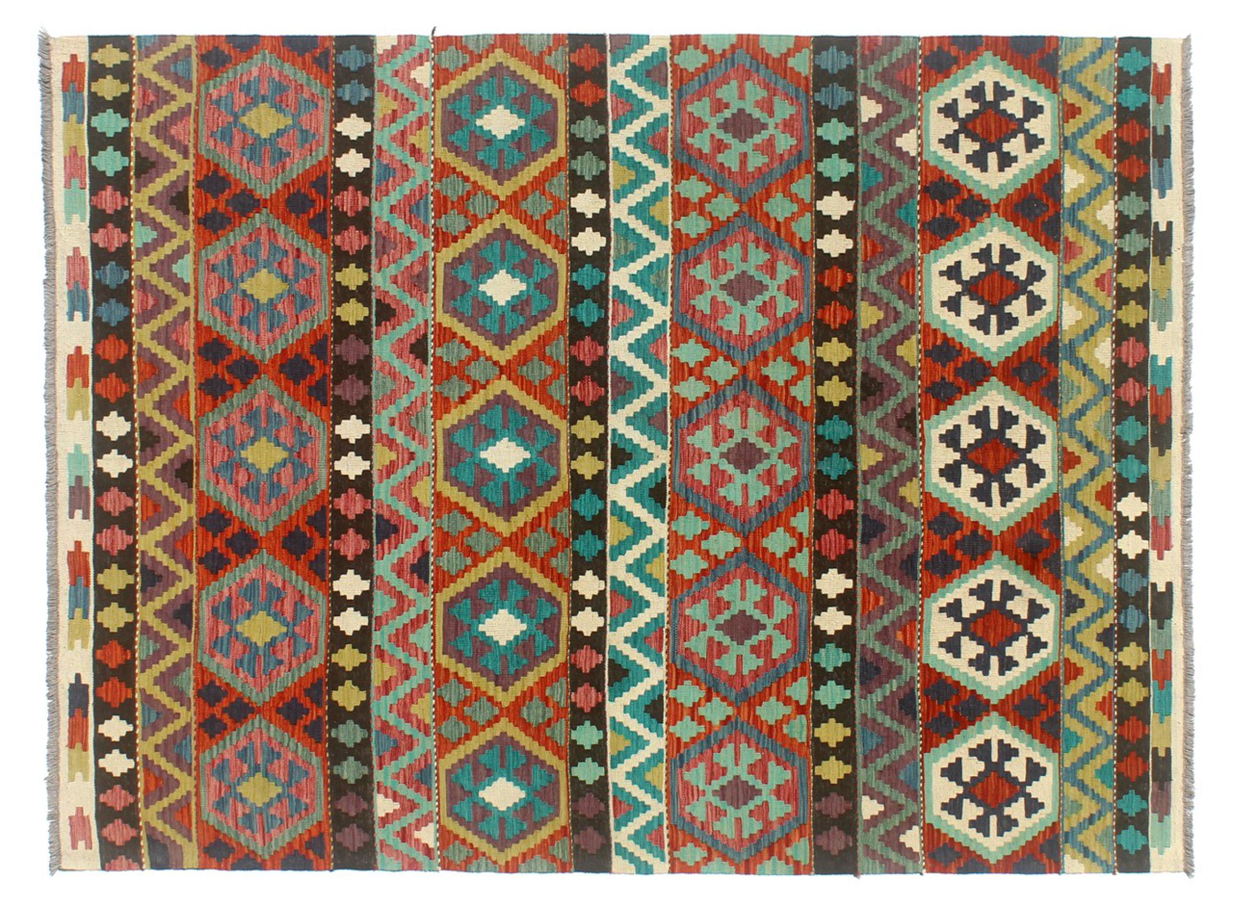 These Kilim rugs have a significant difference from hand-knotted rugs—they are handwoven. As a result, they do not have a high pile of wool and are often flatter and rougher than knotted wool rugs. Their construction is less intricate, making them generally much more affordable. Additionally, Kilim rugs are much lighter and can be laid out on either side. Handwoven Kilims originally come from what was once Persia and are now also widely produced in Afghanistan. They typically feature simple, straight-line patterns, which are characteristic of their weaving technique.
