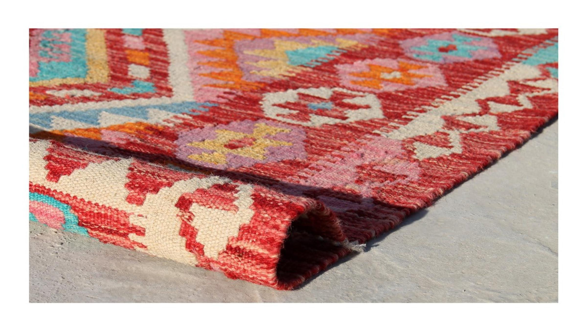 These Kilim rugs have a significant difference from hand-knotted rugs—they are handwoven. As a result, they do not have a high pile of wool and are often flatter and rougher than knotted wool rugs. Their construction is less intricate, making them generally much more affordable. Additionally, Kilim rugs are much lighter and can be laid out on either side. Handwoven Kilims originally come from what was once Persia and are now also widely produced in Afghanistan. They typically feature simple, straight-line patterns, which are characteristic of their weaving technique.