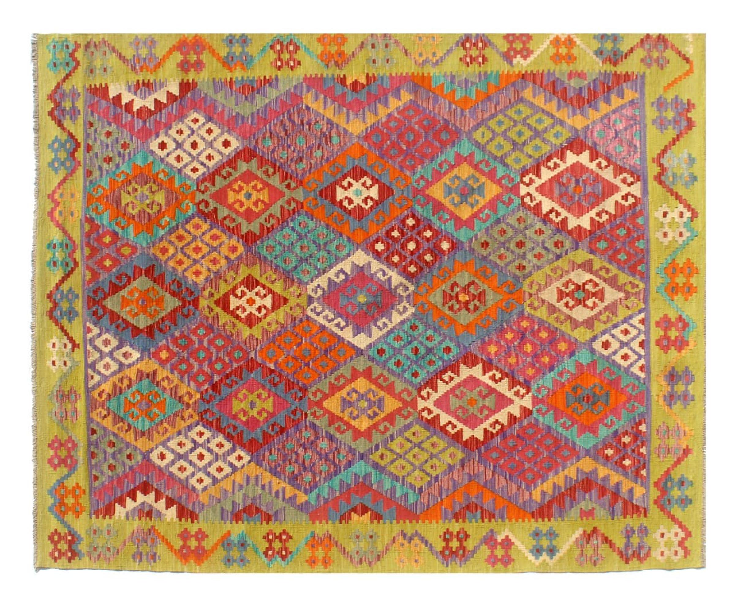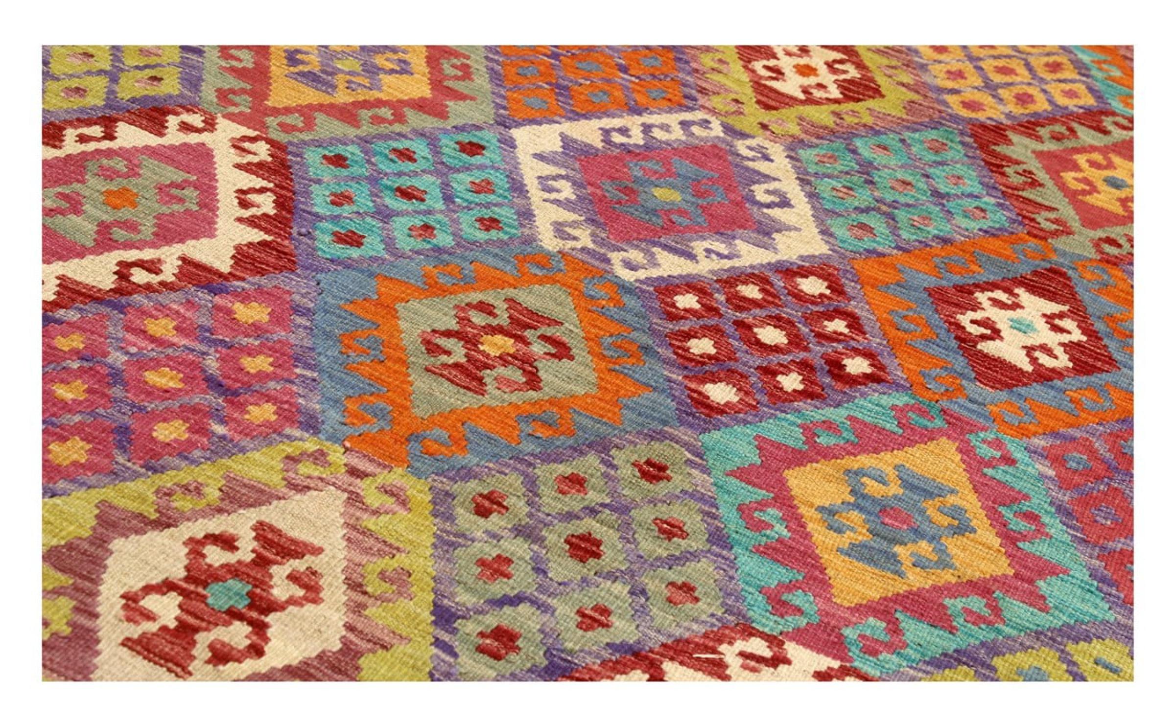 This Kilim Afghan rug has beautiful colors. It is handmade from fine wool. These patterns are traditional design elements that have already been used centuries ago. This particular kilim has been woven by hand in Afghanistan, a country with a long history in weaving and knotting rugs. The rug is robust and can be laid out on both sides.
