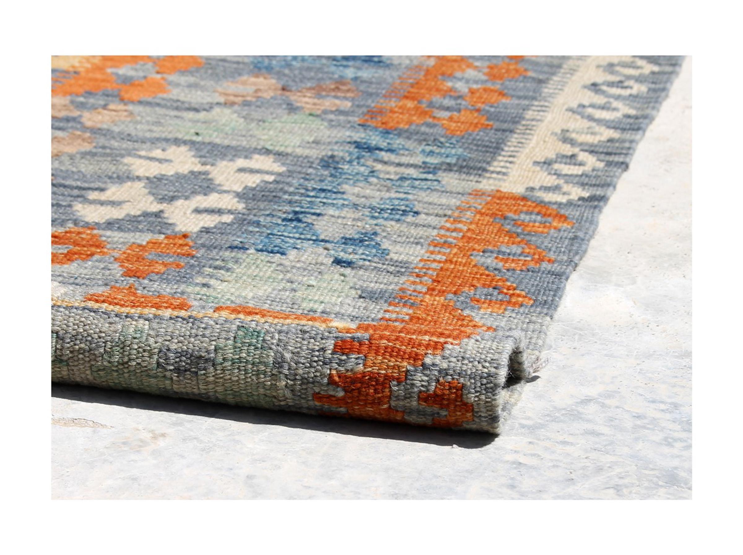 This Kilim Afghan rug has beautiful colors. It is handmade from fine wool. These patterns are traditional design elements that have already been used centuries ago. This particular kilim has been woven by hand in Afghanistan, a country with a long history in weaving and knotting rugs. The rug is robust and can be laid out on both sides.