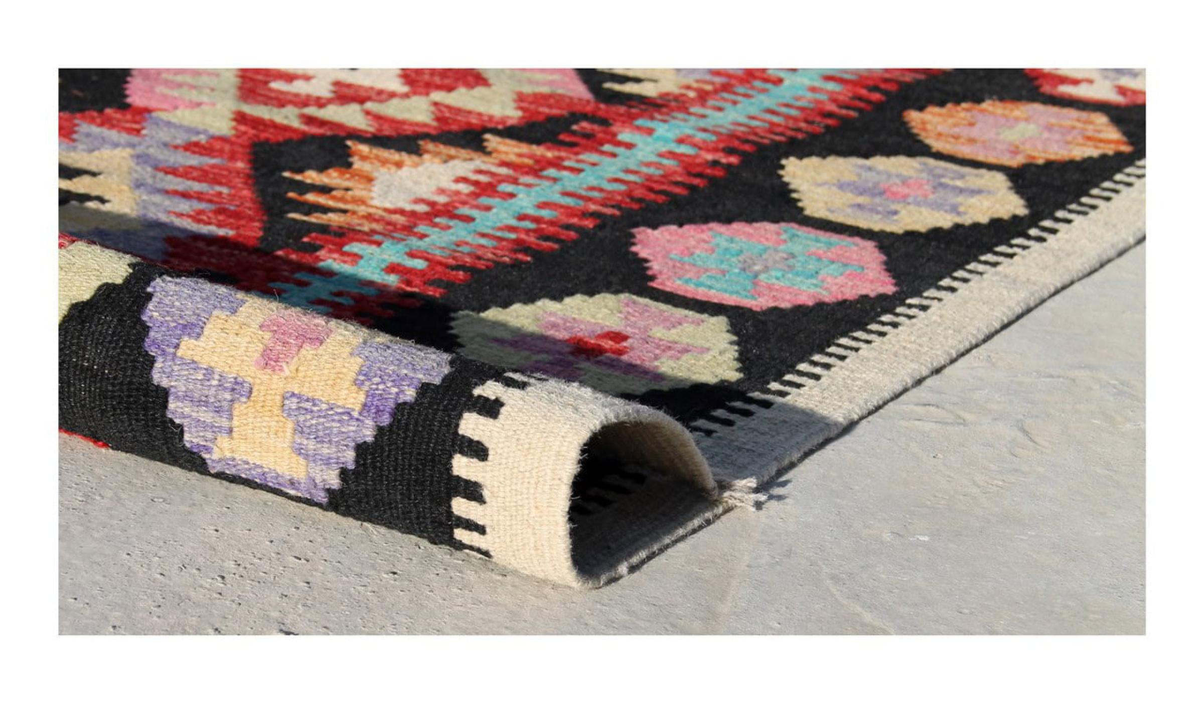 These Kilim rugs have a significant difference from hand-knotted rugs—they are handwoven. As a result, they do not have a high pile of wool and are often flatter and rougher than knotted wool rugs. Their construction is less intricate, making them generally much more affordable. Additionally, Kilim rugs are much lighter and can be laid out on either side. Handwoven Kilims originally come from what was once Persia and are now also widely produced in Afghanistan. They typically feature simple, straight-line patterns, which are characteristic of their weaving technique.