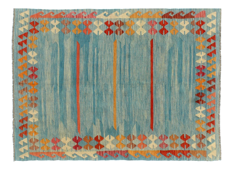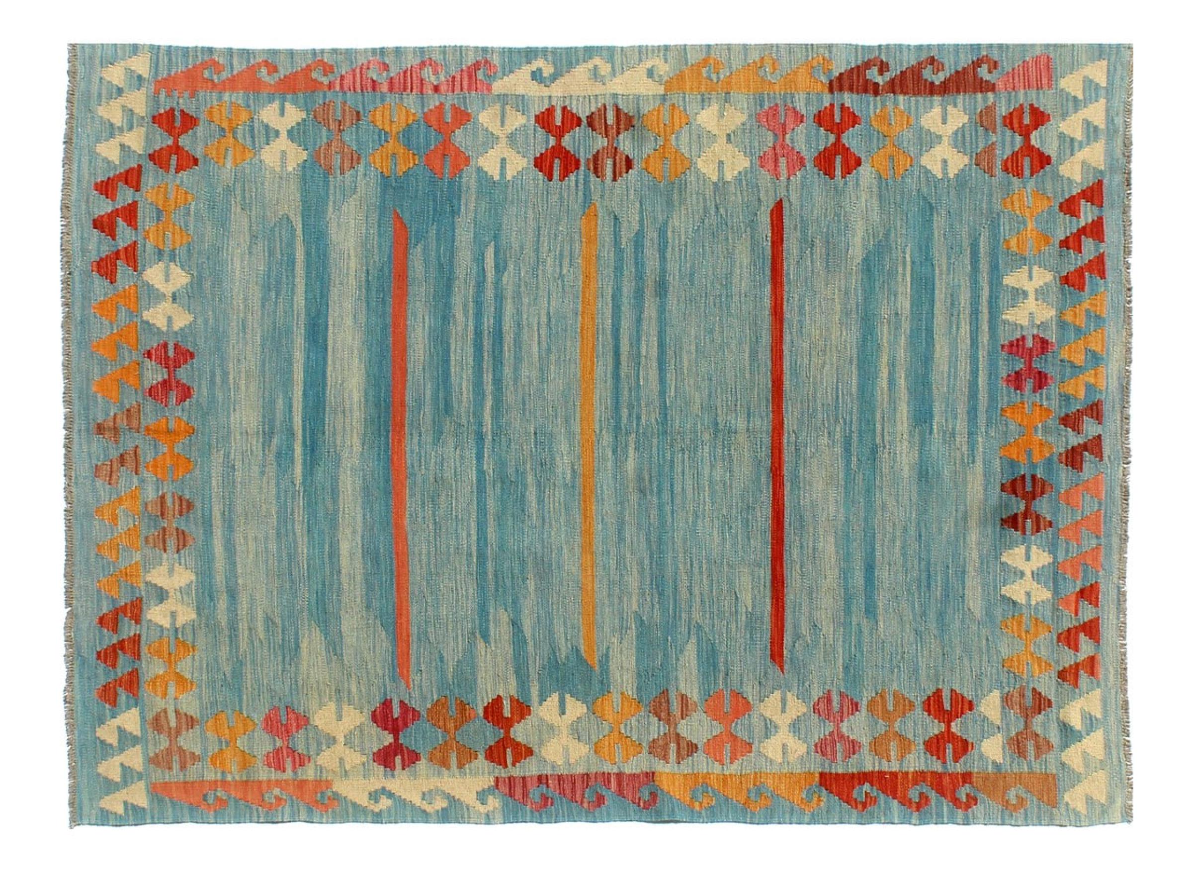 These Kilim rugs have a significant difference from hand-knotted rugs—they are handwoven. As a result, they do not have a high pile of wool and are often flatter and rougher than knotted wool rugs. Their construction is less intricate, making them generally much more affordable. Additionally, Kilim rugs are much lighter and can be laid out on either side. Handwoven Kilims originally come from what was once Persia and are now also widely produced in Afghanistan. They typically feature simple, straight-line patterns, which are characteristic of their weaving technique.