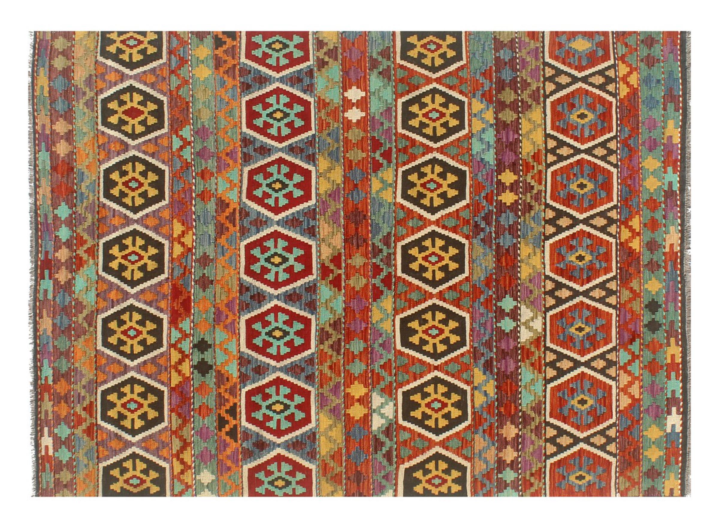This Kilim Afghan rug has beautiful colors. It is handmade from fine wool. These patterns are traditional design elements that have already been used centuries ago. This particular kilim has been woven by hand in Afghanistan, a country with a long history in weaving and knotting rugs. The rug is robust and can be laid out on both sides.